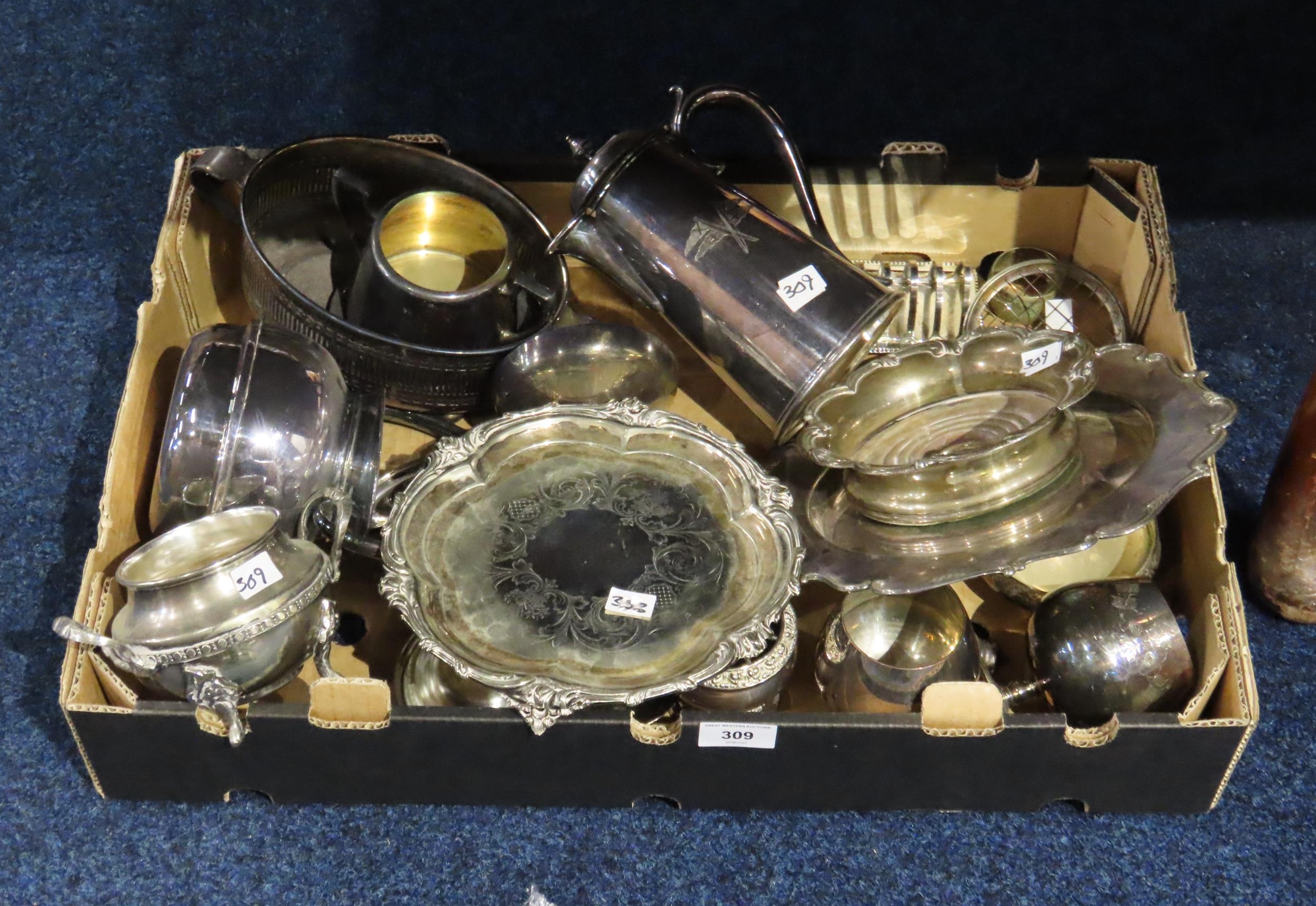 A collection of EPNS including an Old Sheffield plate bottle stand, waiters, goblets, coffee pots, teapots etc