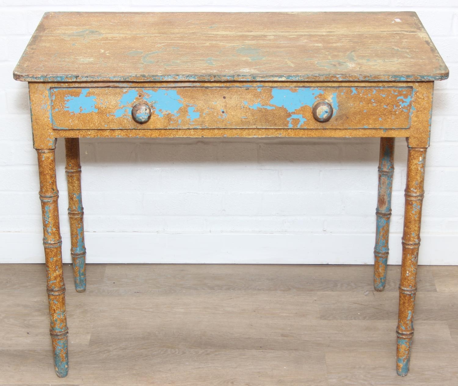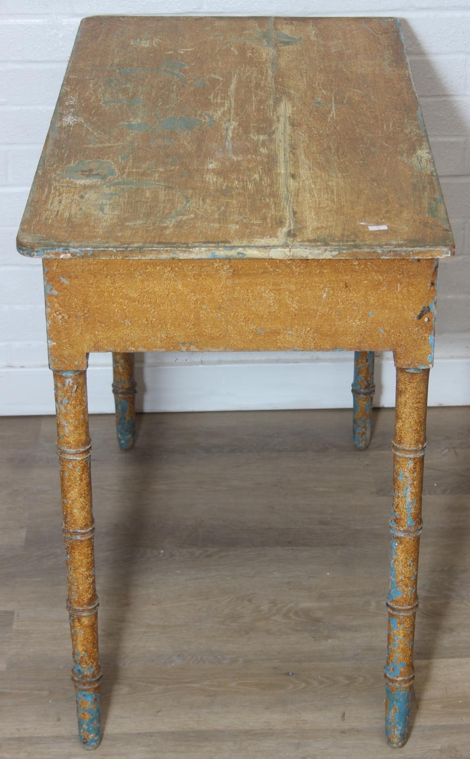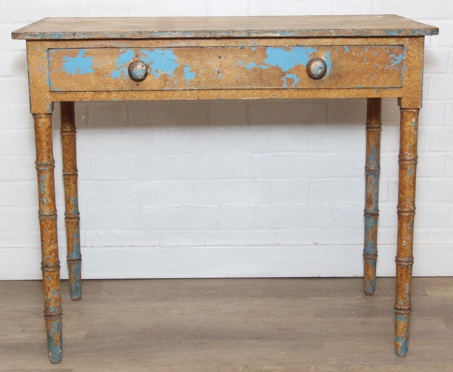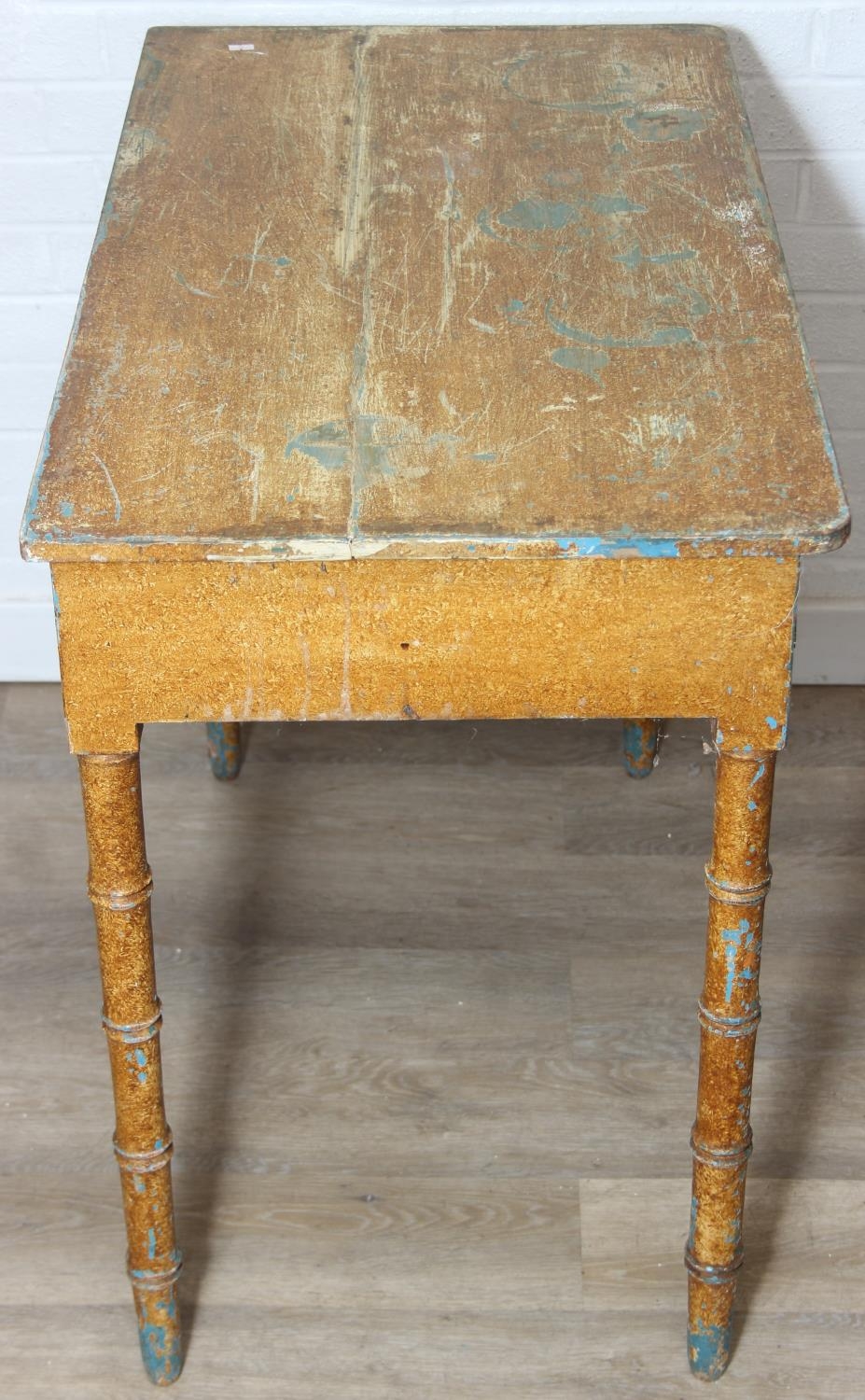 A Victorian pine side table with single drawer and distressed scumble painted finish, bamboo effect turned legs, 92cm x 51cm x 77cm