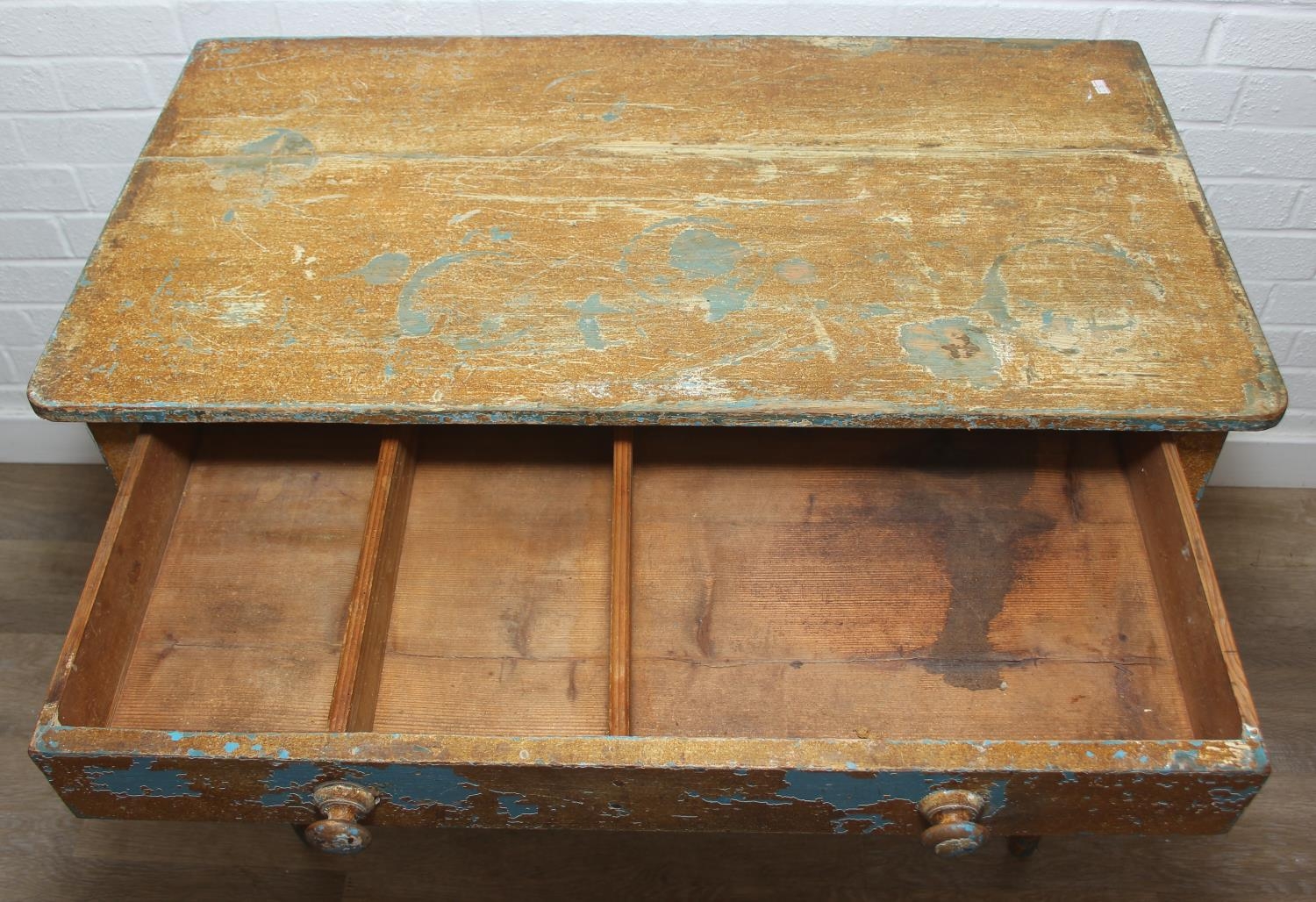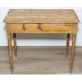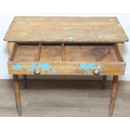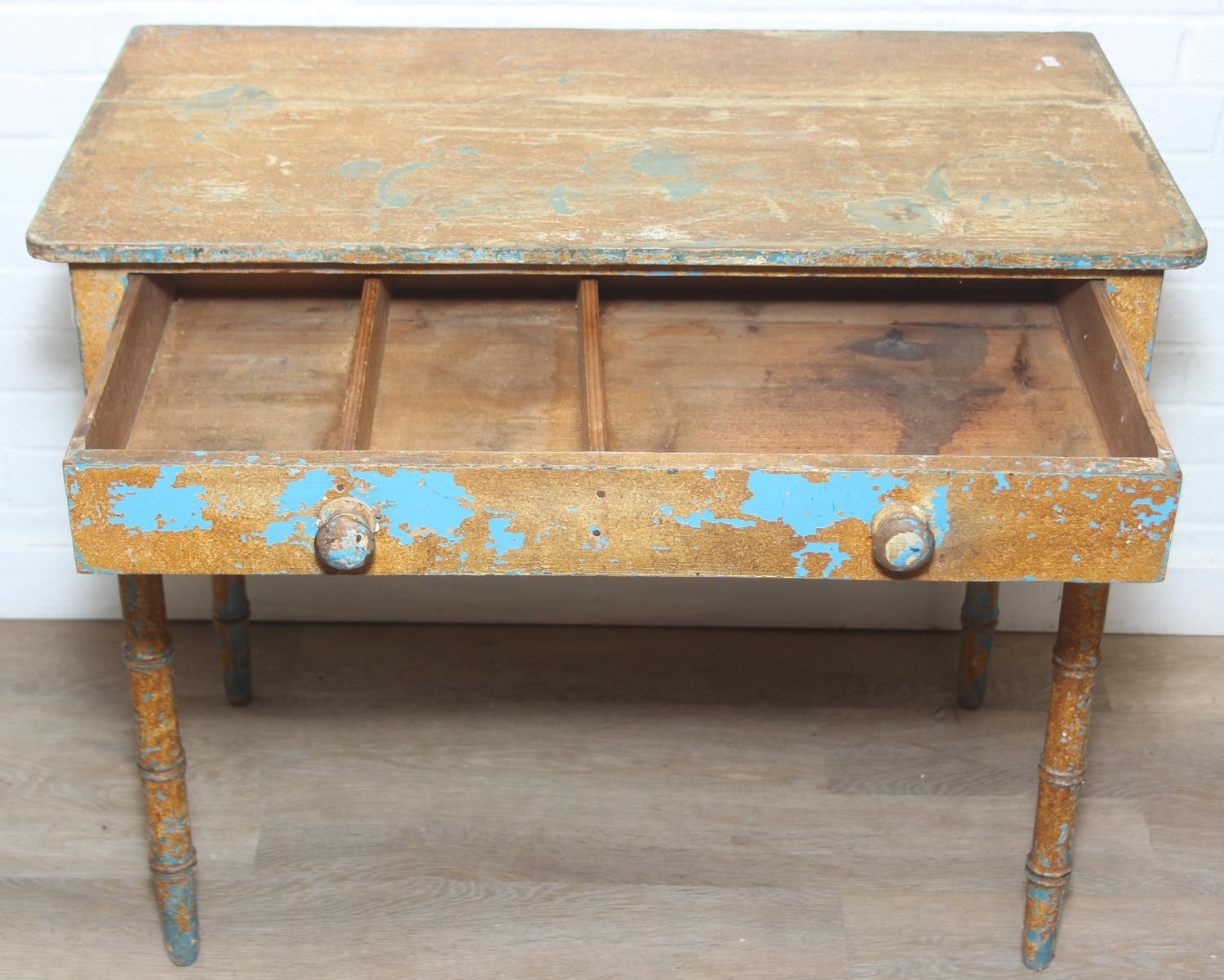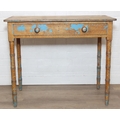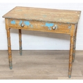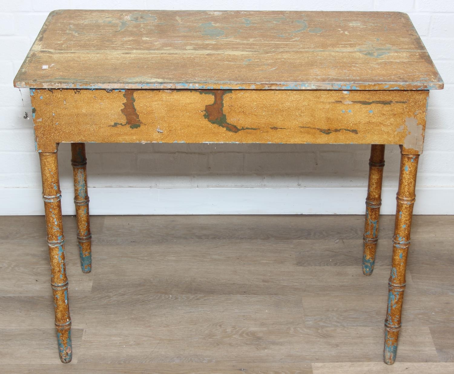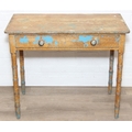 A Victorian pine side table with single drawer and distressed scumble painted finish, bamboo effect turned legs, 92cm x 51cm x 77cm