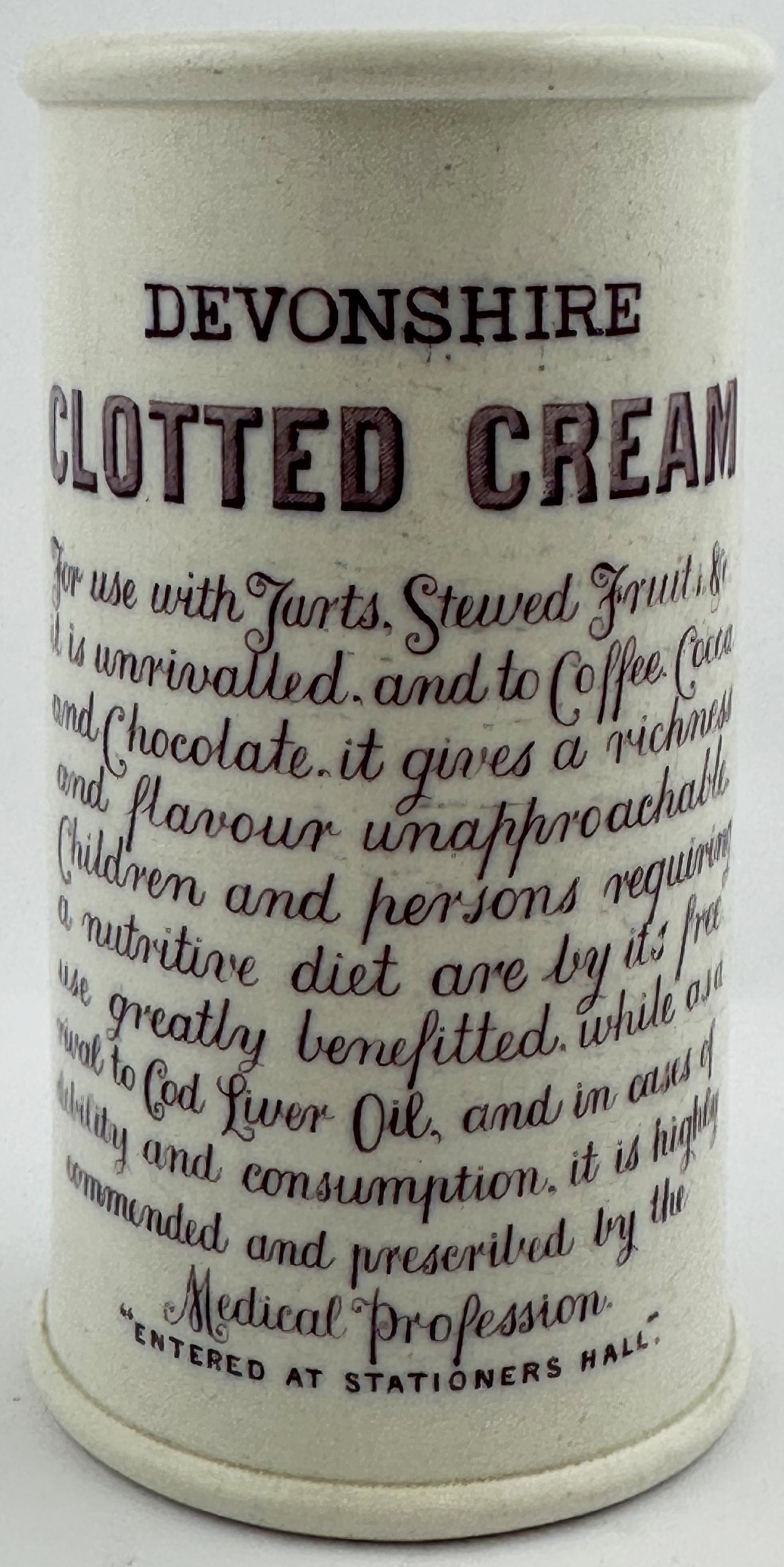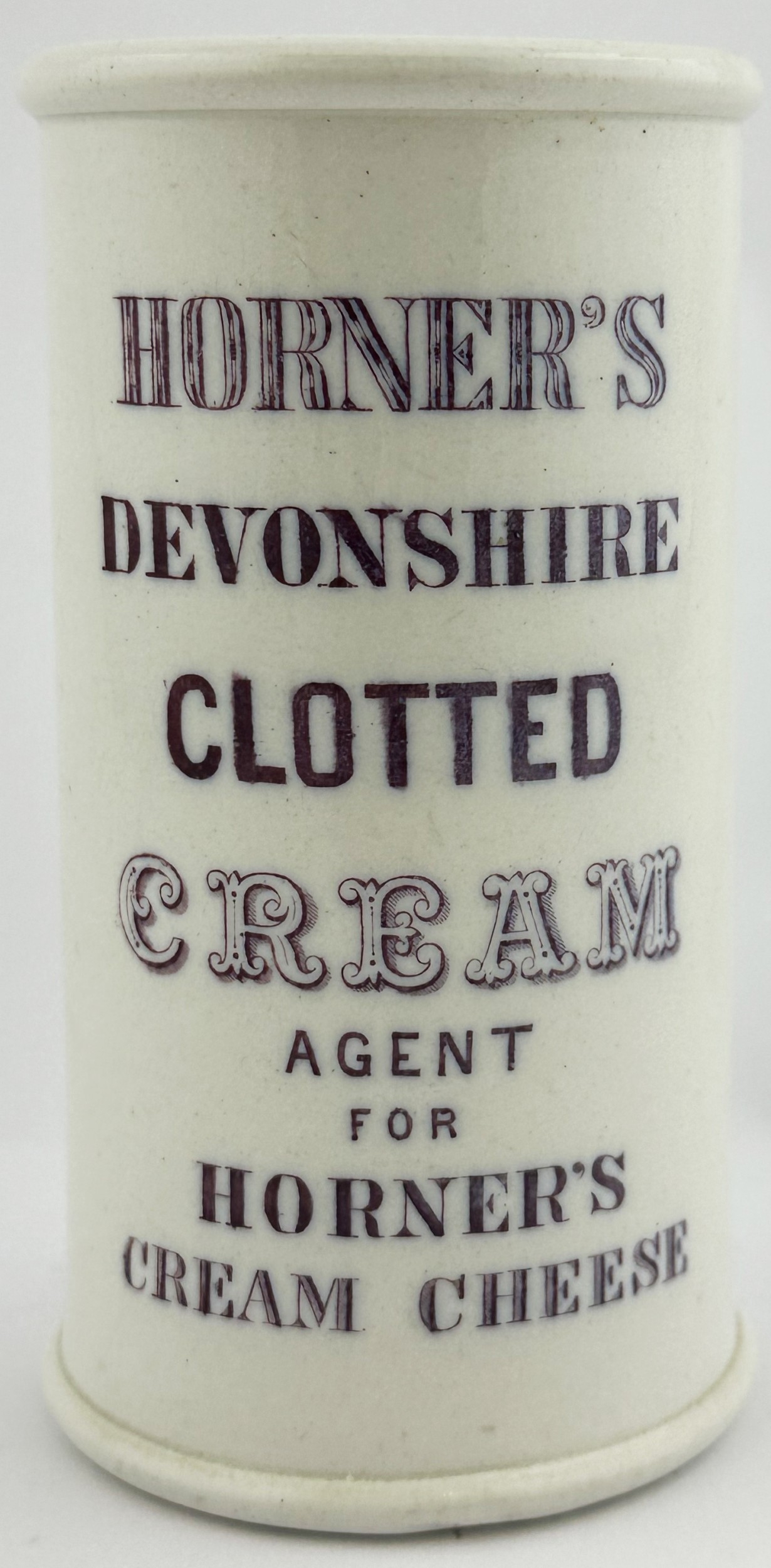 HORNERS CLOTTED CREAM CYLINDER. 5ins tall. Purple transfer. Mint.