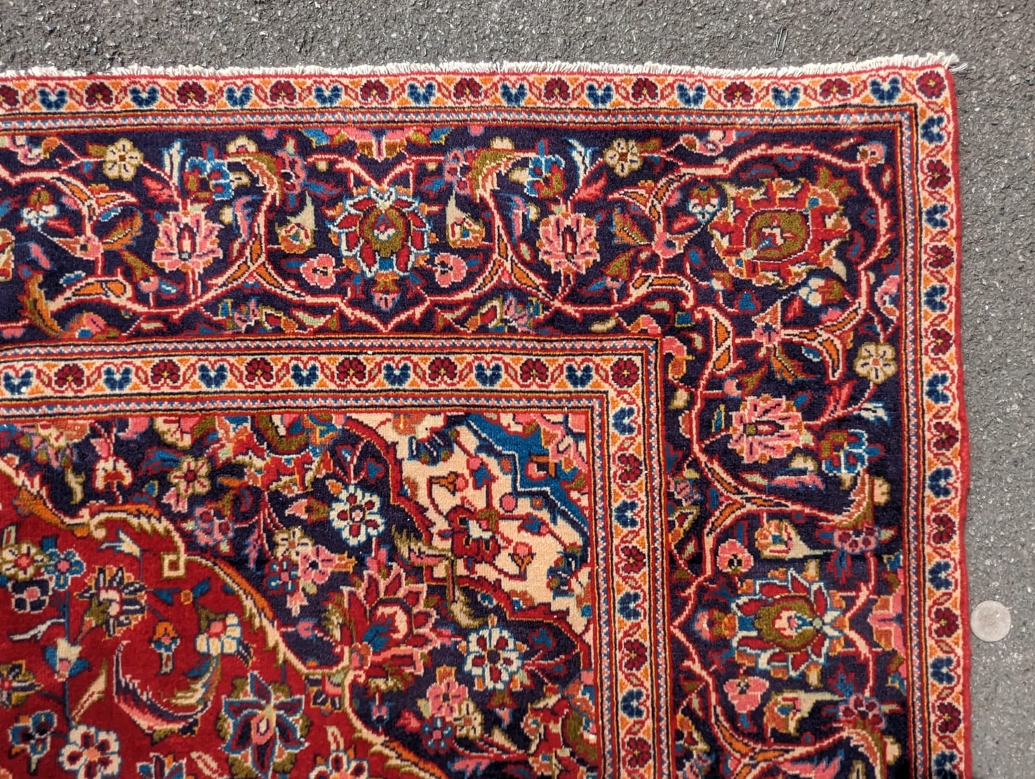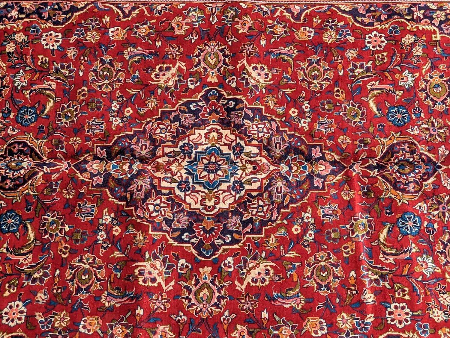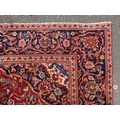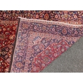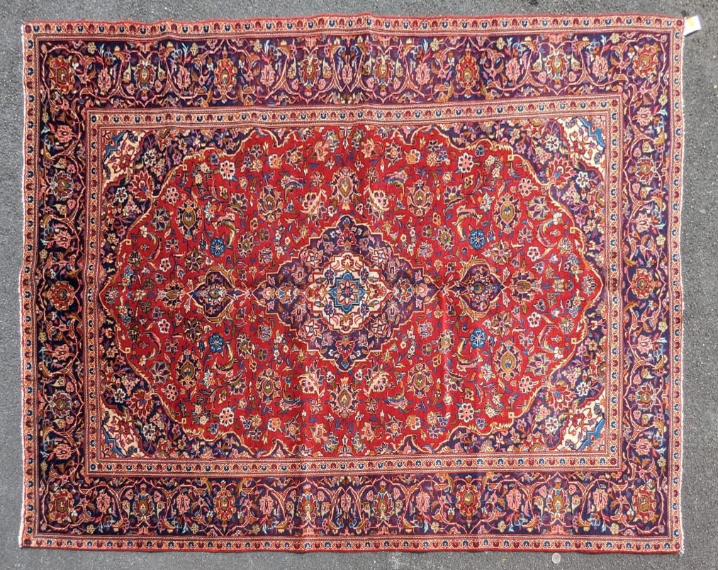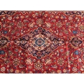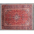 A 20th century central Persian kashan floor rug carpet. Having a large central medallion on a red ground, with cicek style floral motifs surrounding. Having a border decorated with floral motifs and terminating in tassels to the ends. Measures approx. 312cm x 193cm.