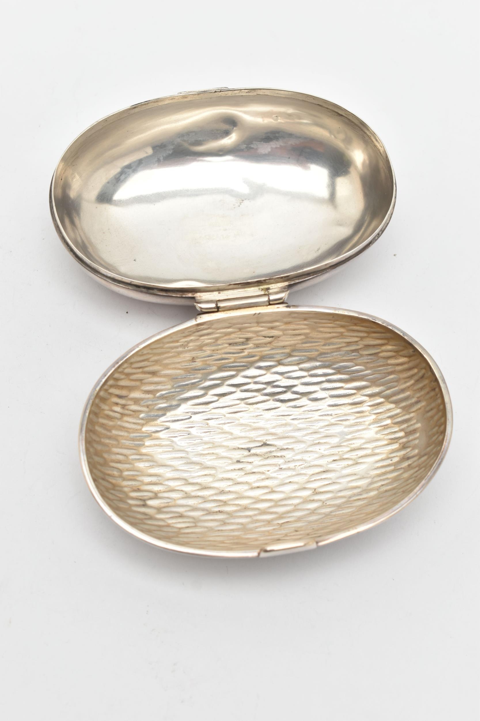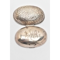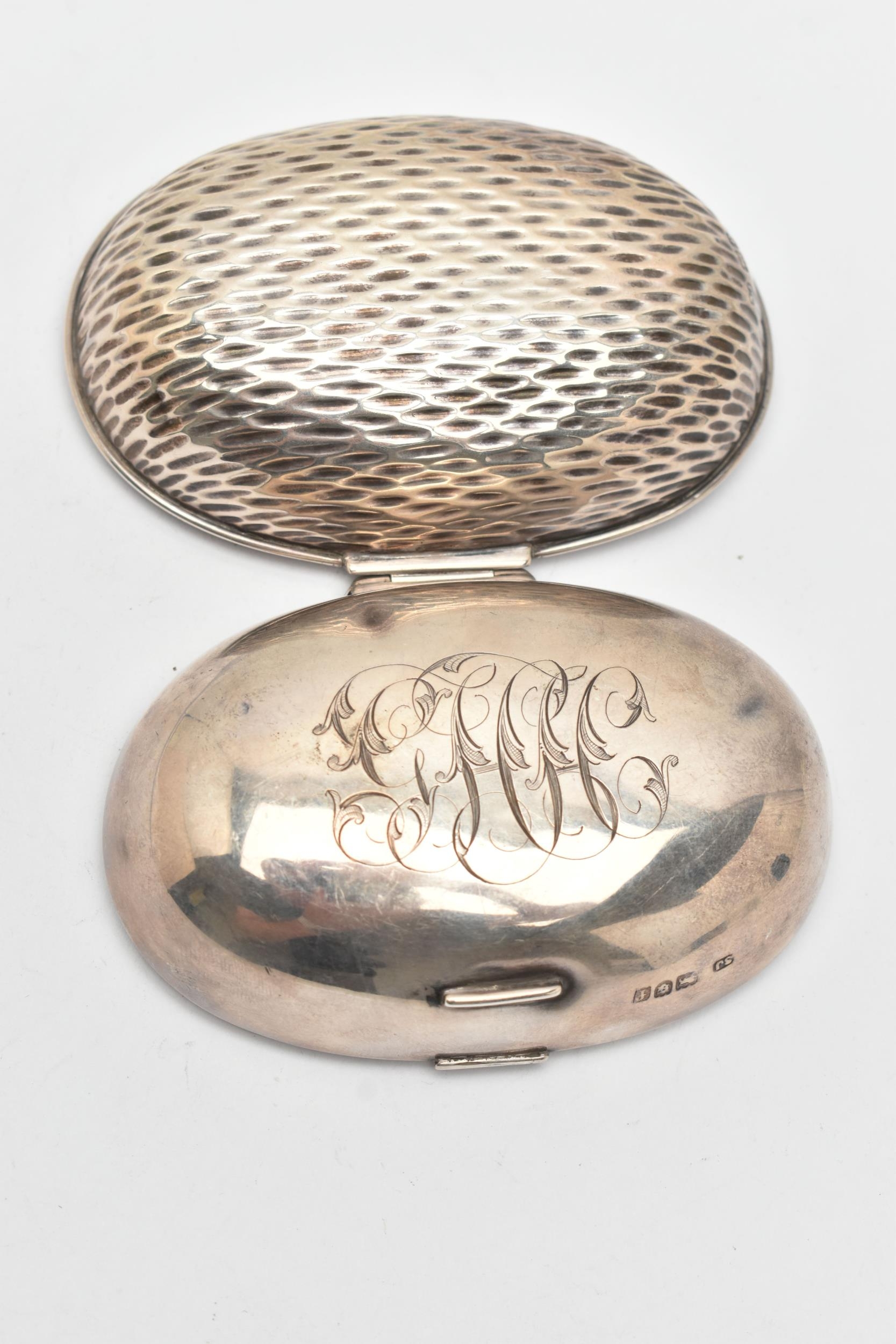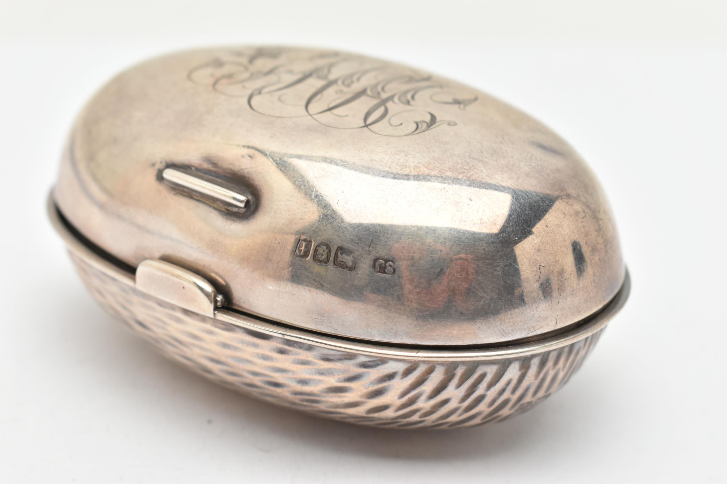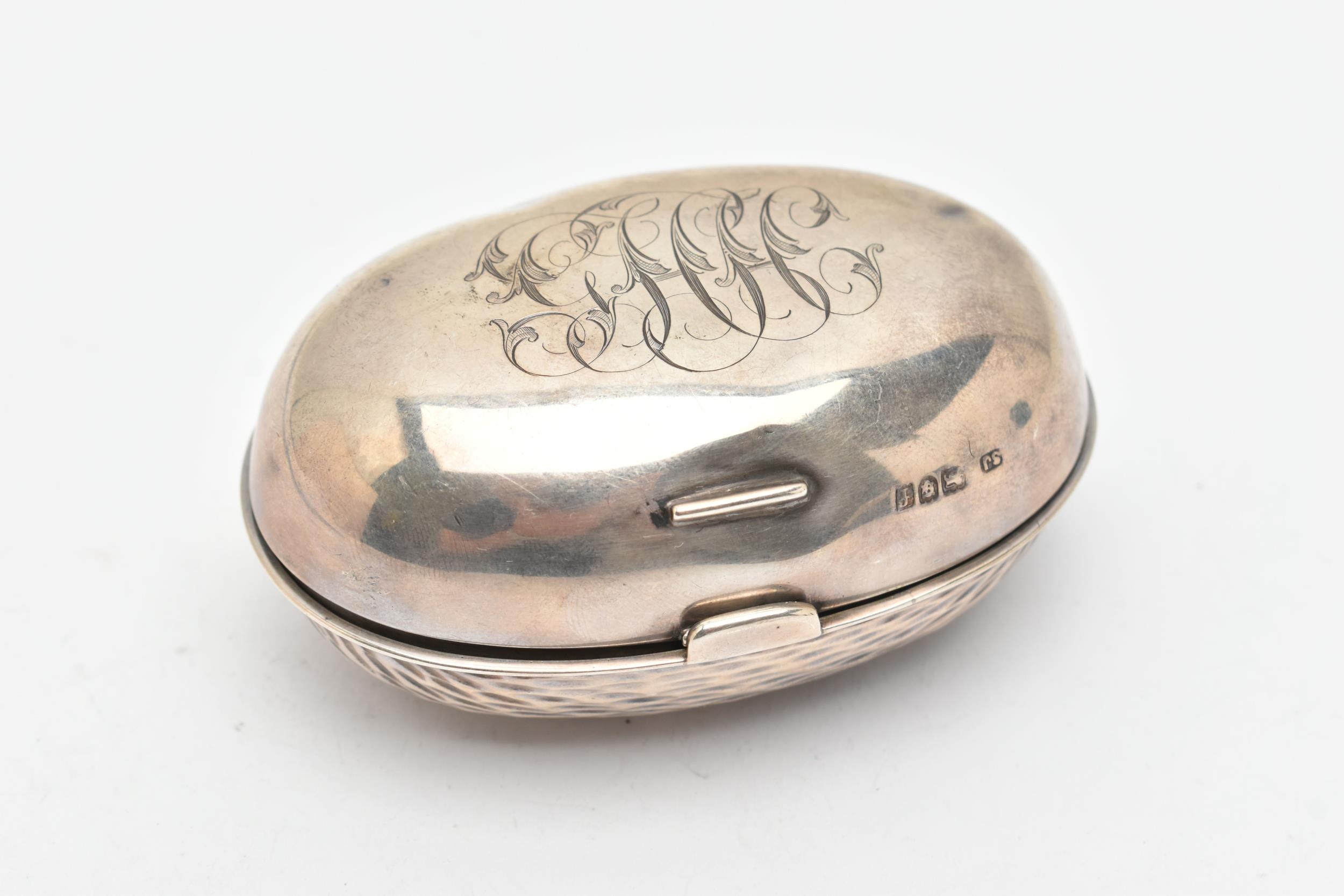 AN EDWARDIAN SILVER SNUFF BOX, of an oval form, engraved monogram to the hinged cover, hammer effect base, catch clasp, hallmarked 'Samuel Jacob' London 1901, approximate length 87.7mm x width 62.0m, approximate gross weight 57 grams, 1.83 ozt (condition report: dink to the cover, does not sit completely flush, slight tarnishing would benefit from a gentle clean and polish)