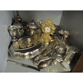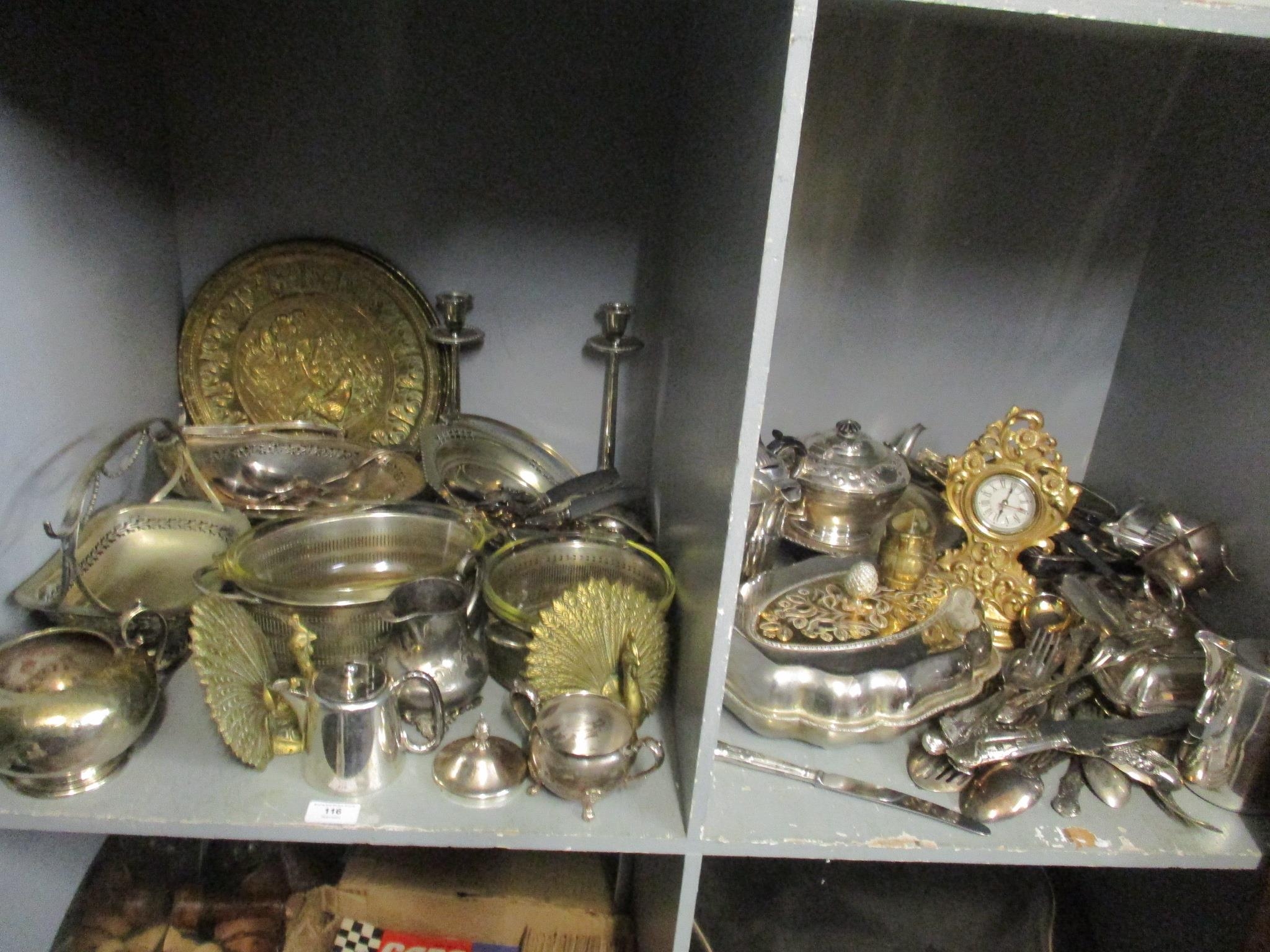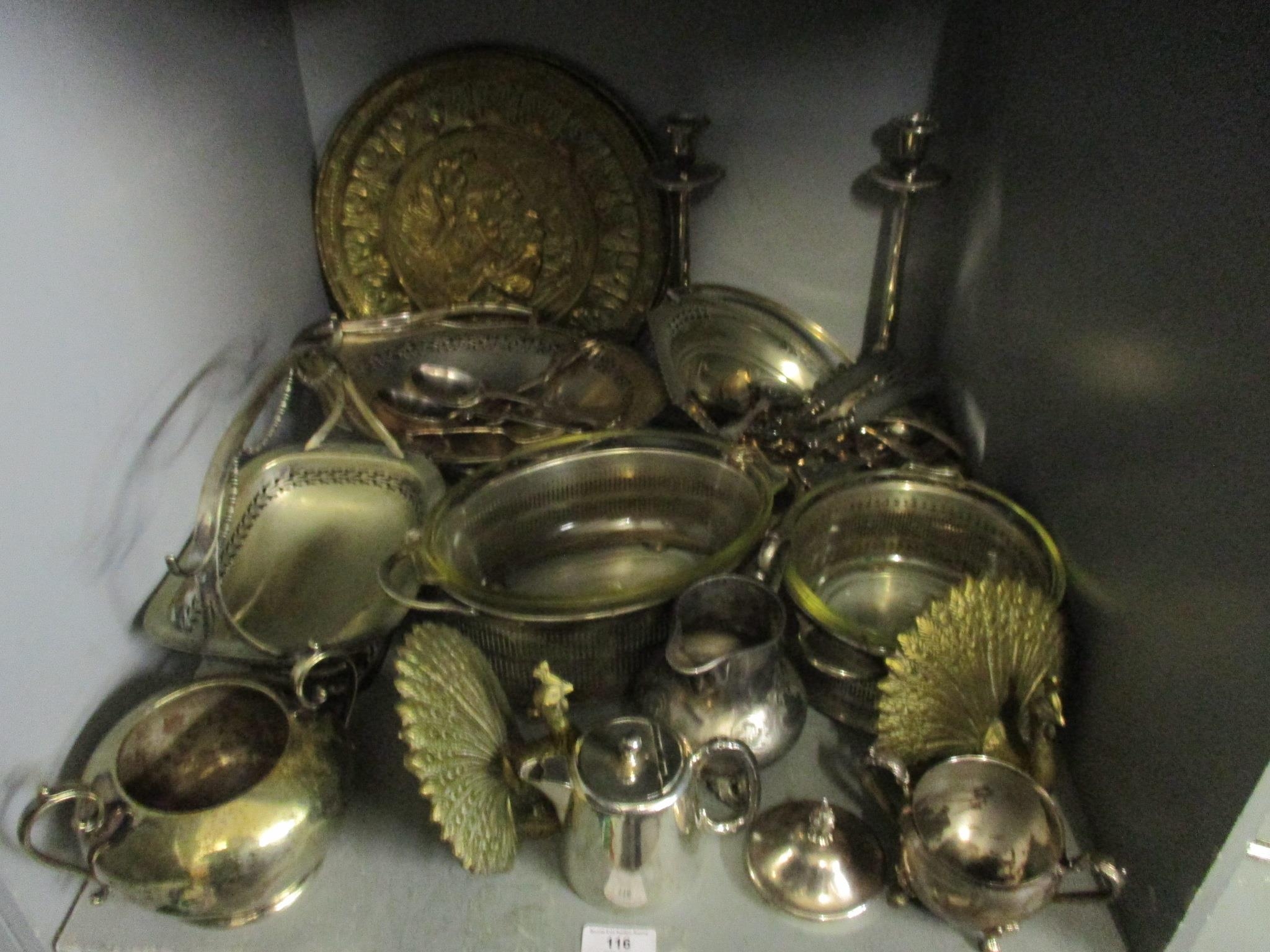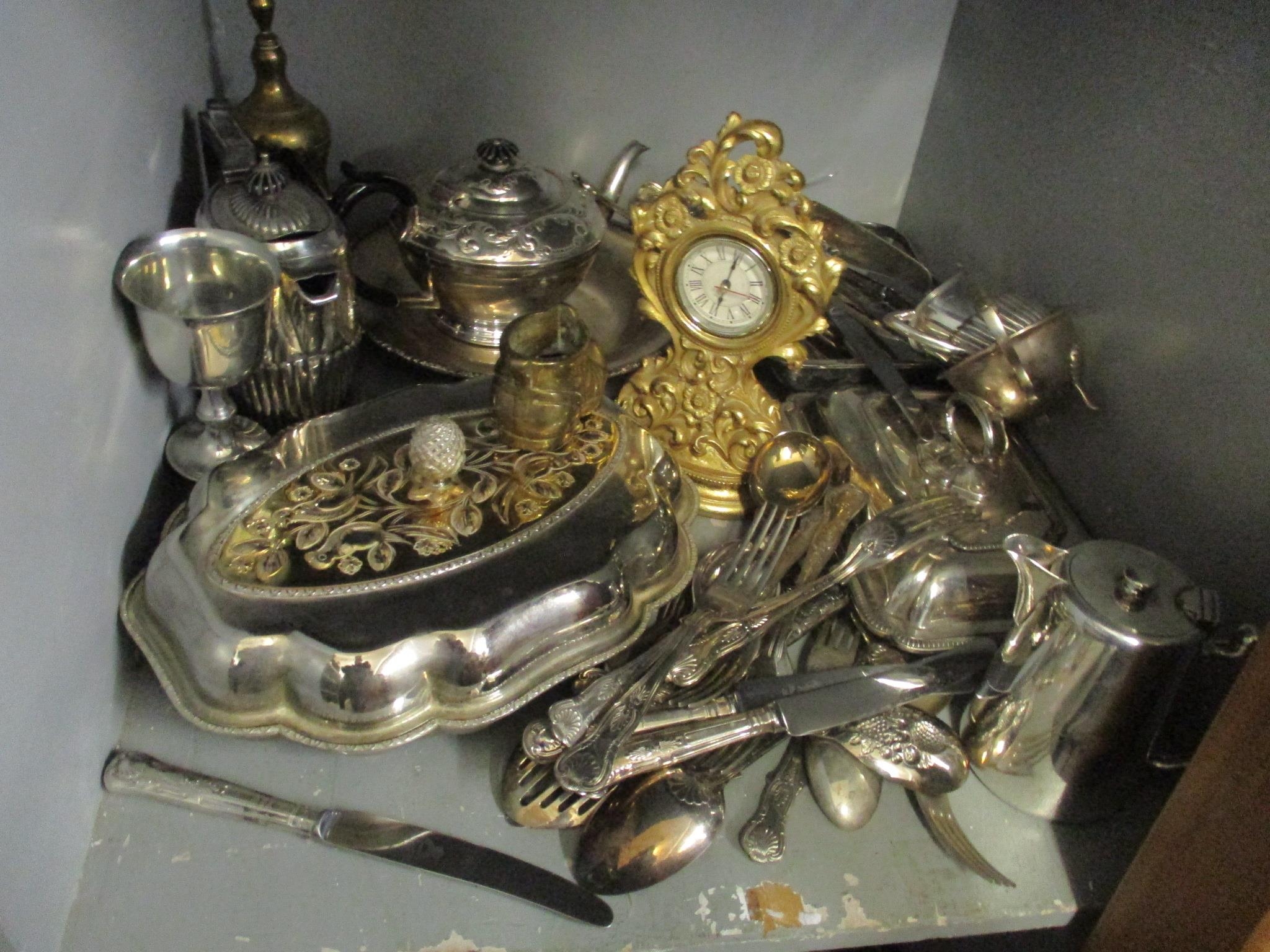 A mixed lot of mainly silver plated items to include a pair of candlesticks, tureen, cutlery and other itemsLocation: G