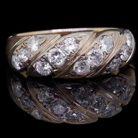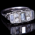 DIAMOND DRESS RING, se with 3 baguette cut diamonds and 4 brilliant cut diamonds, totalling approx. 1.12 ct. the sides of the head of openwork design with floral applique decoration. Size O. 3.3 grams.