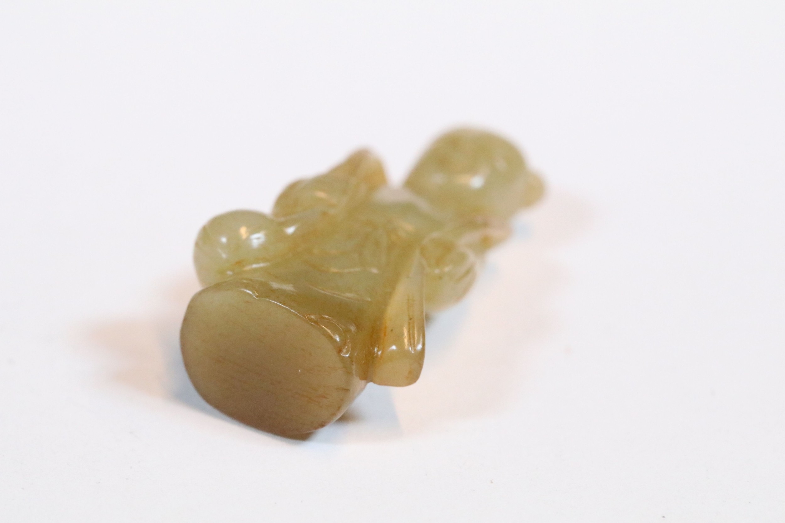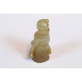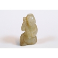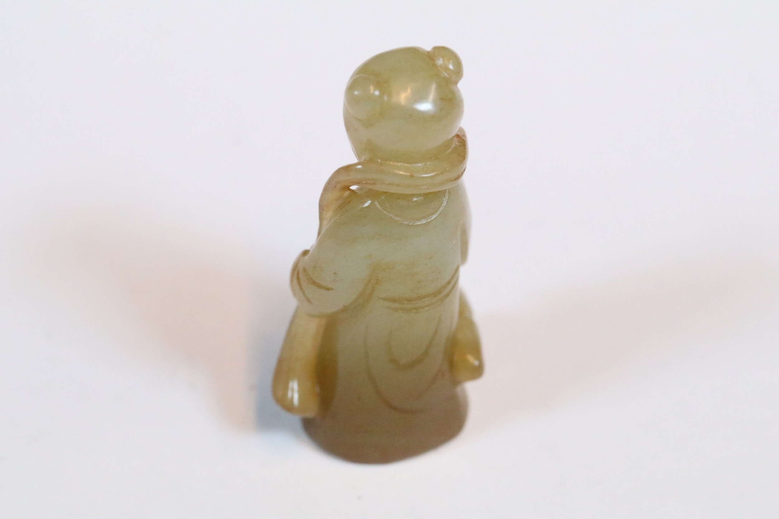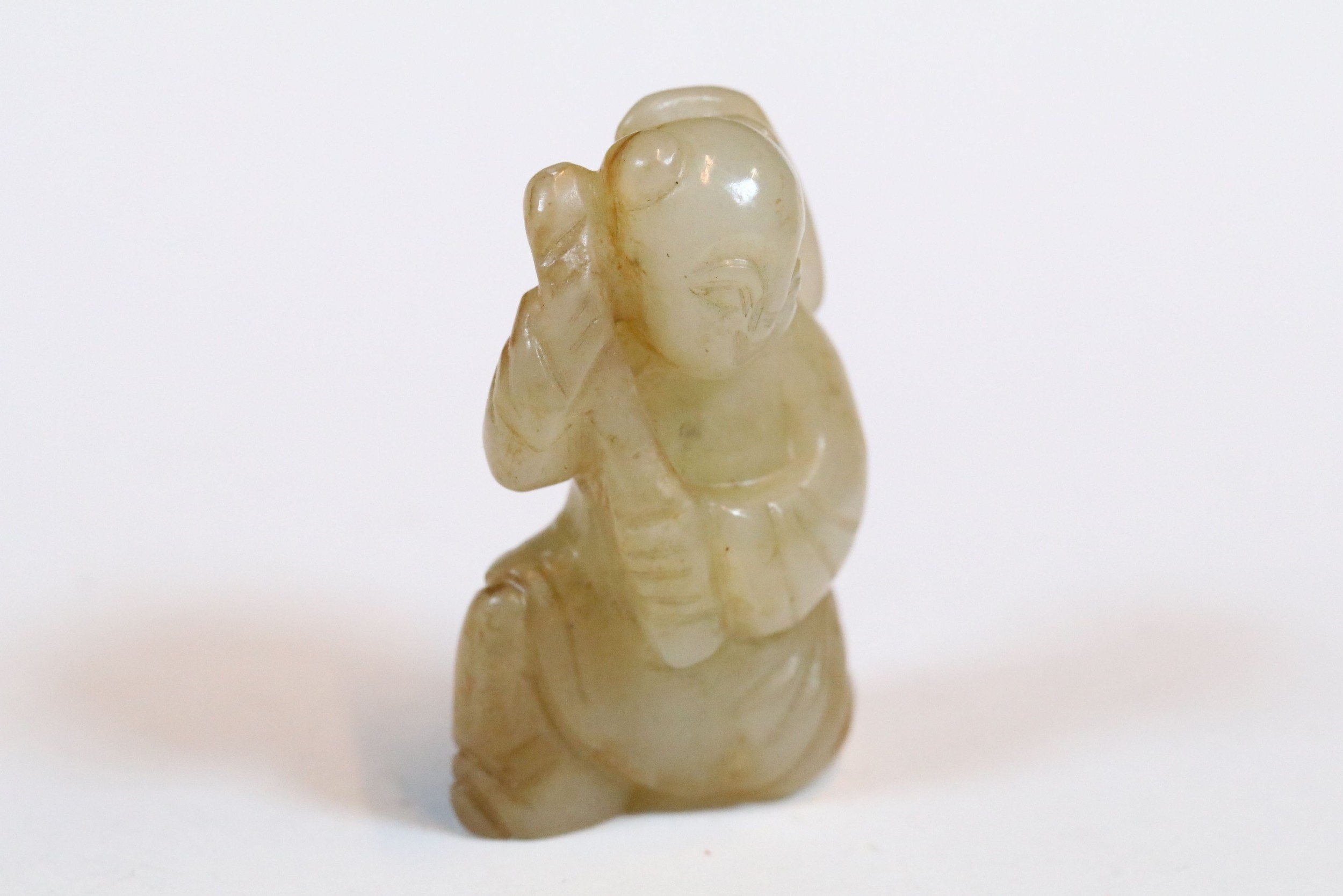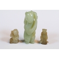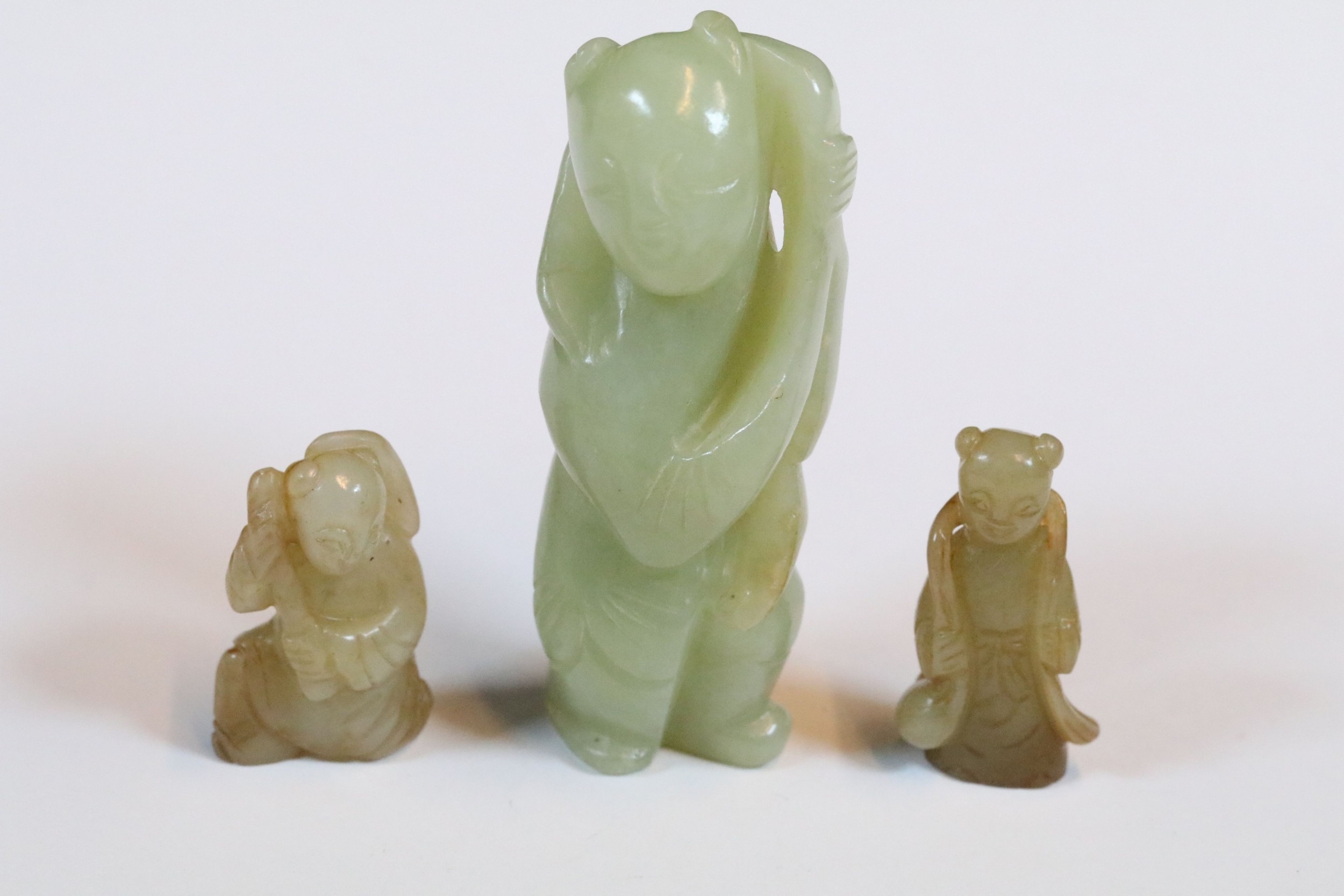 Three carved jade figurines one of larger size, H 7.5cm together with two miniature examples of workers H 3.5cm
