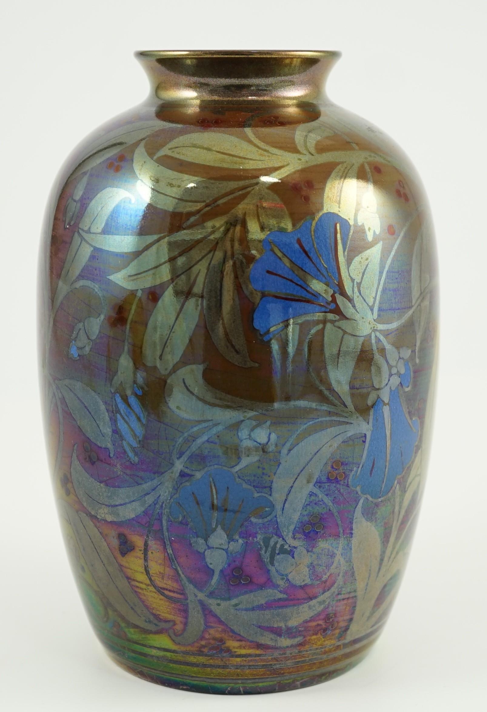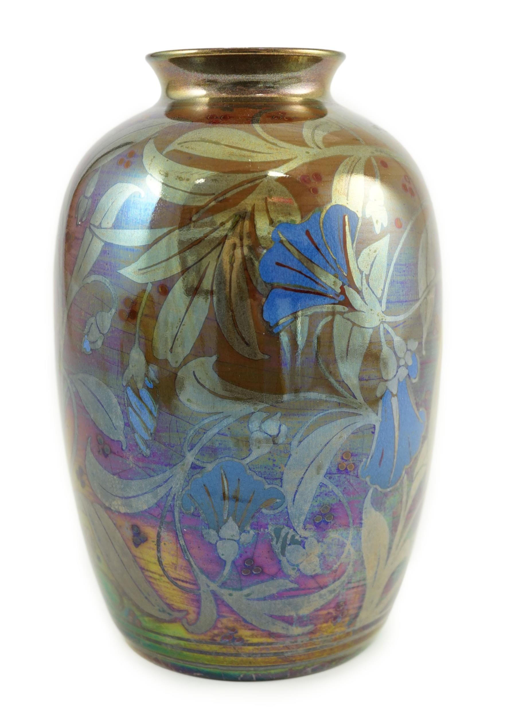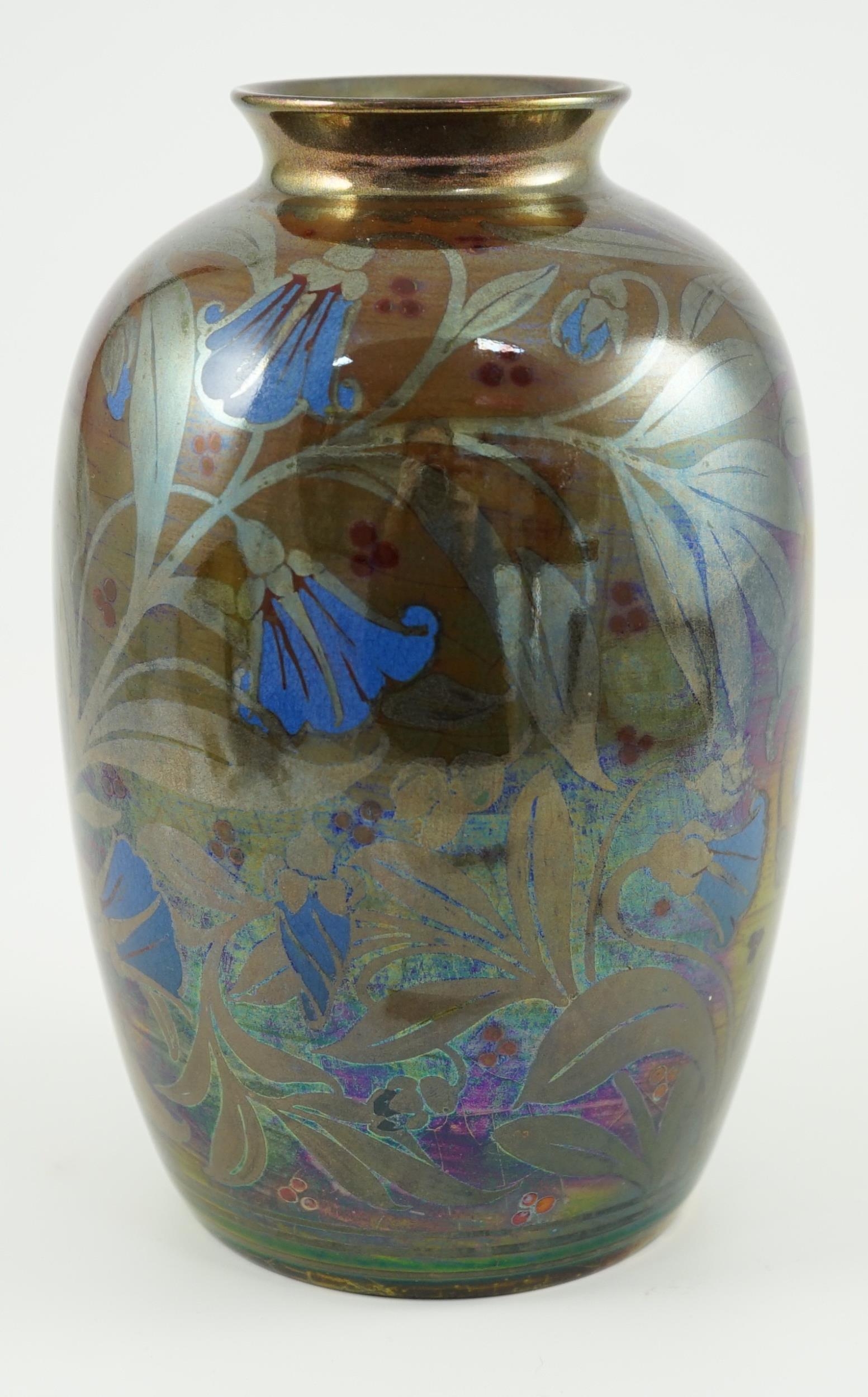 A Pilkington's Lancastrian ovoid vase, by William S. Mycock, 1923, decorated with harebells and berries, in violet, silver, green and ruby lustre, impressed marks and painted WSM 1923 mark, 19cm high