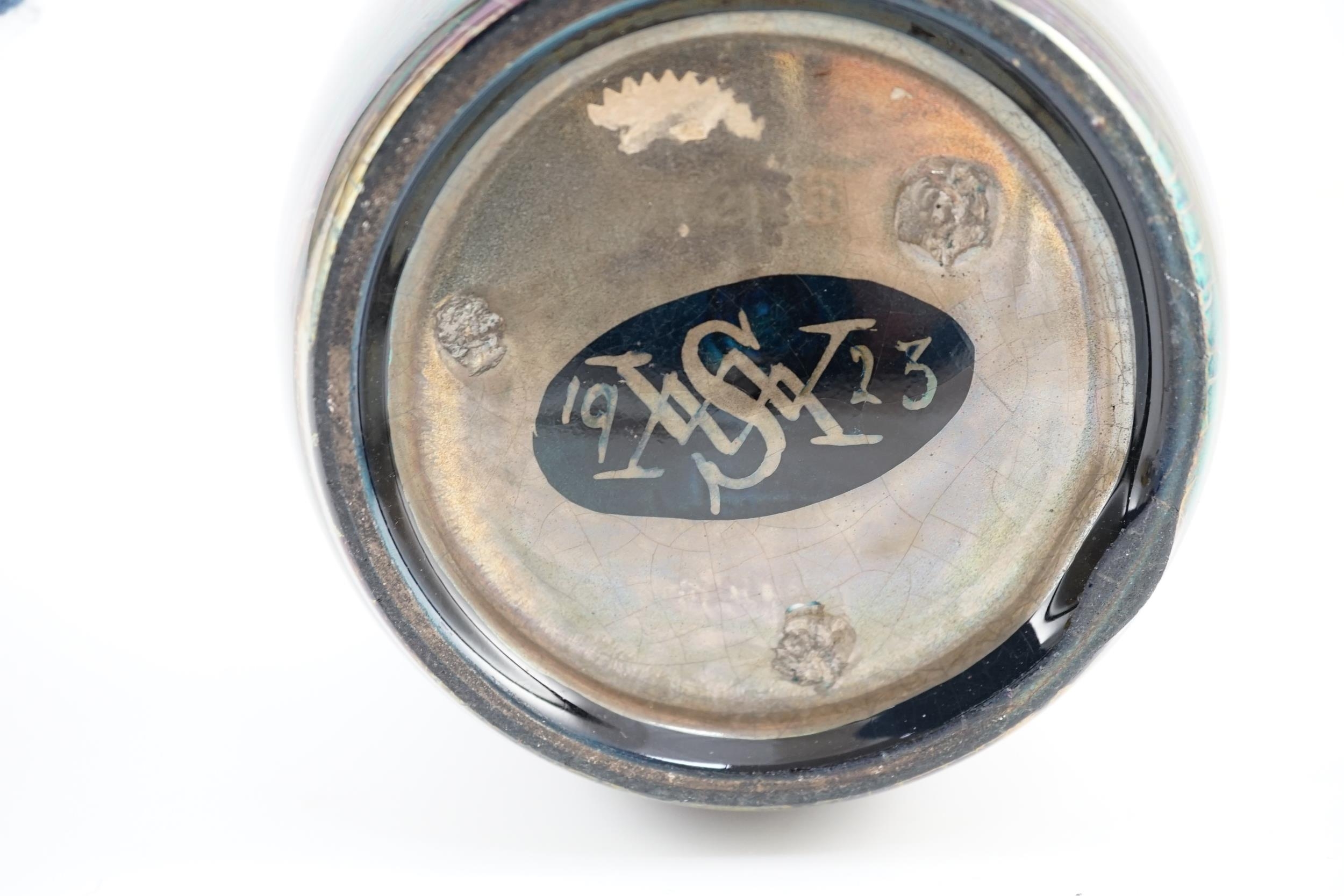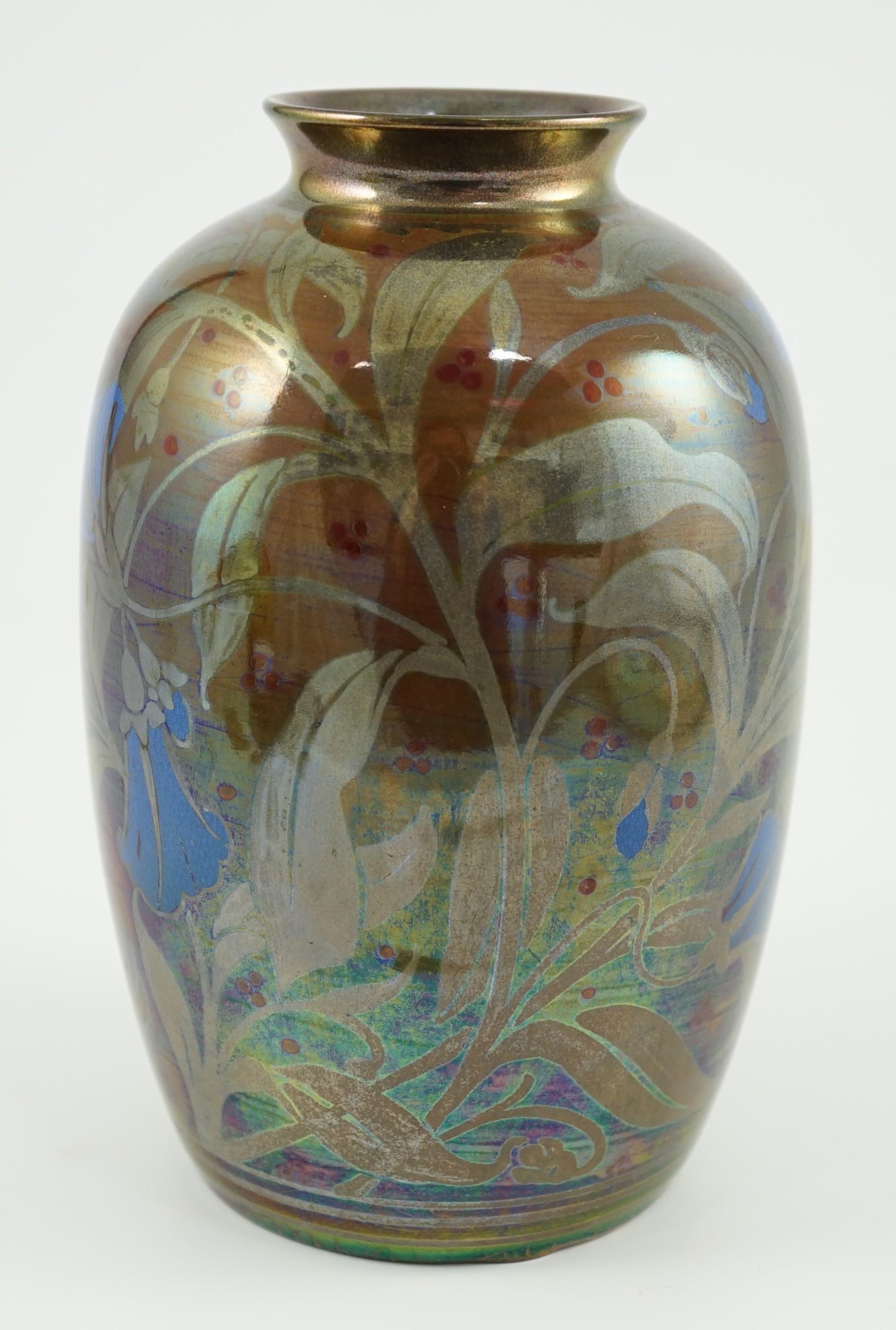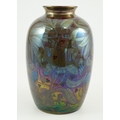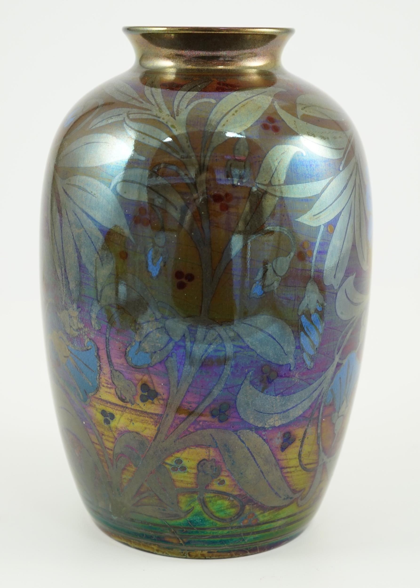 A Pilkington's Lancastrian ovoid vase, by William S. Mycock, 1923, decorated with harebells and berries, in violet, silver, green and ruby lustre, impressed marks and painted WSM 1923 mark, 19cm high