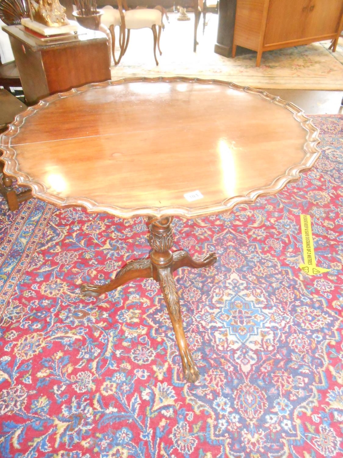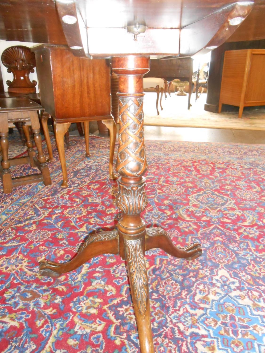A Georgian mahogany table with circular hinged top, on lattice carved centre column, three downswept legs with acanthus leaf decoration, claw and pill feet - 39in. wide