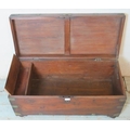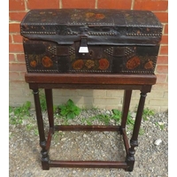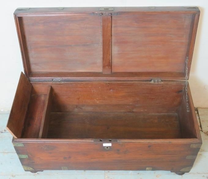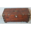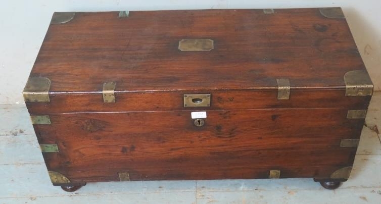 A 19th century oak brass bound campaign chest with internal candle holder box, raised on bun feet.