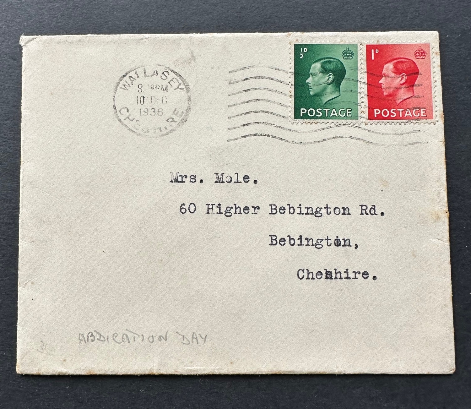 GB KEVIII rare 10th December 1936 Abdication Day cover with used / cancelled stamps, Cheshire