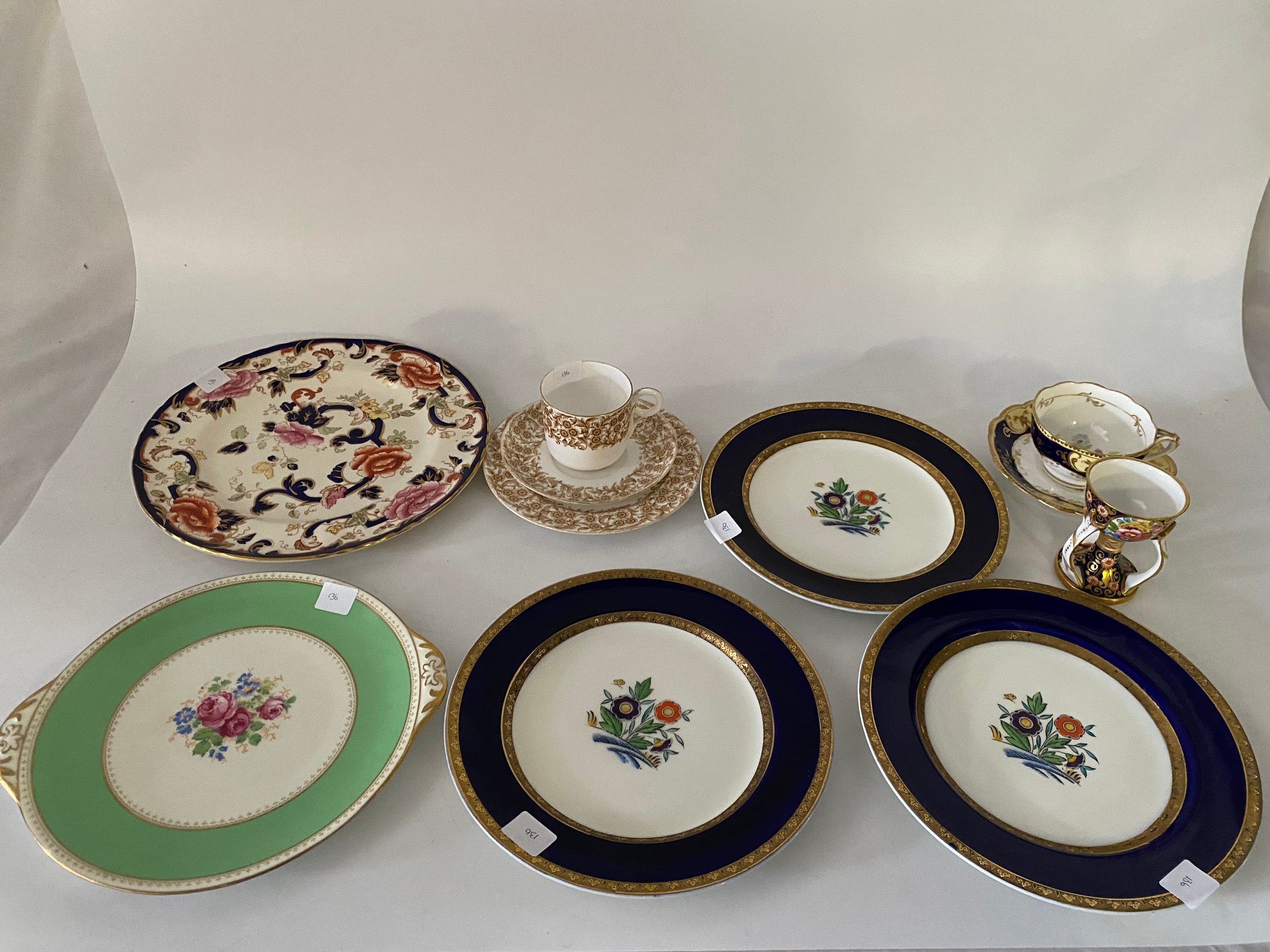 A Crown Staffordshire egg cup, blue ground painted flowers and gilding - 3 1/4in. high, a 19th Century cup and saucer painted flowers in the interior, a Royal Worcester trio, brown flower decoration, a tazza painted flowers within green border, three Minton plates painted flowers within blue and gilt borders - 8 3/4in. dia. and a Masons Mandalay pattern plate - 10 1/2in. dia.