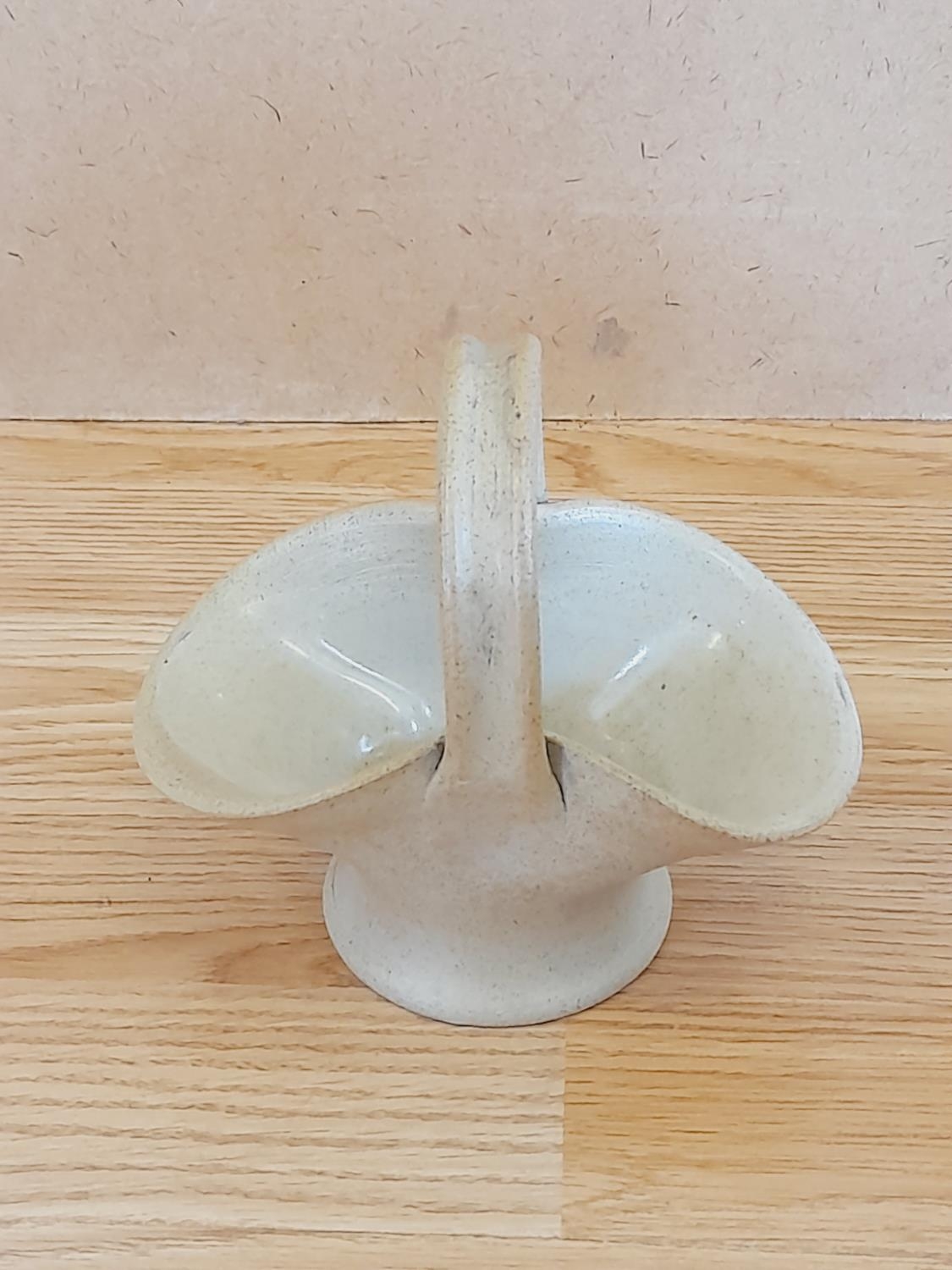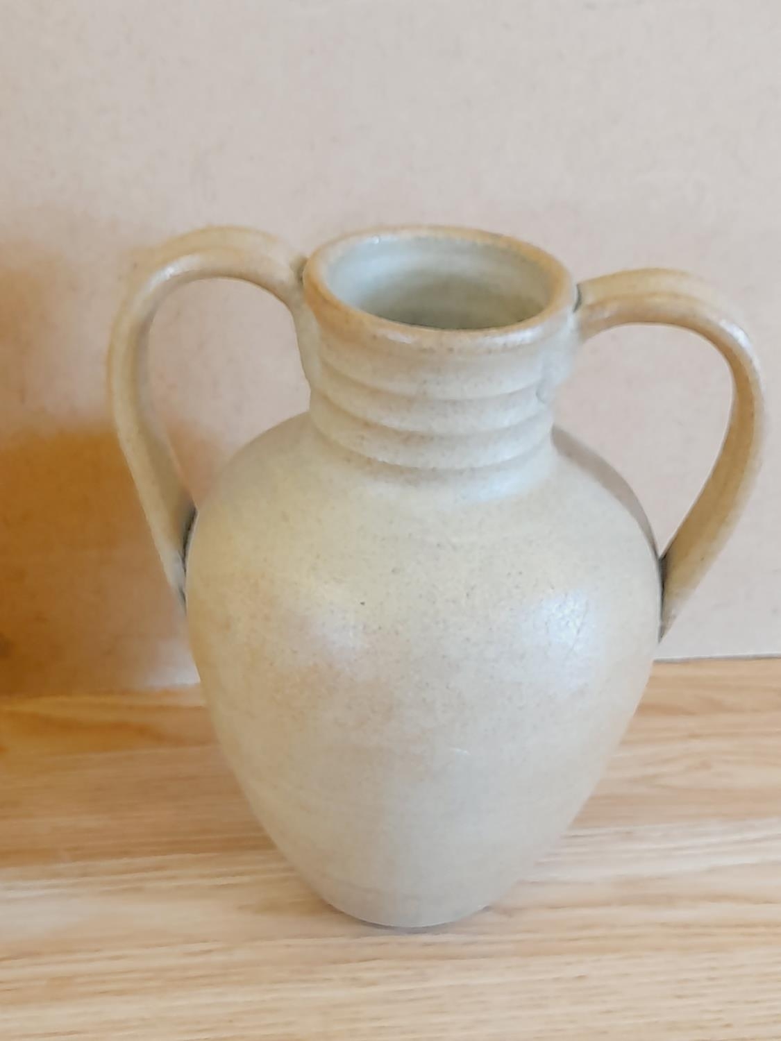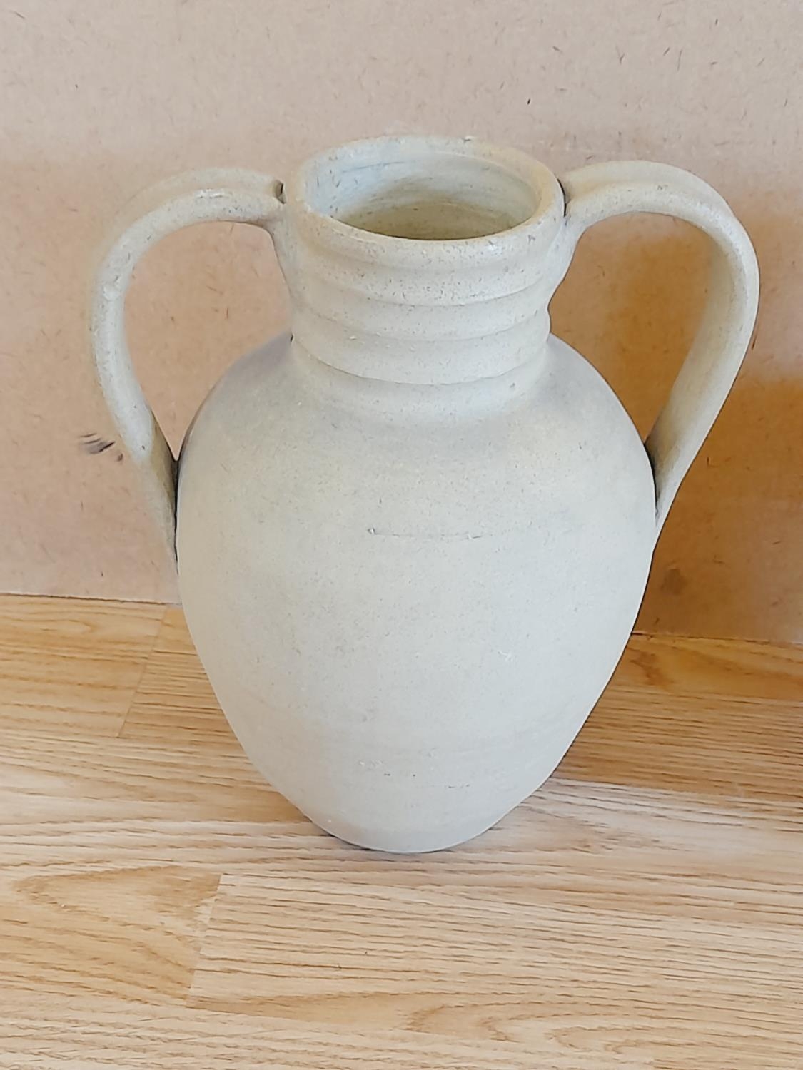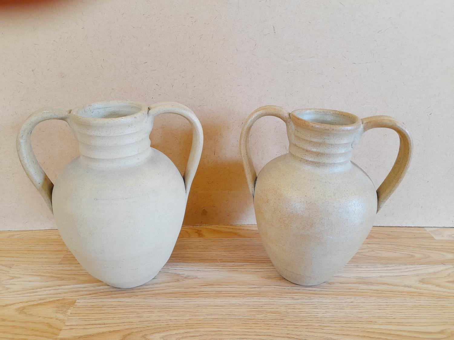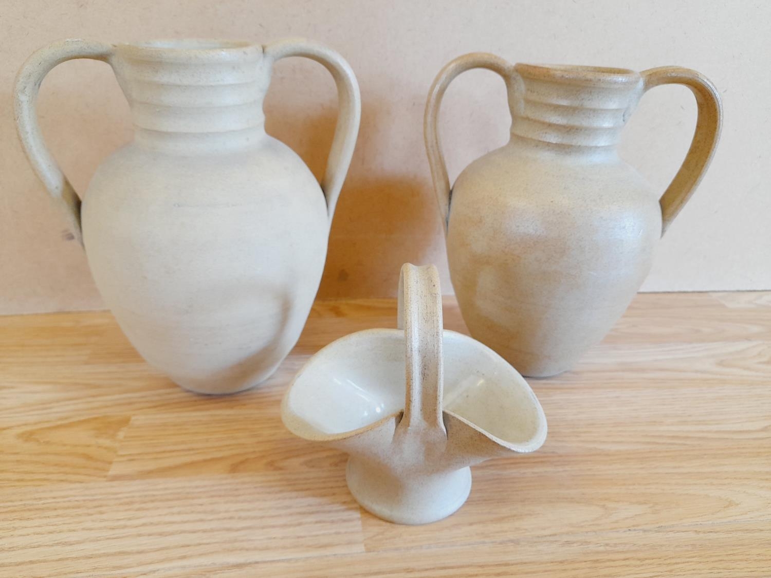 Pair of Hillstonia Pottery 24cm Twin Handled Urn Style Vases plus a Small Flower Basket.