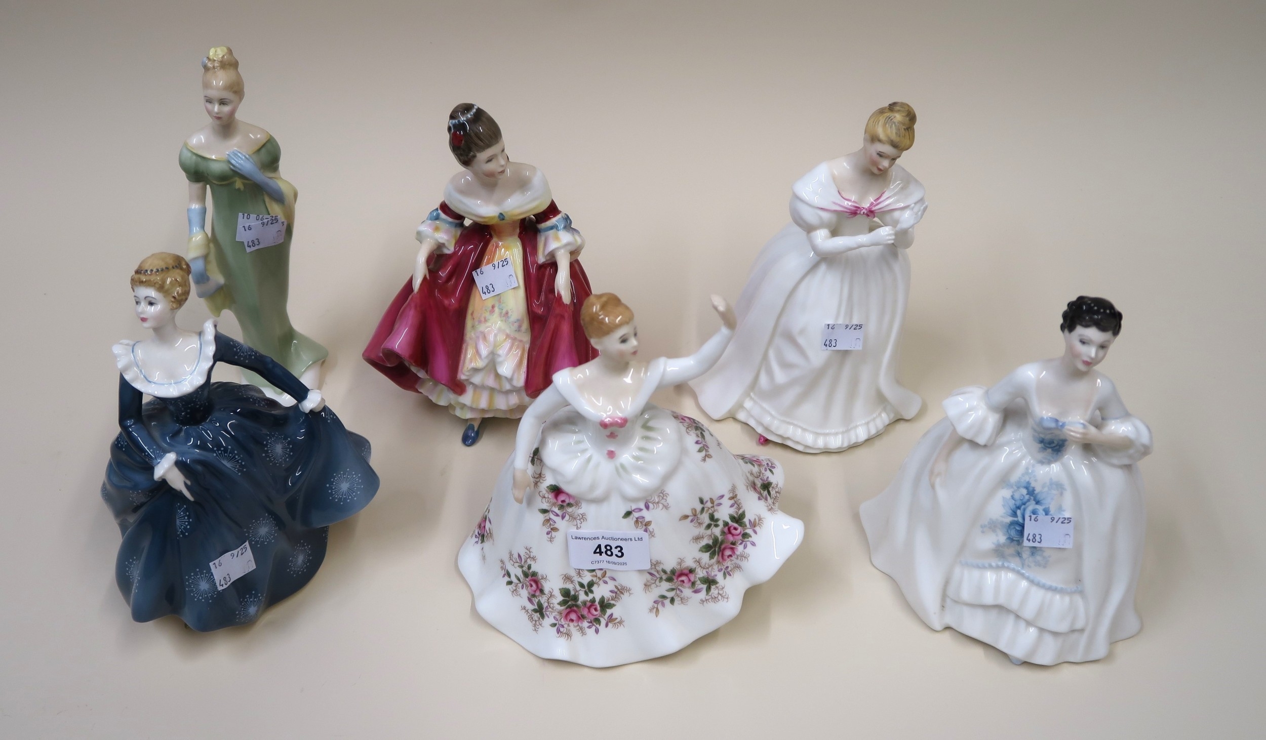 Six Royal Doulton figures, ' Kelly ', ' Fragrance ', ' Denise ', ' Shirley ', ' Southern Belle ' and ' Lorna '