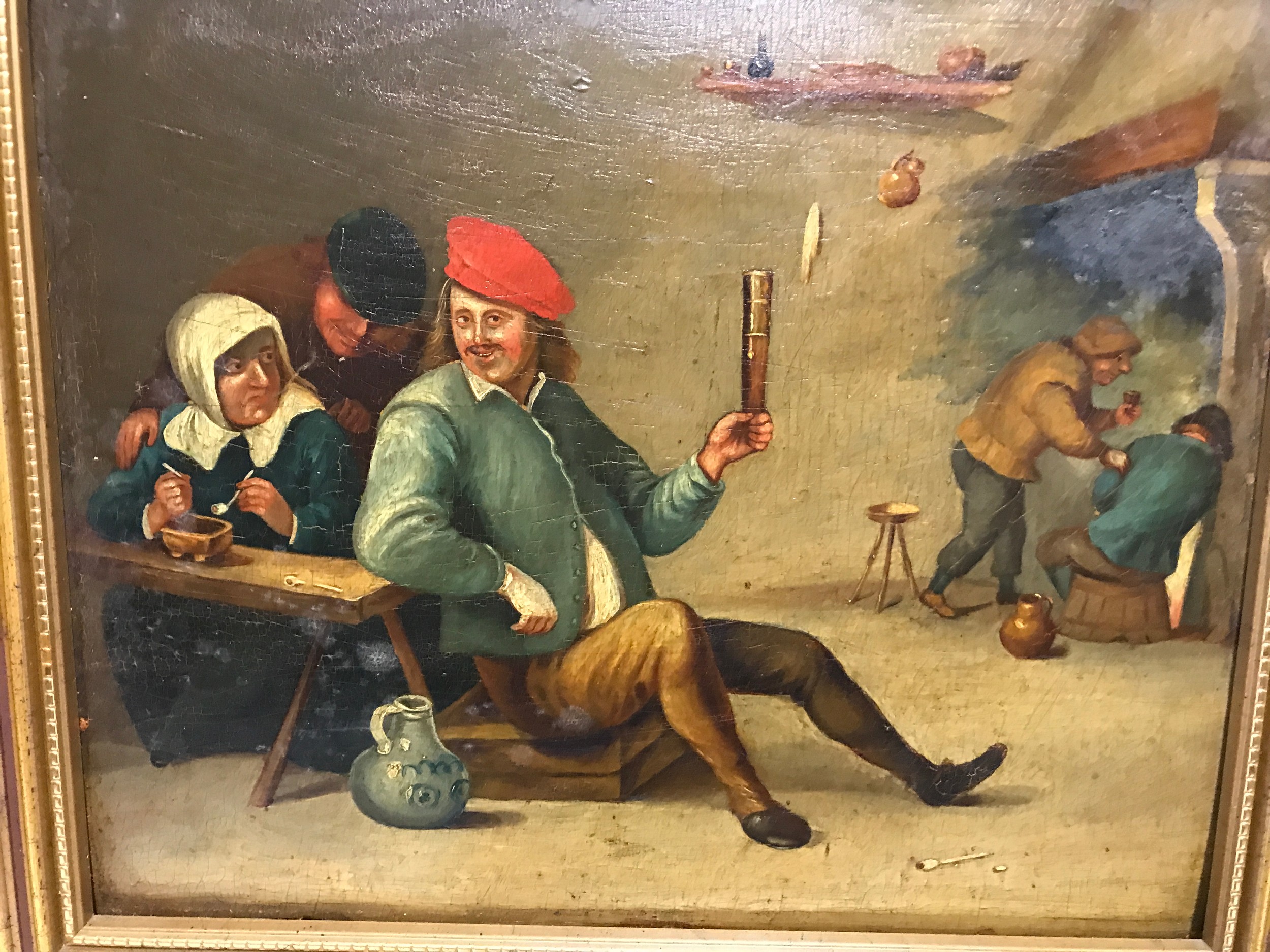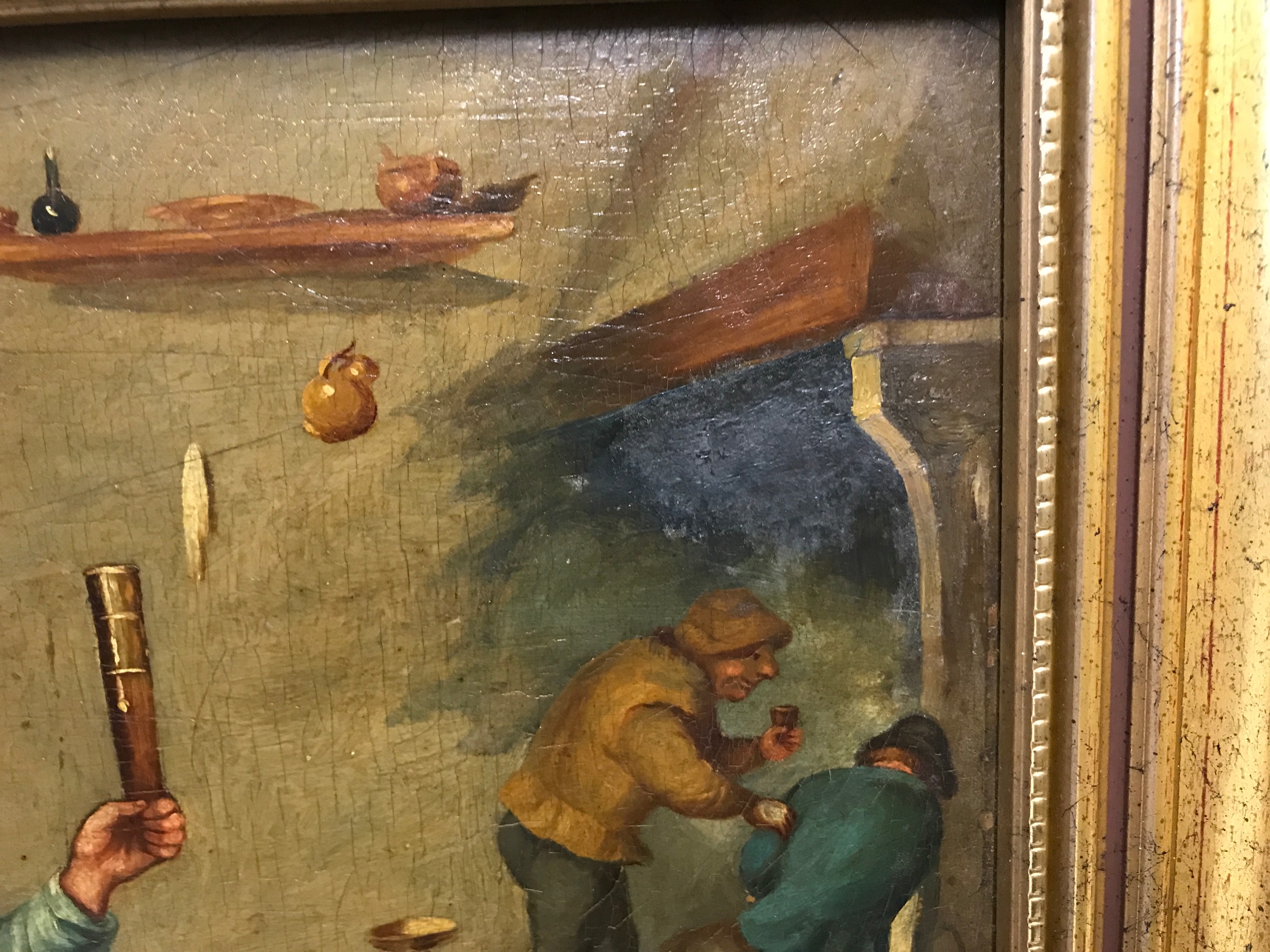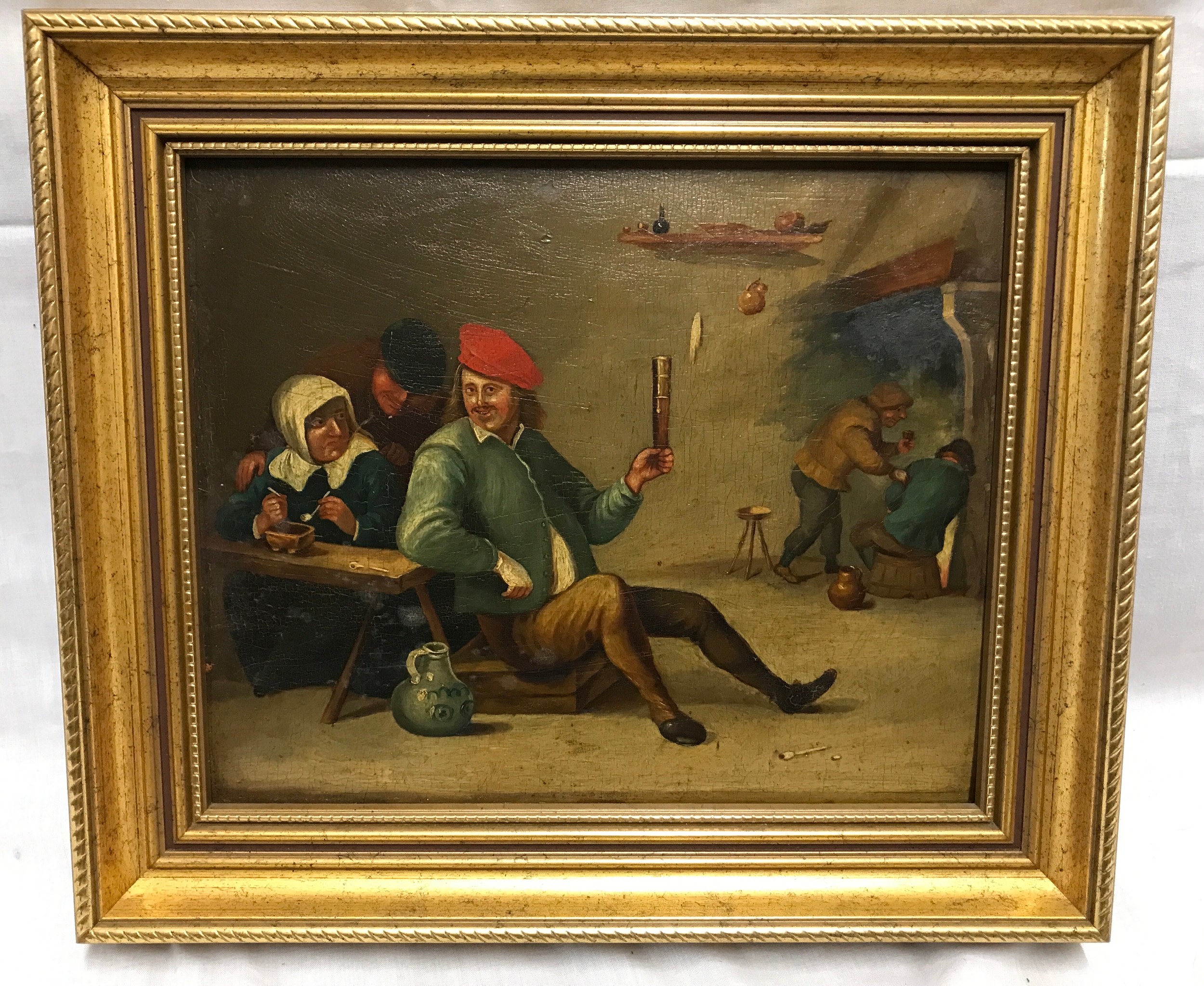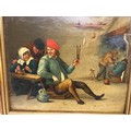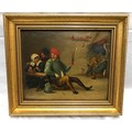 Unsigned gilt framed oil on board of an interior tavern scene 25.5cms h x 31cms w.