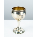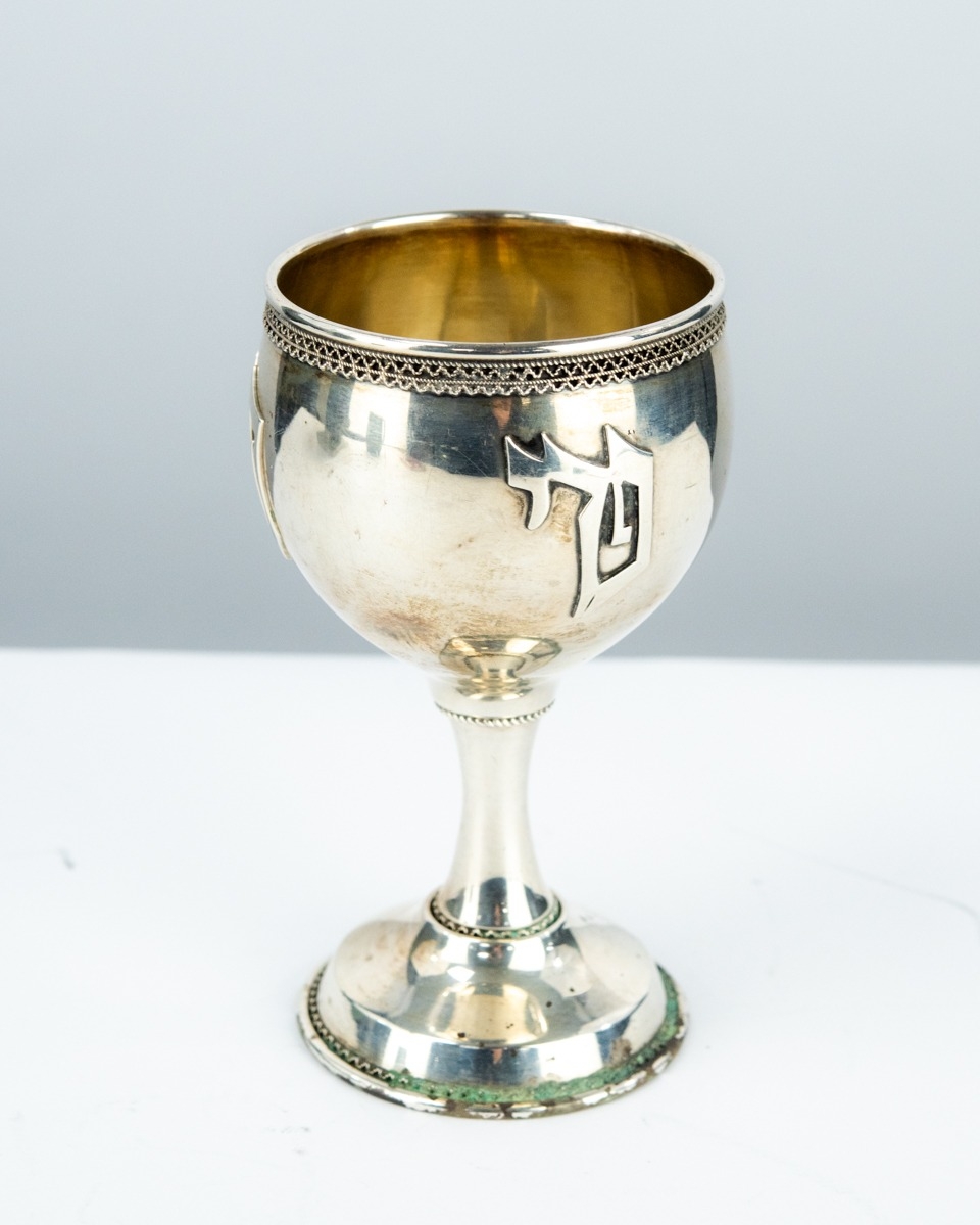 JUDAICA STERLING SILVER CEREMONIAL GOBLET, of typical form with gilt interior and slender borders, the bowl applied with letters or motifs, 5” (12.7cm) high, STAMPED: S NADAV, HANDMADE STERLING, 3.07ozt