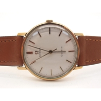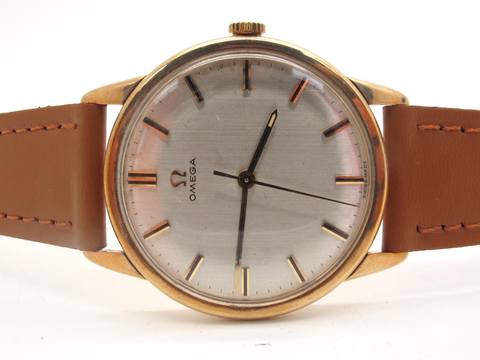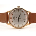 Omega; A Vintage 9ct Gold Cased Gent's Wristwatch, the signed dial with line markers and centre seconds, the movement stamped "Omega Watch Co" "Seventeen Jewels", 610 calibre, within plain case, London 1963, on a modern strap with buckle bearing Omega logo.