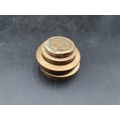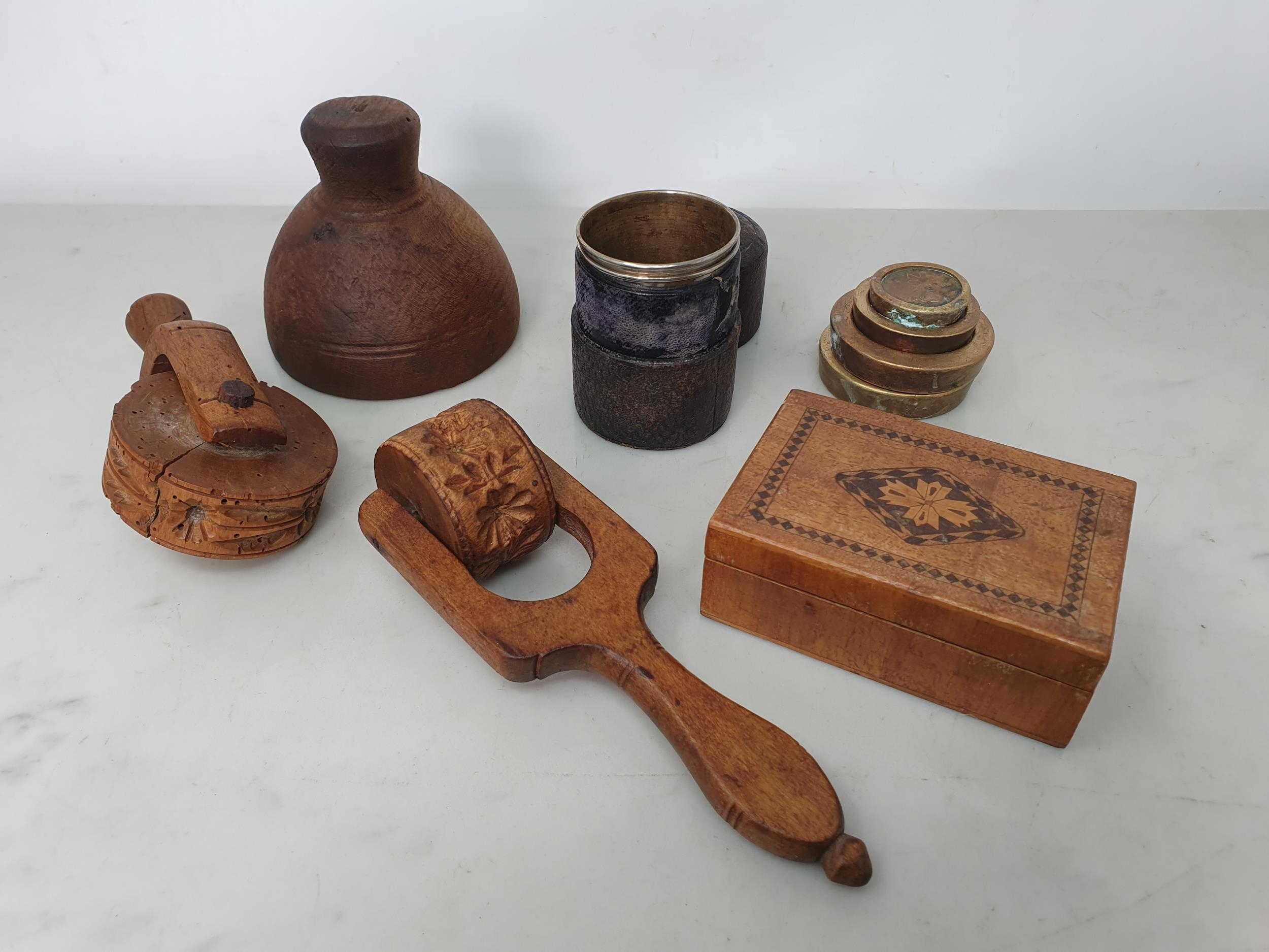 Two treen Butter Print Rollers, treen Stem Cup, Spirit Tots, brass Weights, etc (CAB)