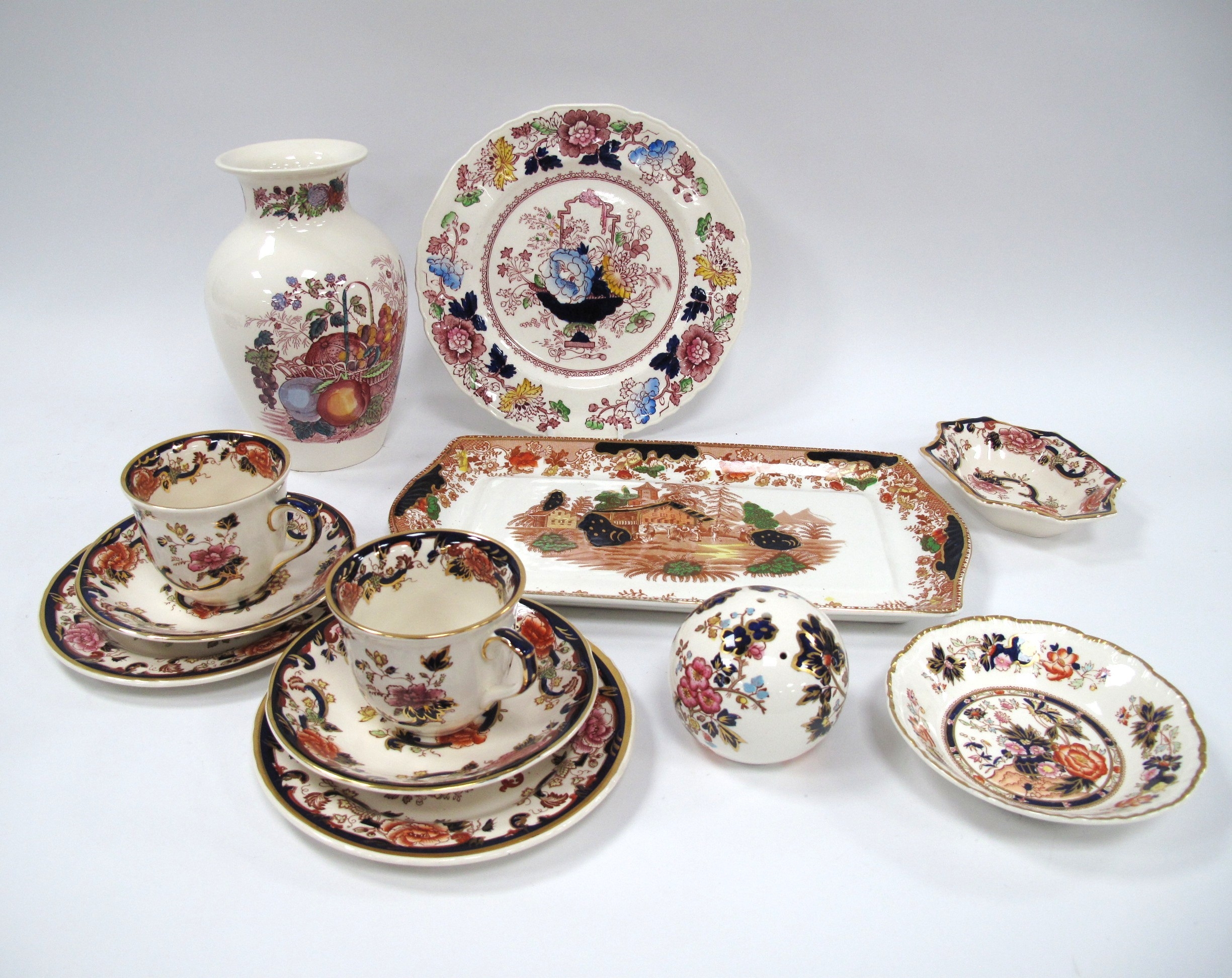 Masons Mandalay chinaware including two teacup, saucer and side plate trios, dish and pomander, Masons fruit basket pattern vase etc. One Tray
