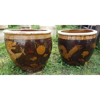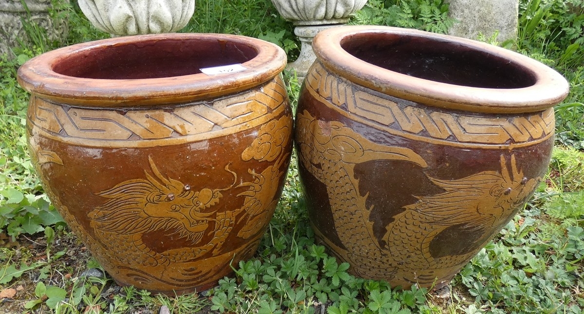 Pair of Oriental Glazed Garden Pots Depicting Dragons - Approx H: 75cm