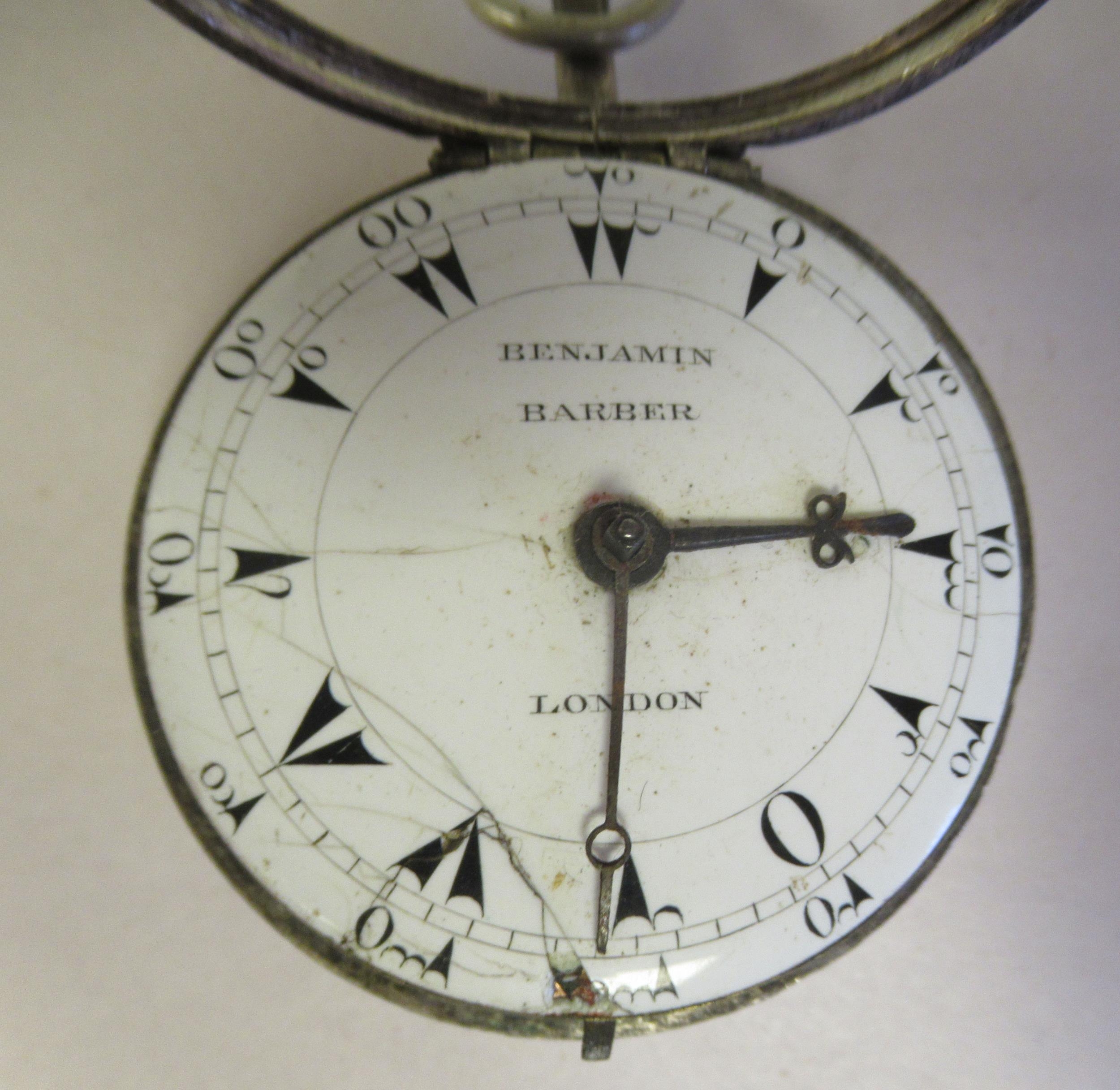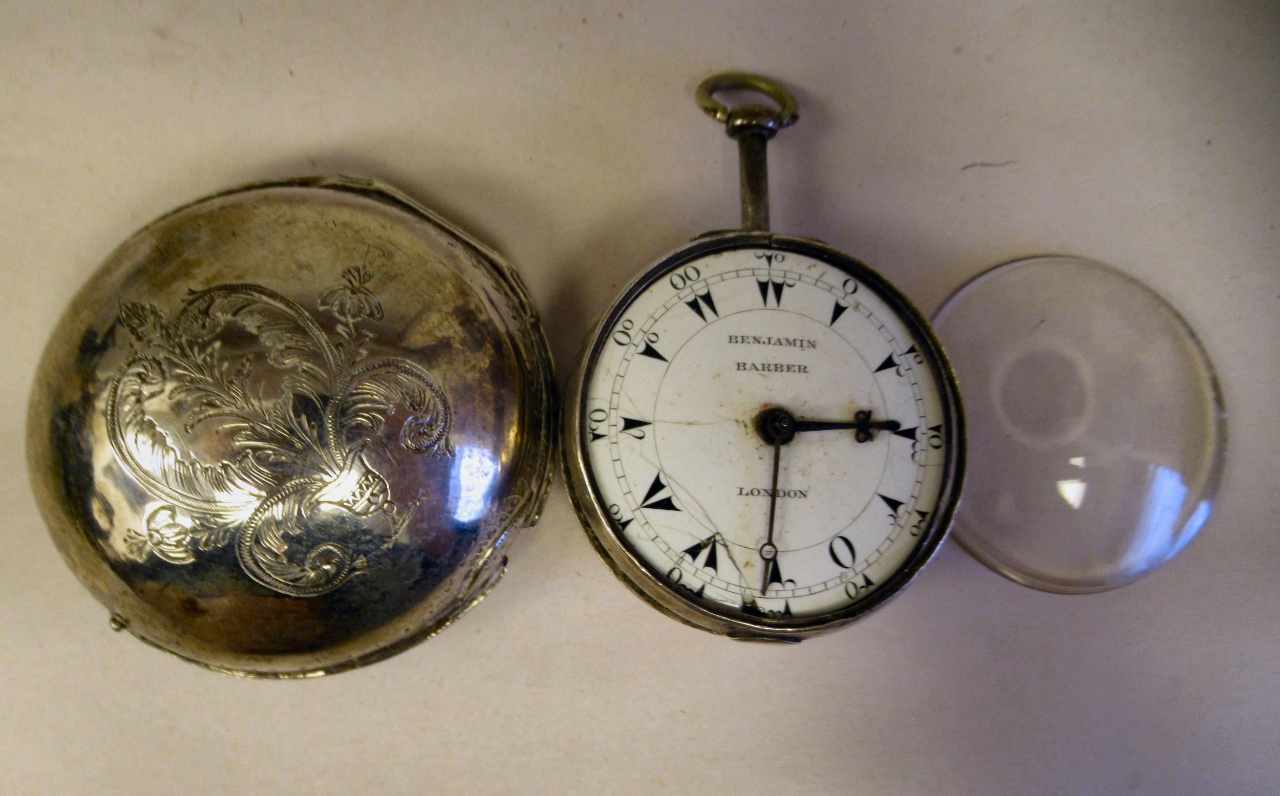 A George III 1792 silver pair cased pocket watch, the movement, No.7935, faced by a white enamel dial with Arabic numerals, inscribed Benjamin Barber, London