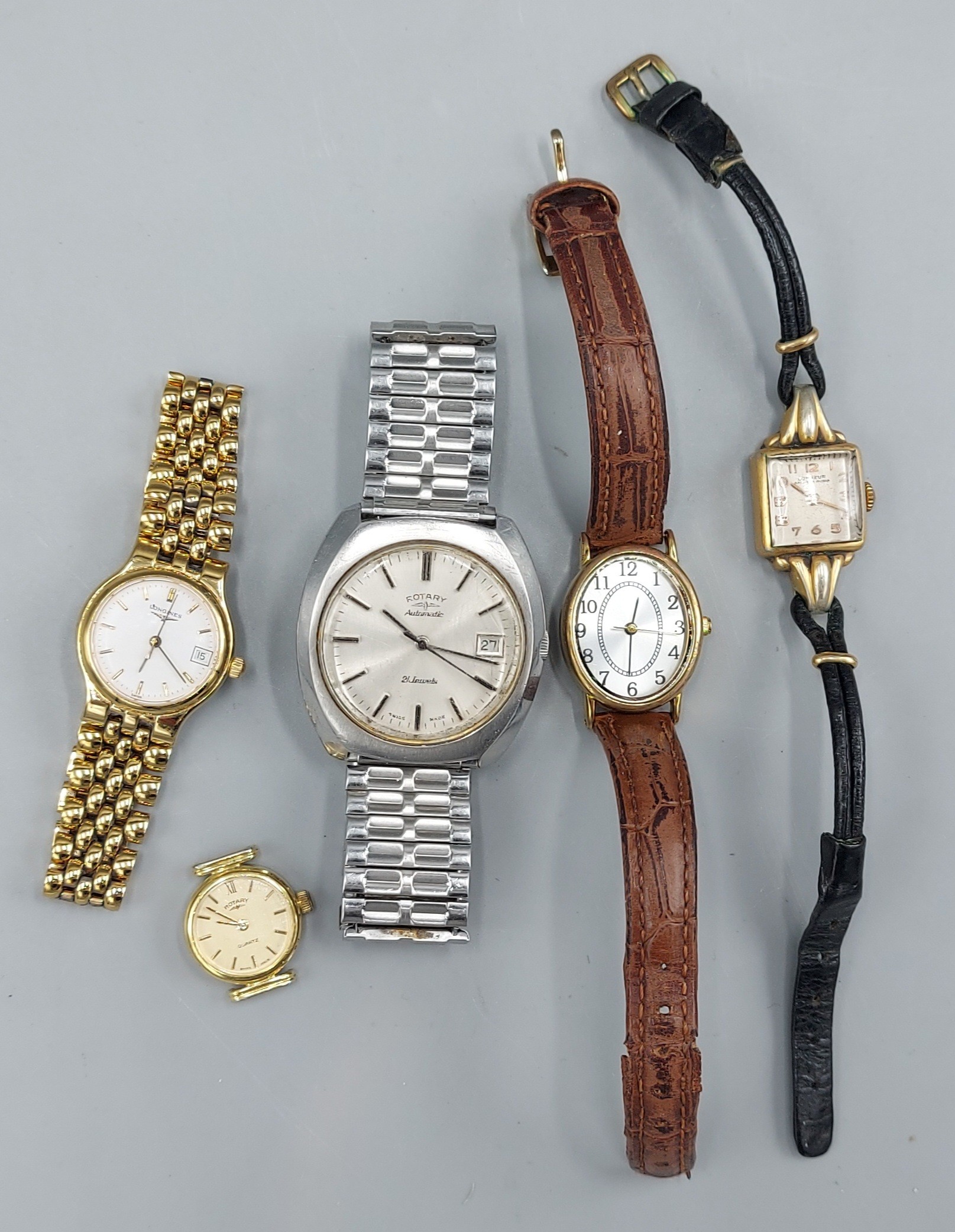 A Rotary automatic wristwatch together with a gold plated ladies wristwatch by Longines and three other ladies wristwatches