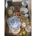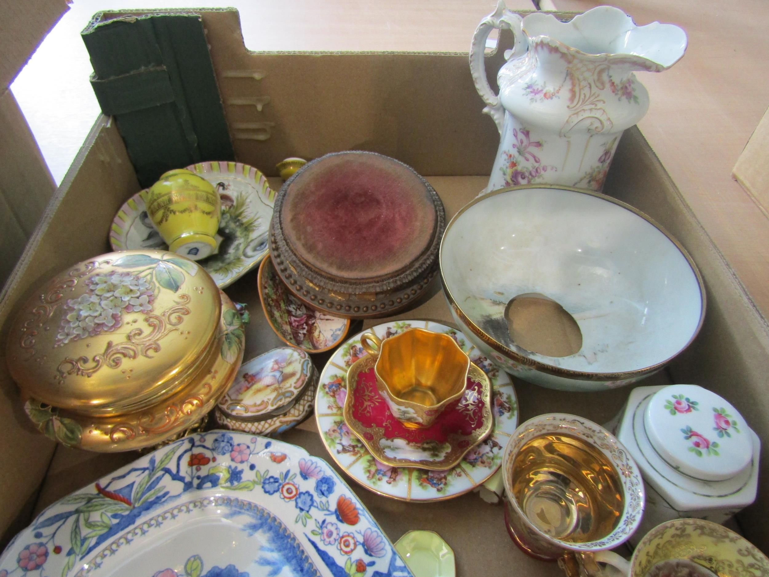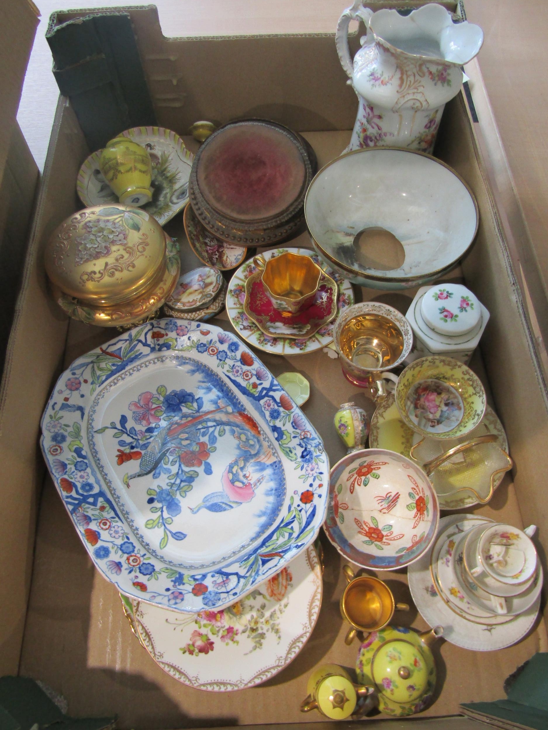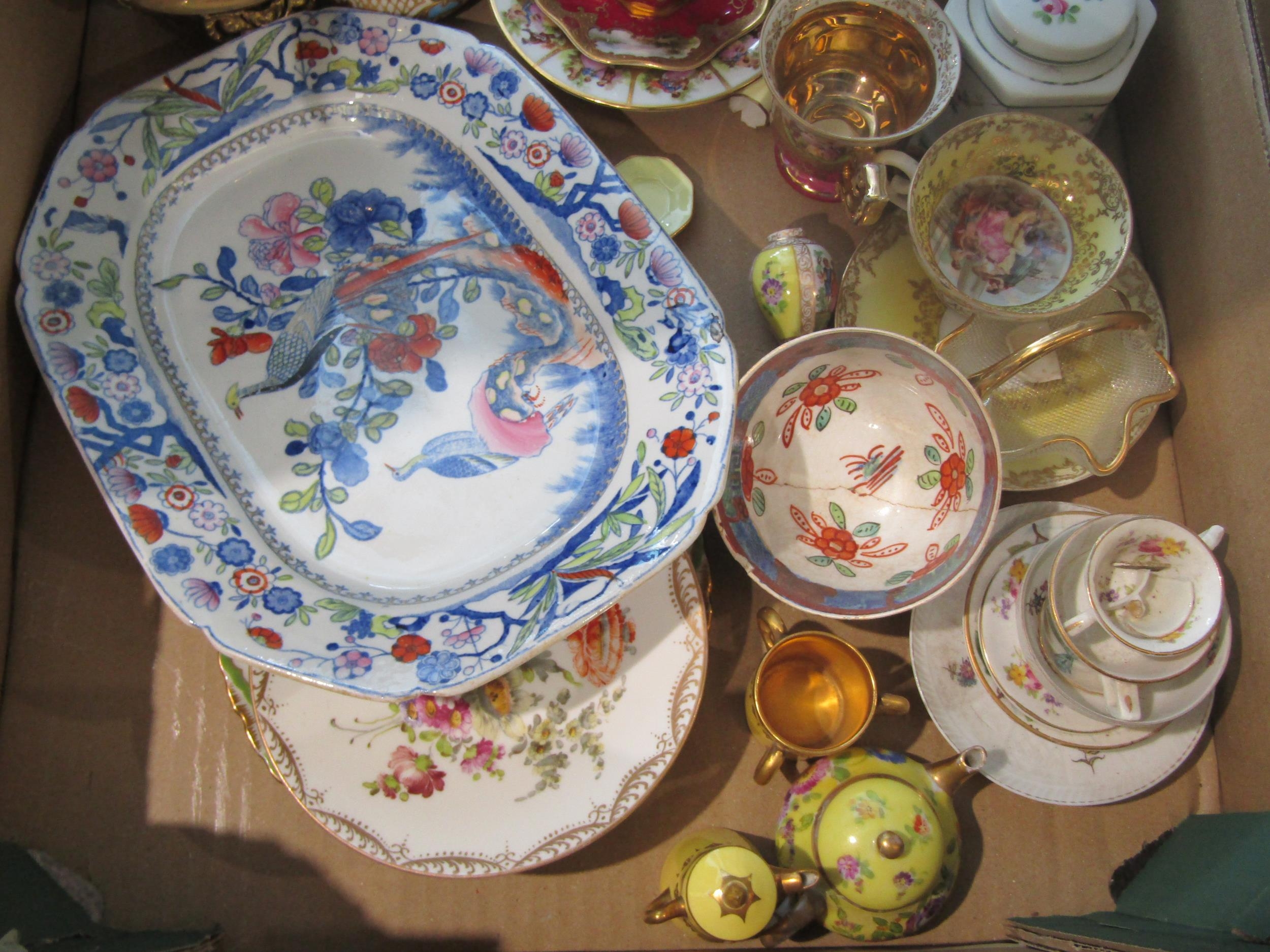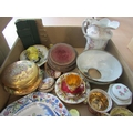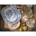 A box containing mixed ceramics to include a late 19th/early 20th Century Japanese Imari porcelain bowl and a small Ironstone Mason's serving platter. Some a/f