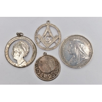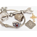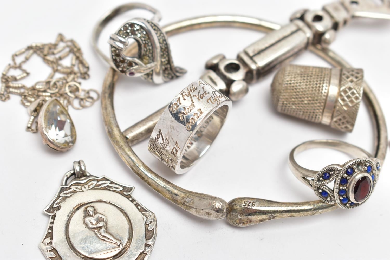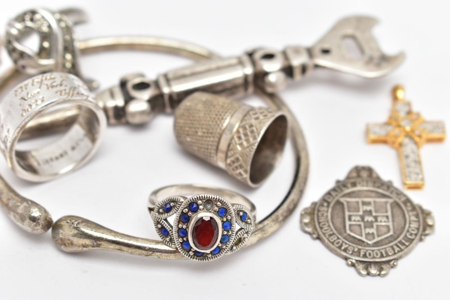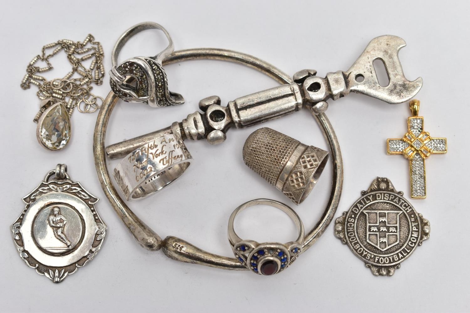 AN ASSORTMENT OF SILVER AND WHITE METAL ITEMS, to include a late Victorian silver thimble, hallmarked James Fenton, Birmingham 1897, length 23mms, a mid-20th century sporting medallion, hallmarked Fattorini & Sons Ltd, Birmingham 1949, length 39mms, a mid-20th century silver football competition medal AF, hallmarked Birmingham 1951, length 30mms, approximate gross weight of weighable silver 19 grams, together with seven further items, some stamped 925, some unmarked (condition report: football medal AF with minor damage to surmount and jump ring missing, further items AF)