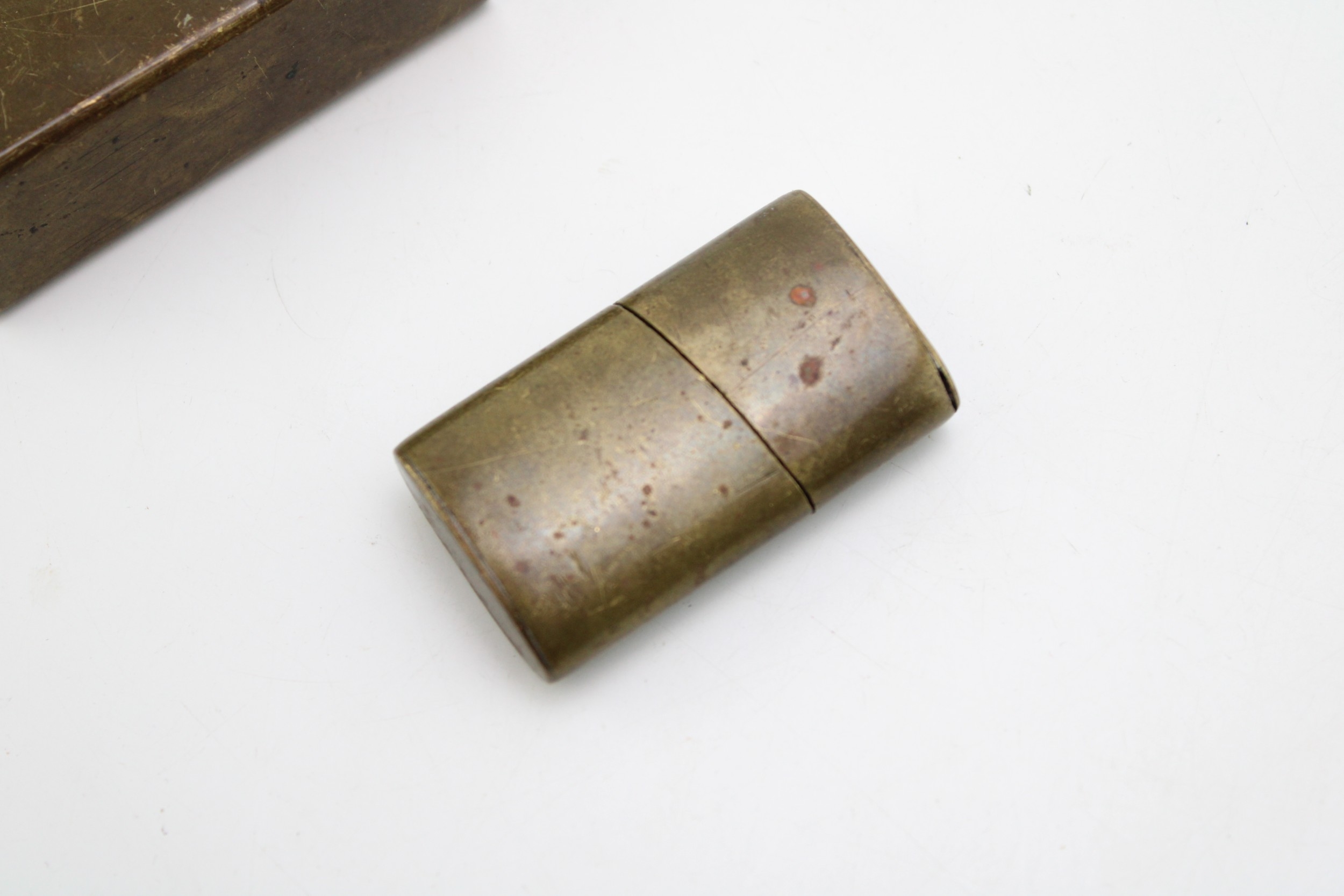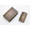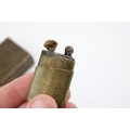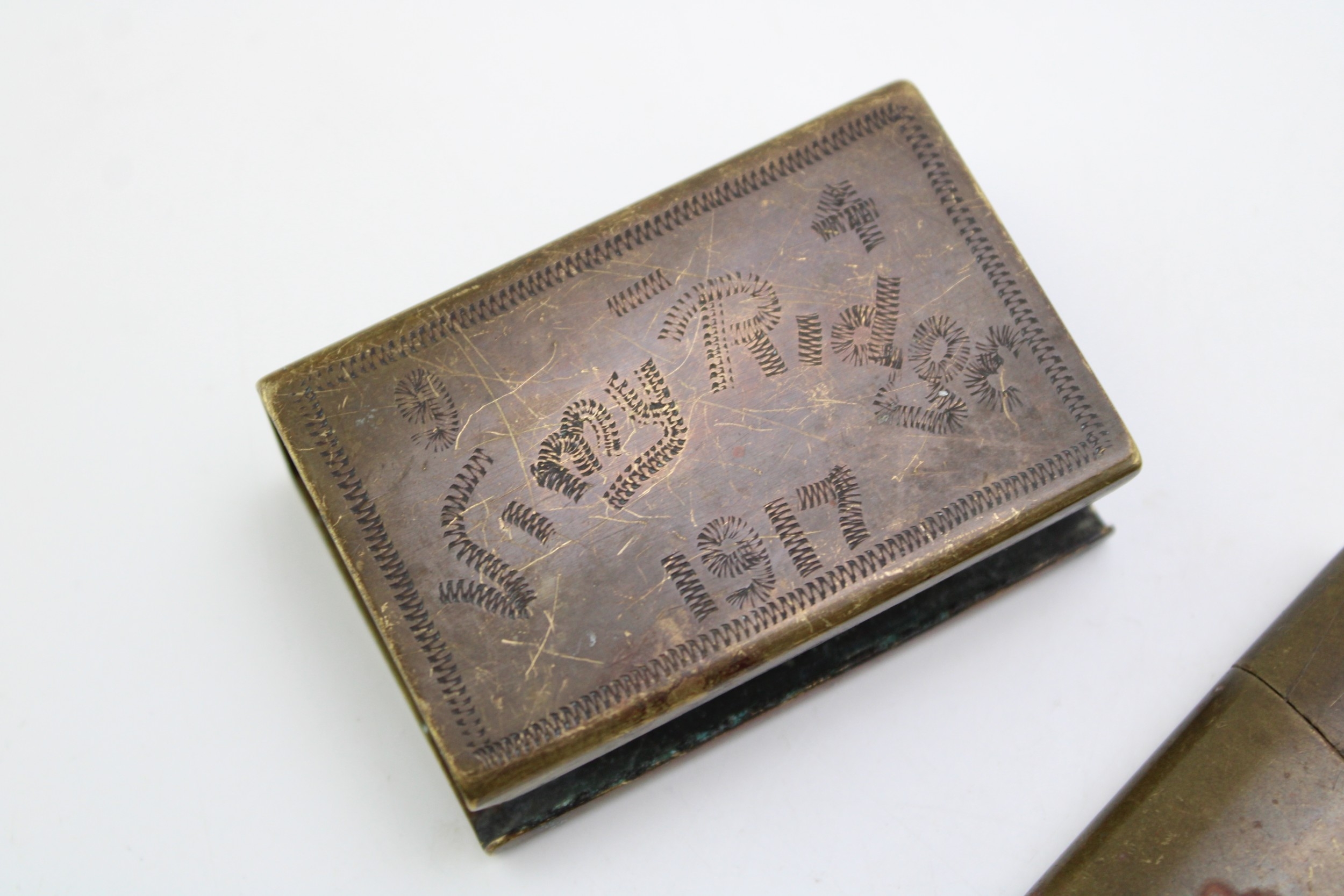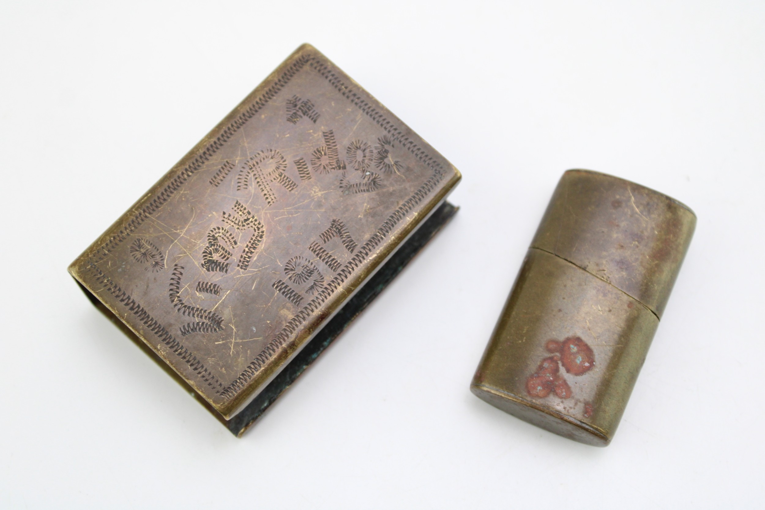 WWI brass trench art style matchbox holder together with a trench art lighter, 6cm tall, (2).