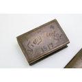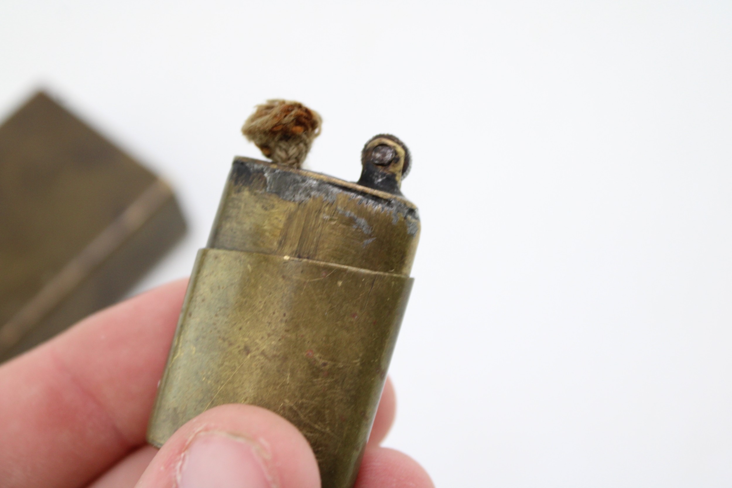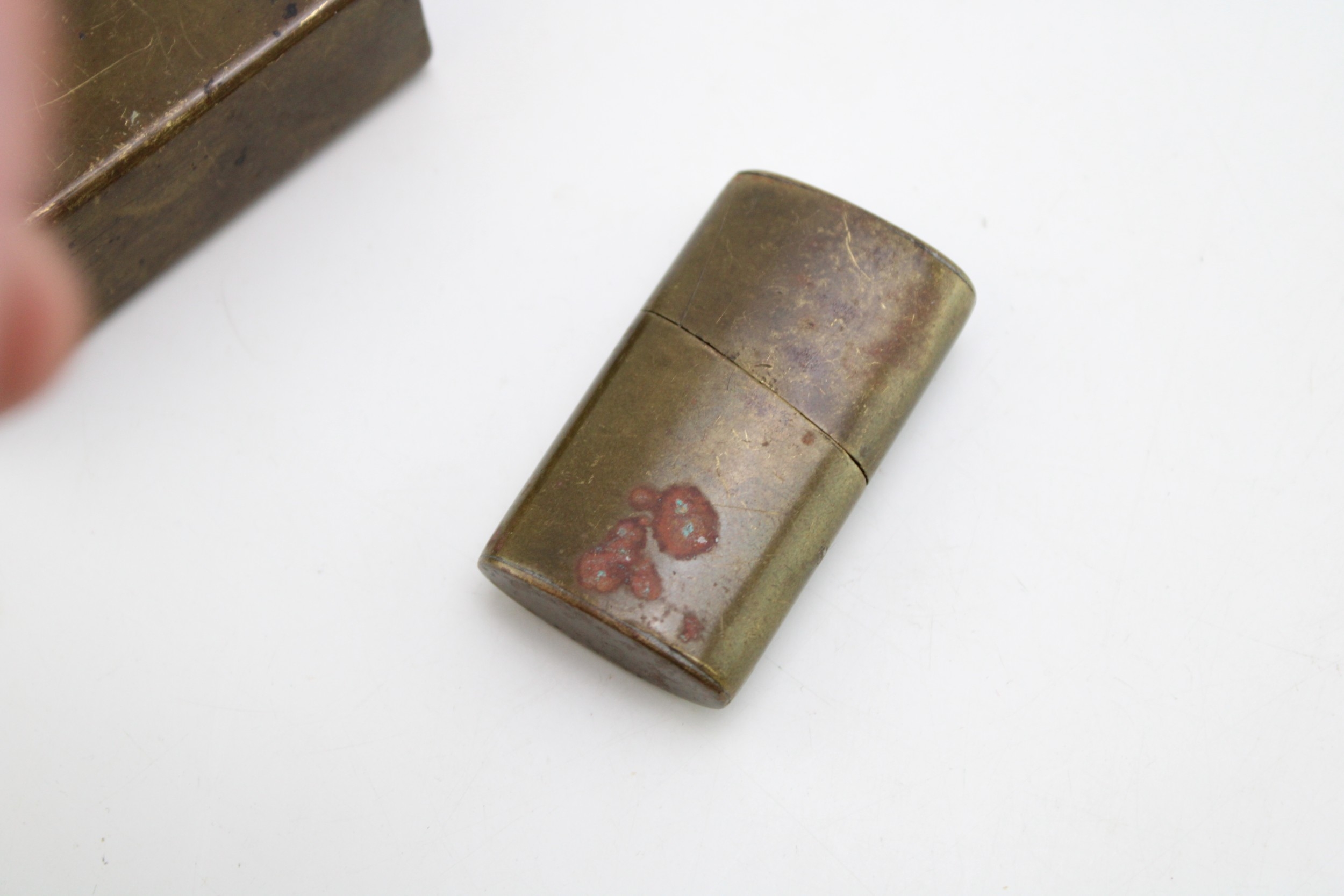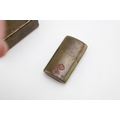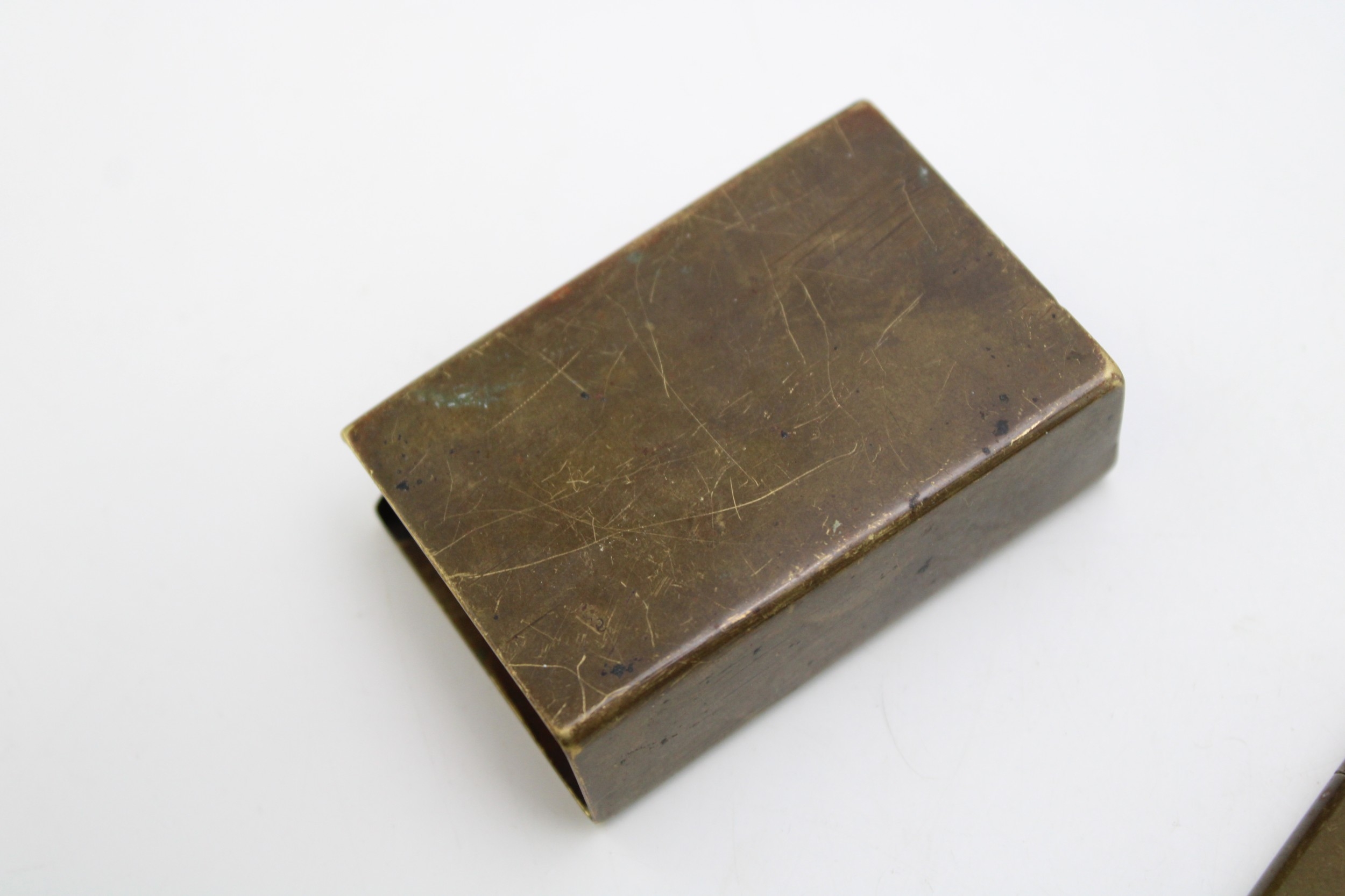 WWI brass trench art style matchbox holder together with a trench art lighter, 6cm tall, (2).