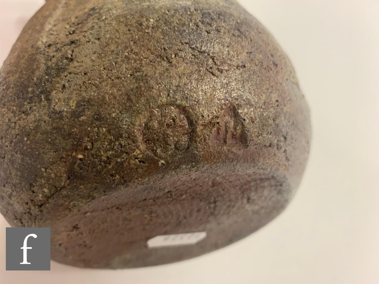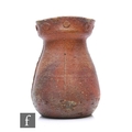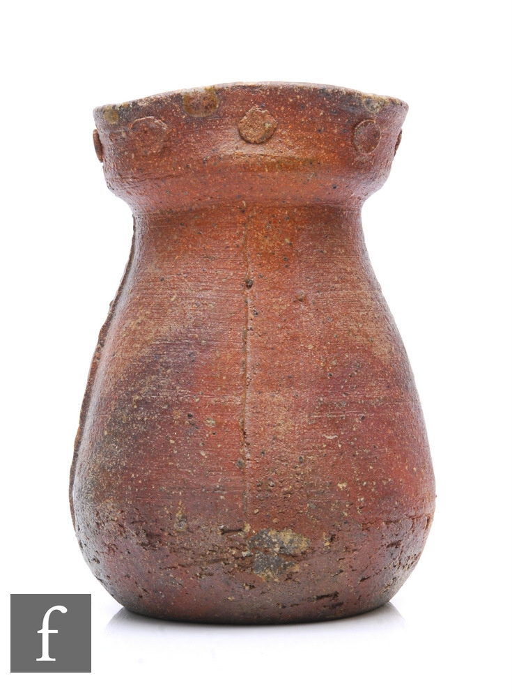 Janet Leach (1918-1997) - A St Ives Pottery stoneware vase, hand thrown ovoid form with raised organic form band collar with applied roundels, the ash glazed body with cut and applied bands, impressed seal marks, height 18cm.