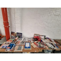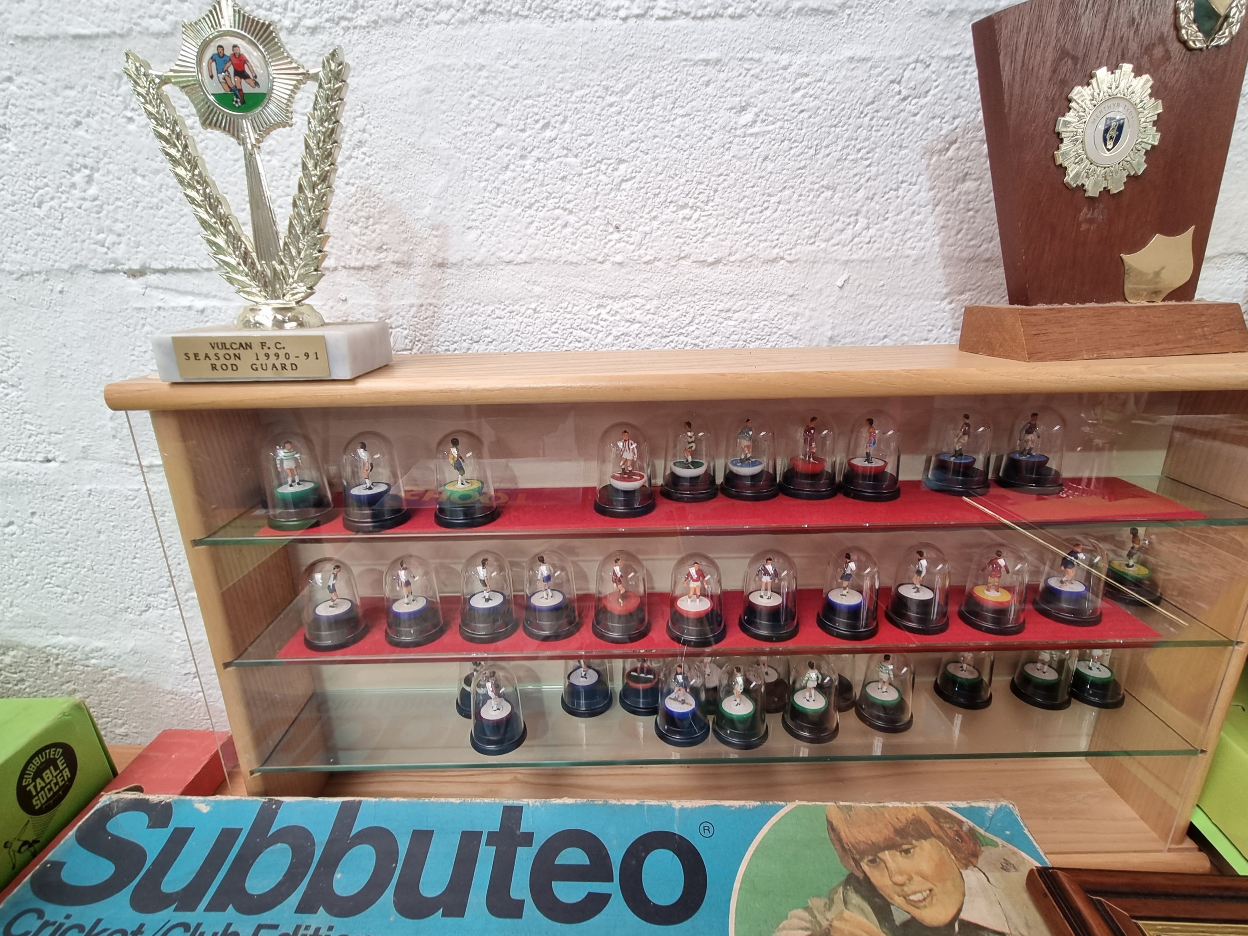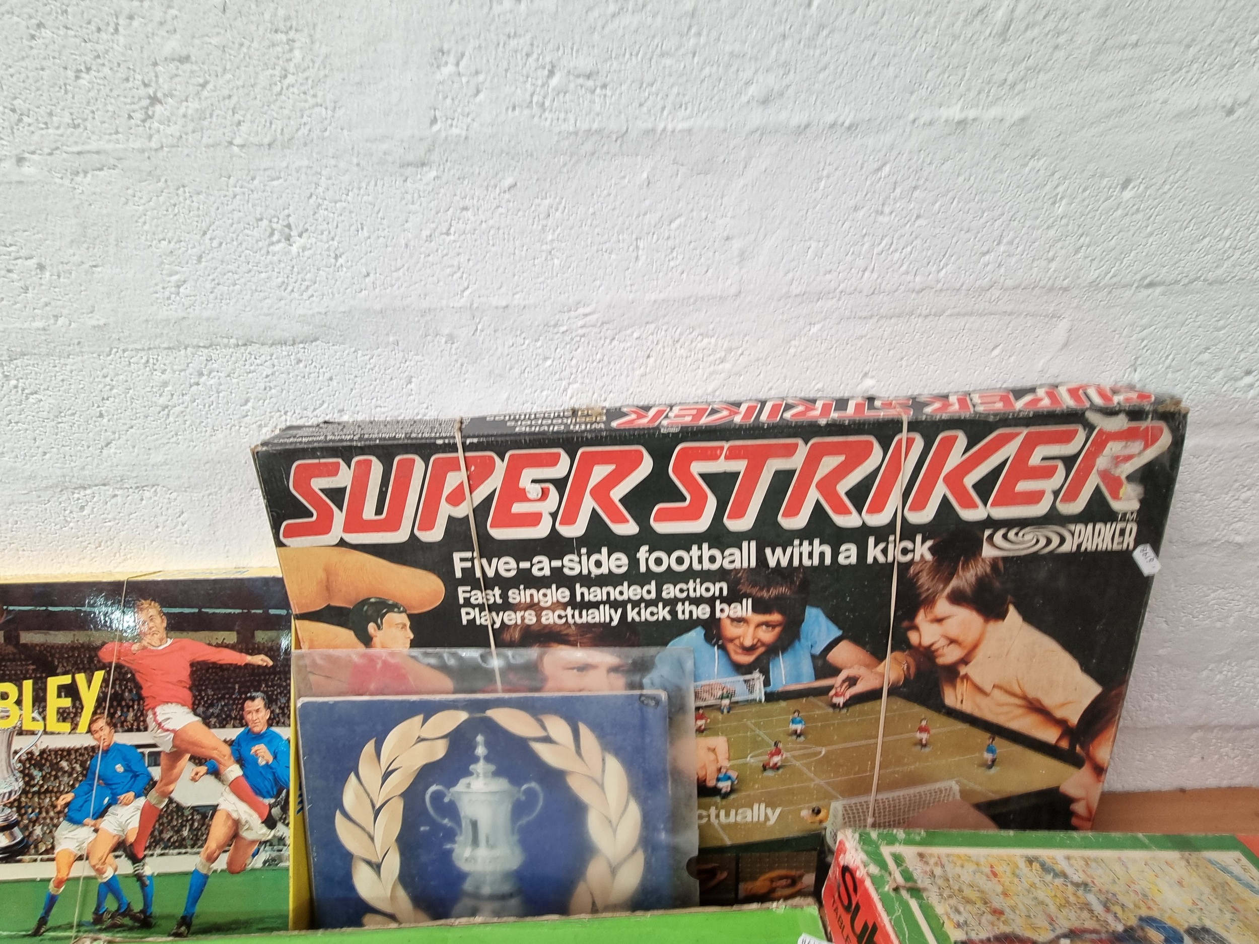 Very good condition football memorabilia to include football coins, pictures, programmes, domed Subbuteo players in a display cabinet, Super Striker game (complete), other boxed football games and a mixed selection of sports trophies and signs, etc
