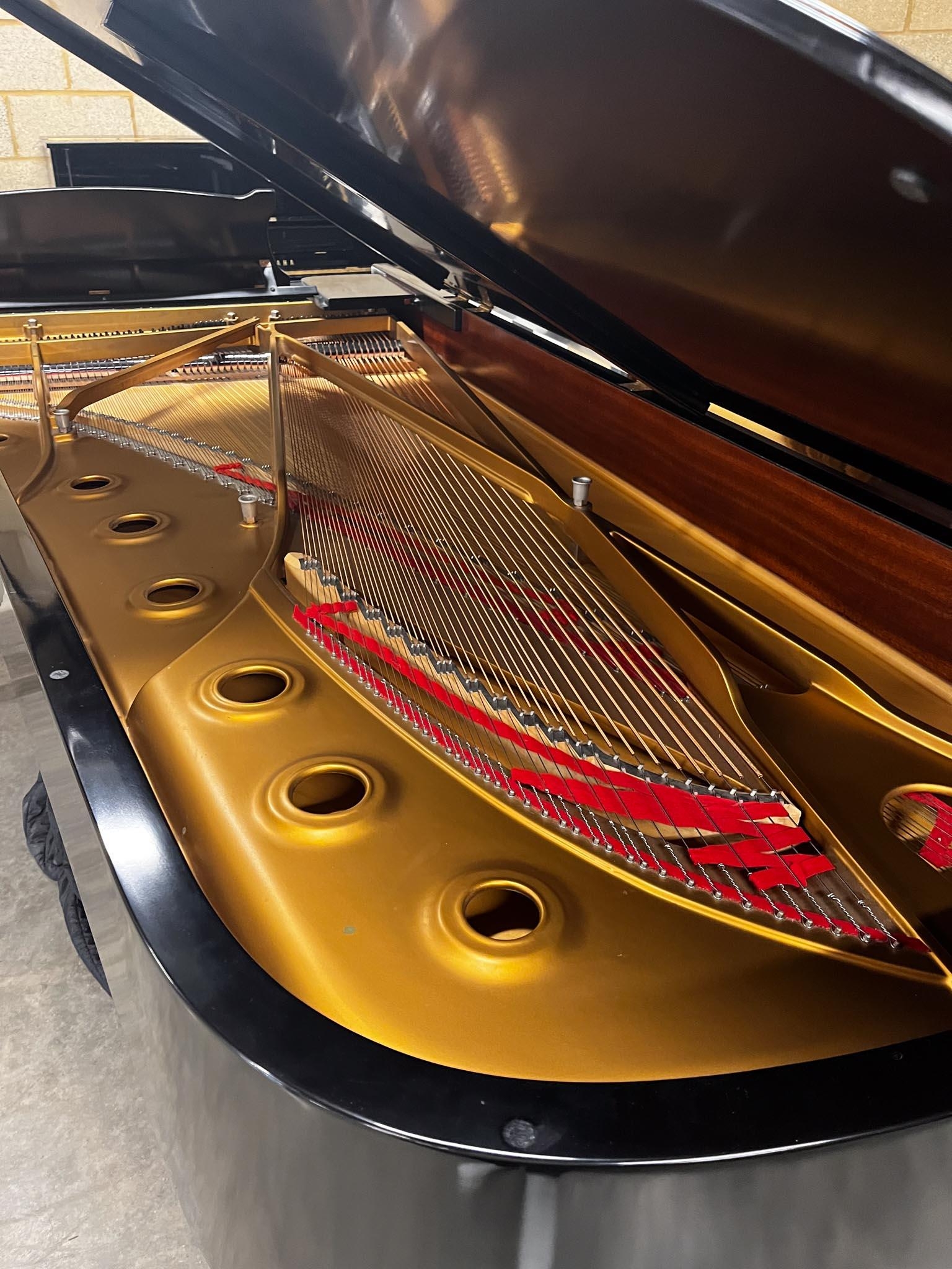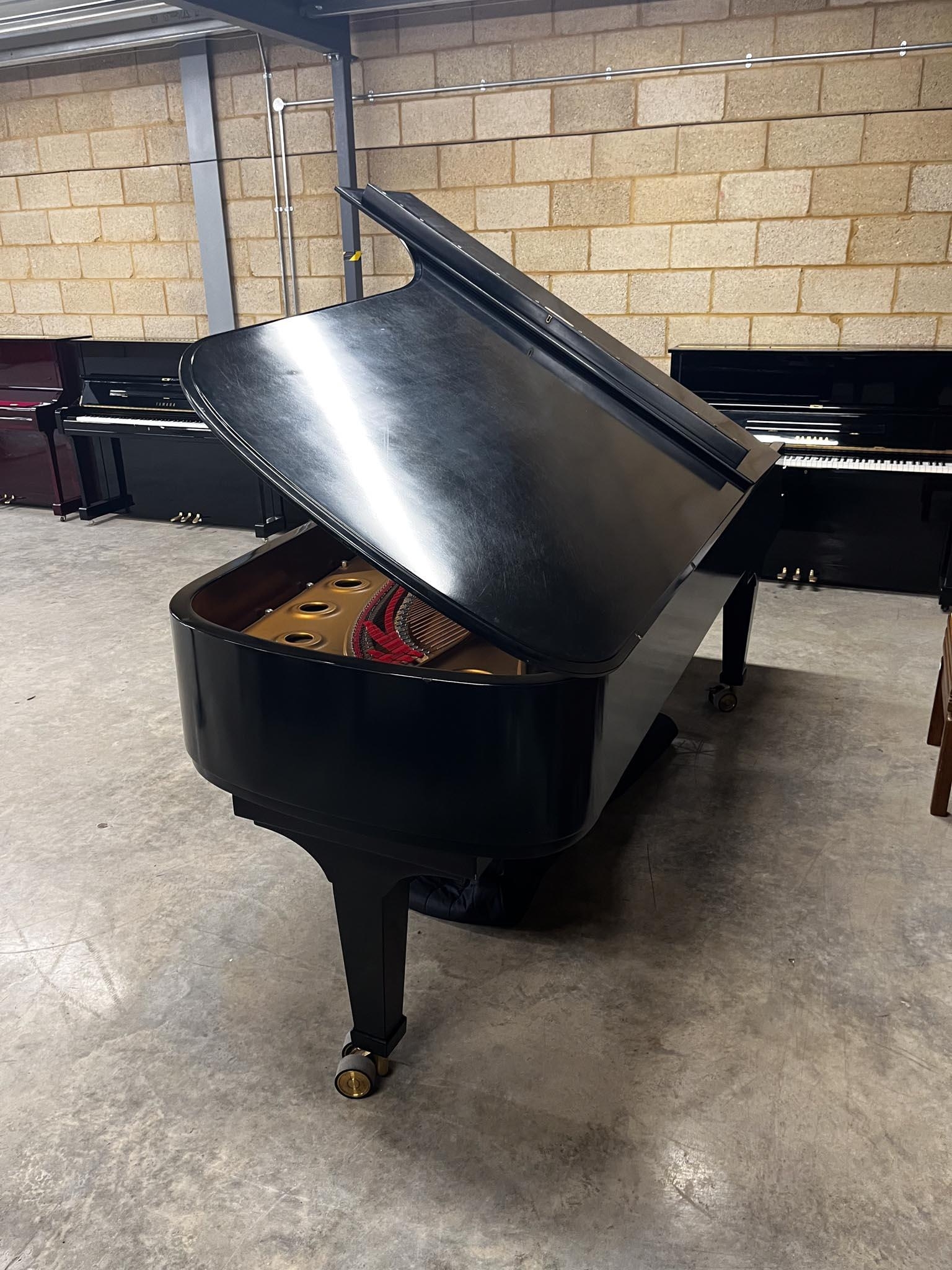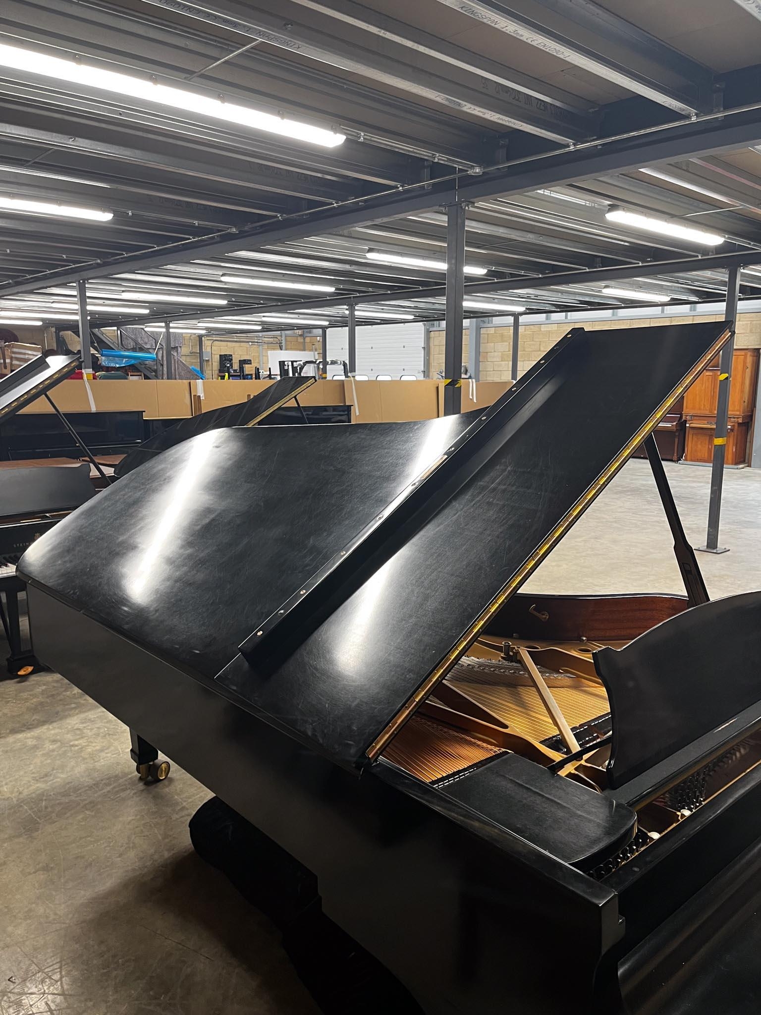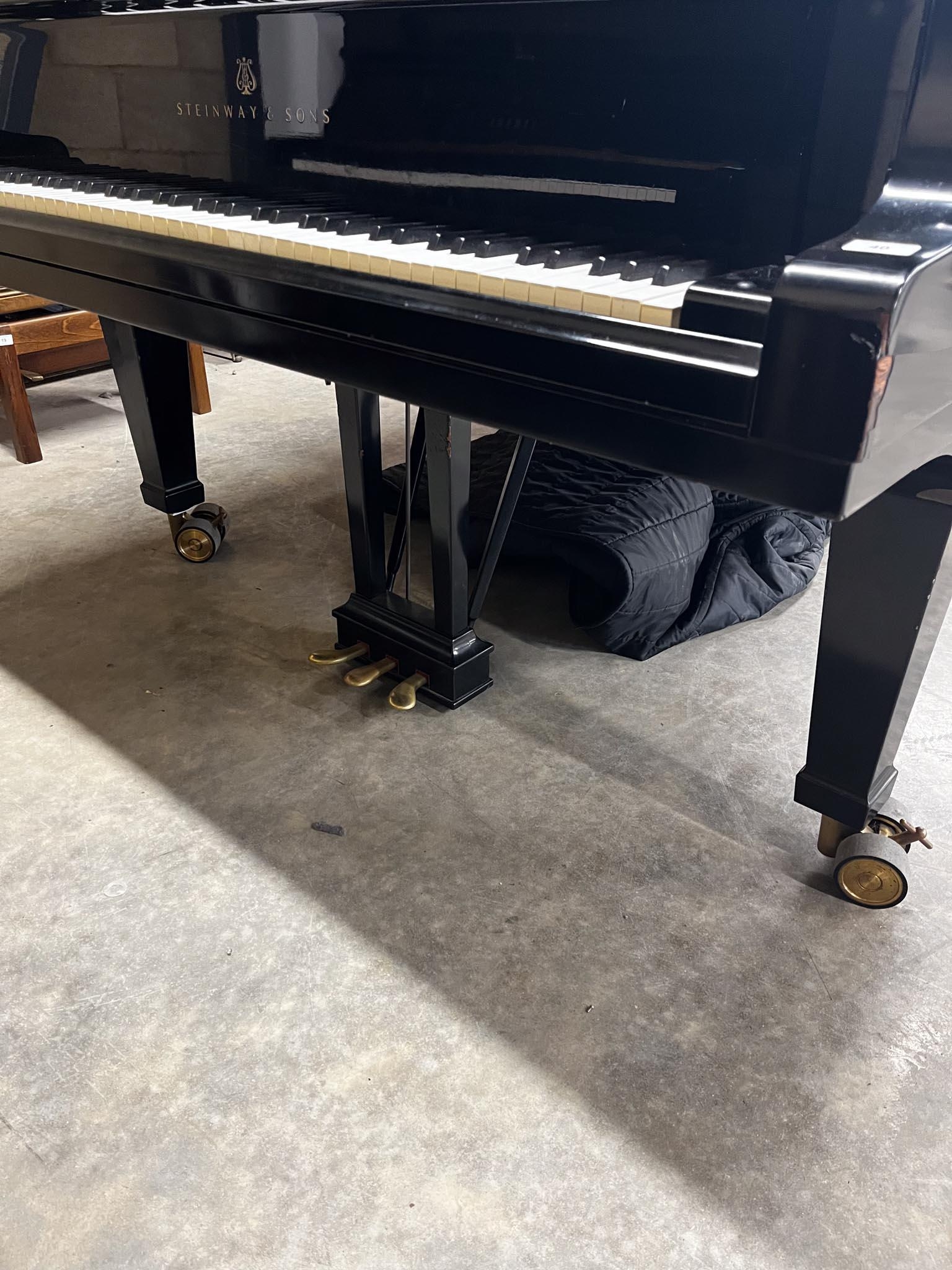 A 9ft Model D concert grand piano in a satin ebonised case on square tapered legs.