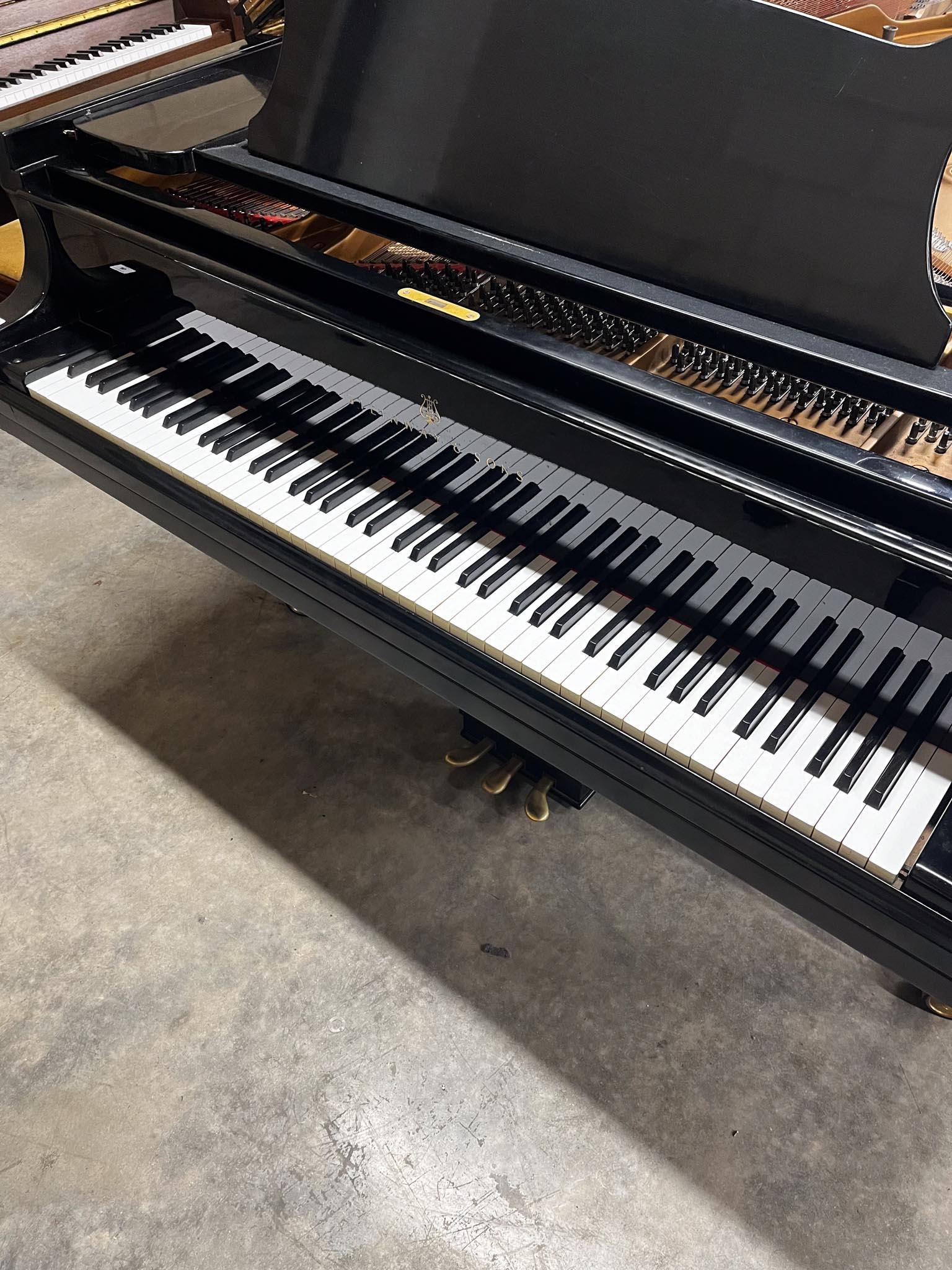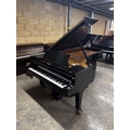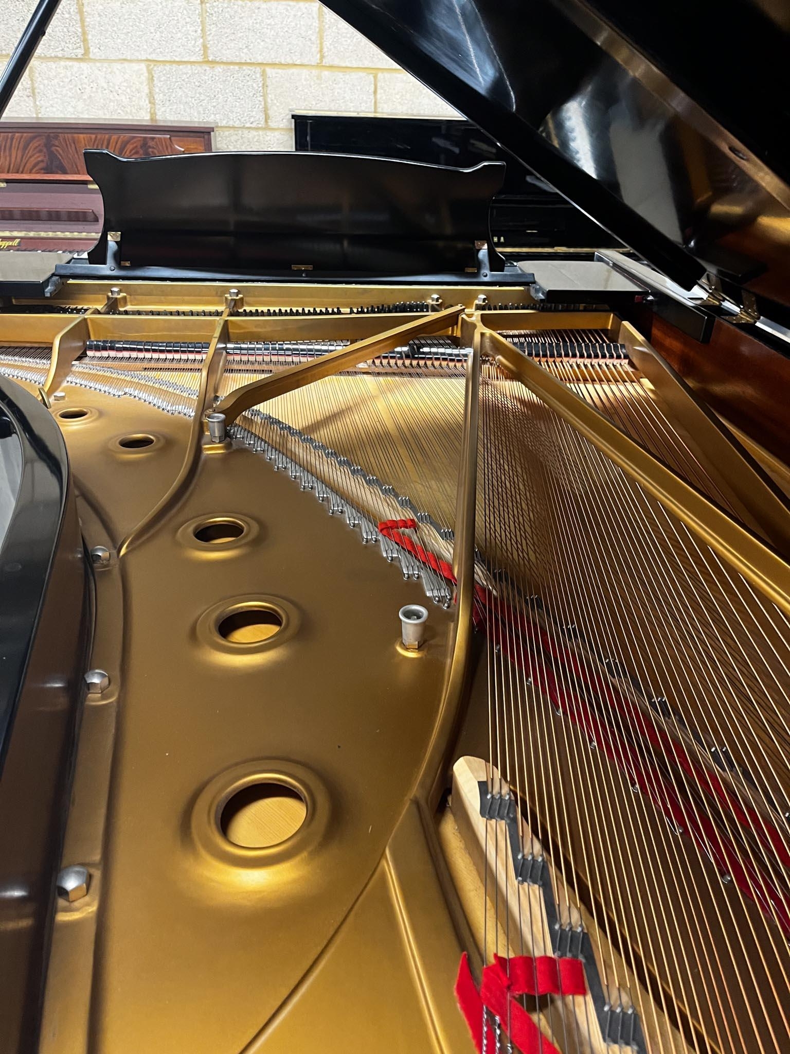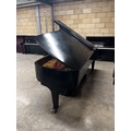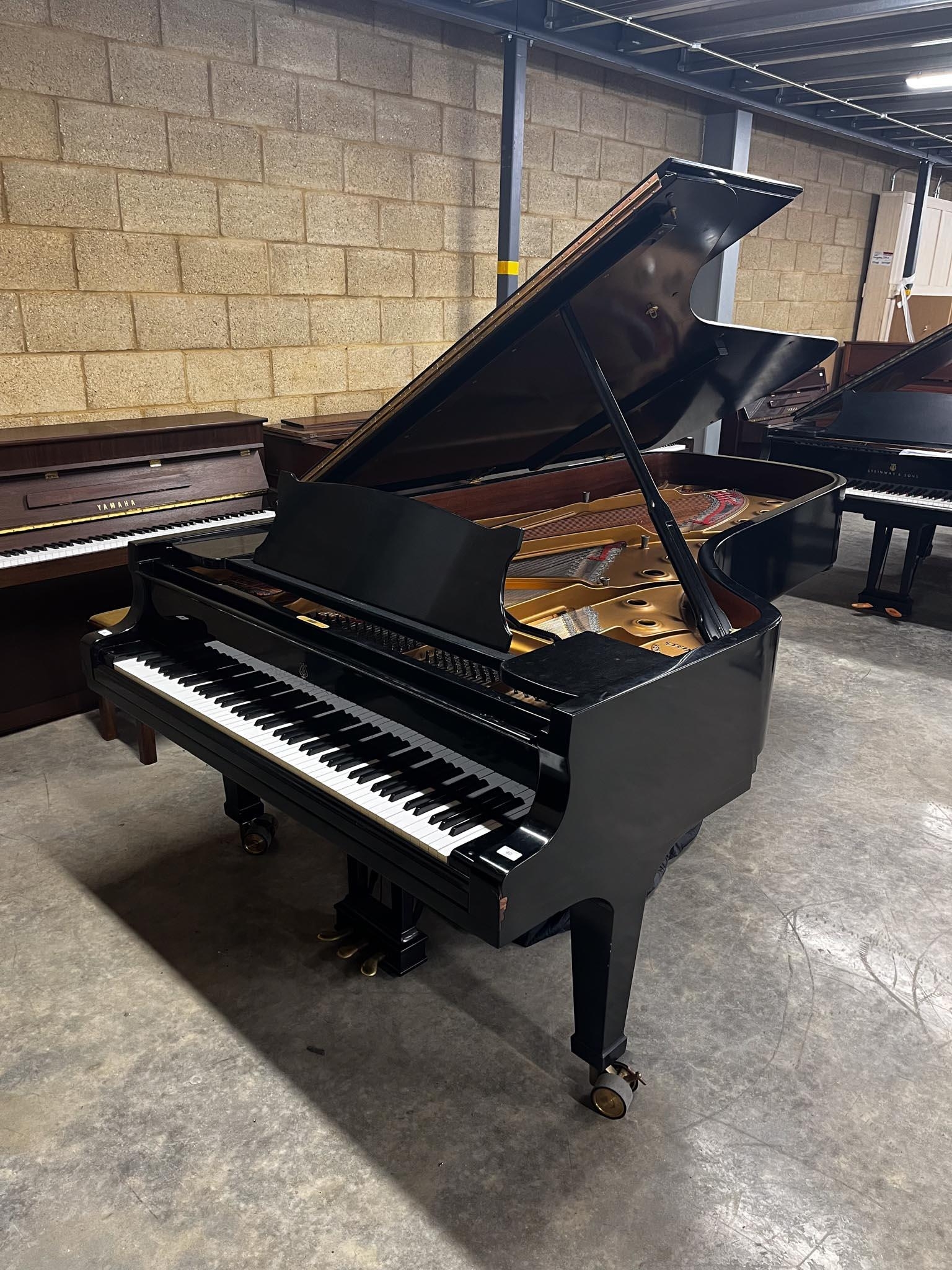 A 9ft Model D concert grand piano in a satin ebonised case on square tapered legs.