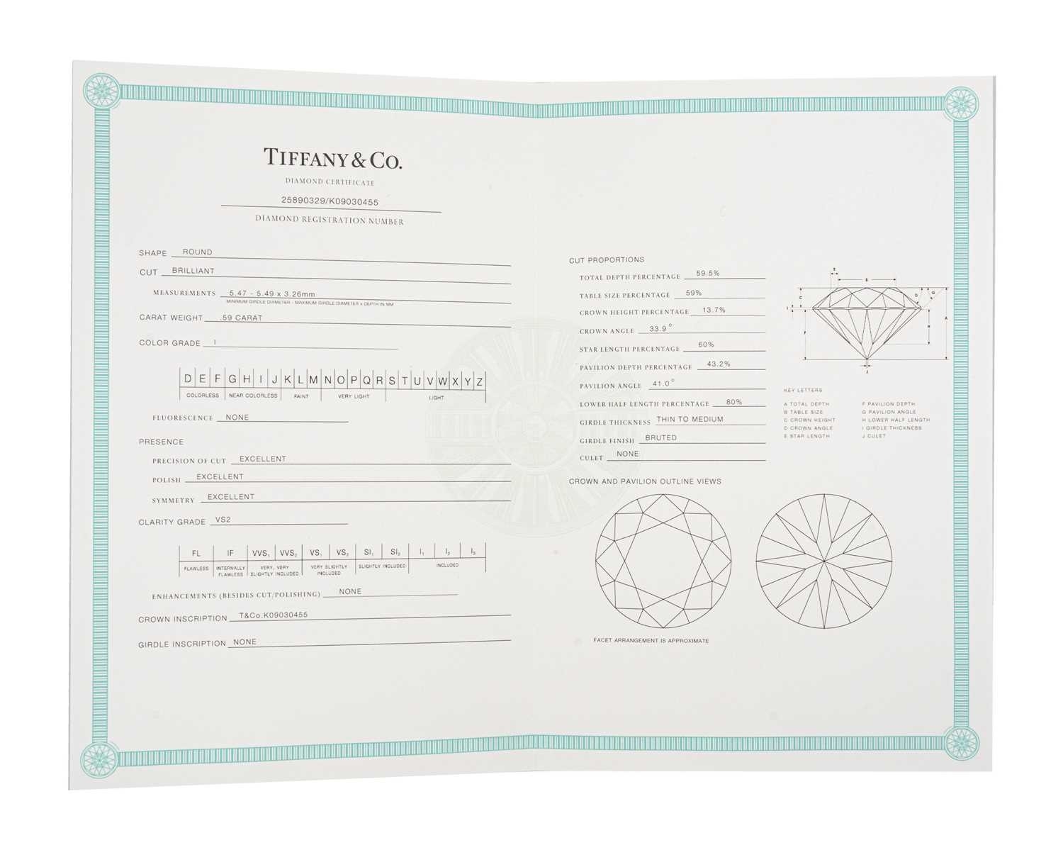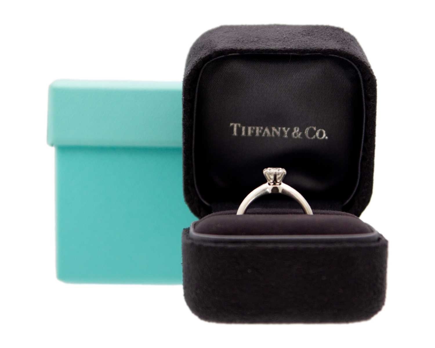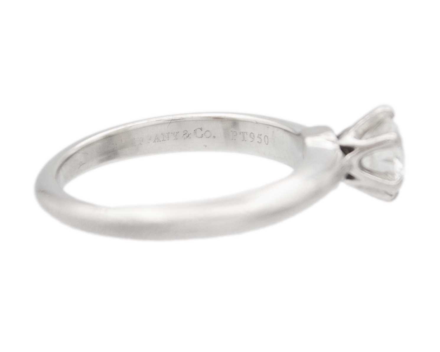 TIFFANY & CO - A good platinum 0.59ct diamond solitaire ring with certificate and box. The six-claw set diamond is assessed as 0.59ct, VS2 clarity and colour I, the ring is signed 'Tiffany & Co.', PT950, serial number 25890329, size J1/2, total weight 5.27g. No chips on a diamond, the shank has abrasions, good used condition.