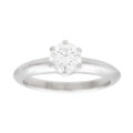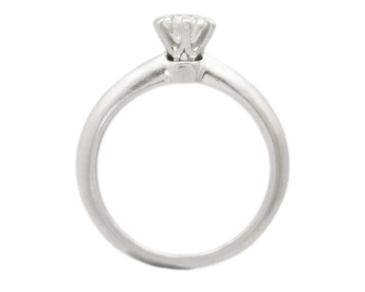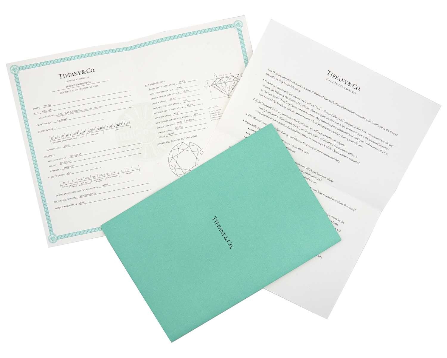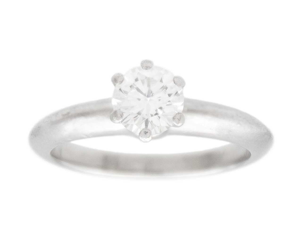 TIFFANY & CO - A good platinum 0.59ct diamond solitaire ring with certificate and box. The six-claw set diamond is assessed as 0.59ct, VS2 clarity and colour I, the ring is signed 'Tiffany & Co.', PT950, serial number 25890329, size J1/2, total weight 5.27g. No chips on a diamond, the shank has abrasions, good used condition.