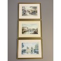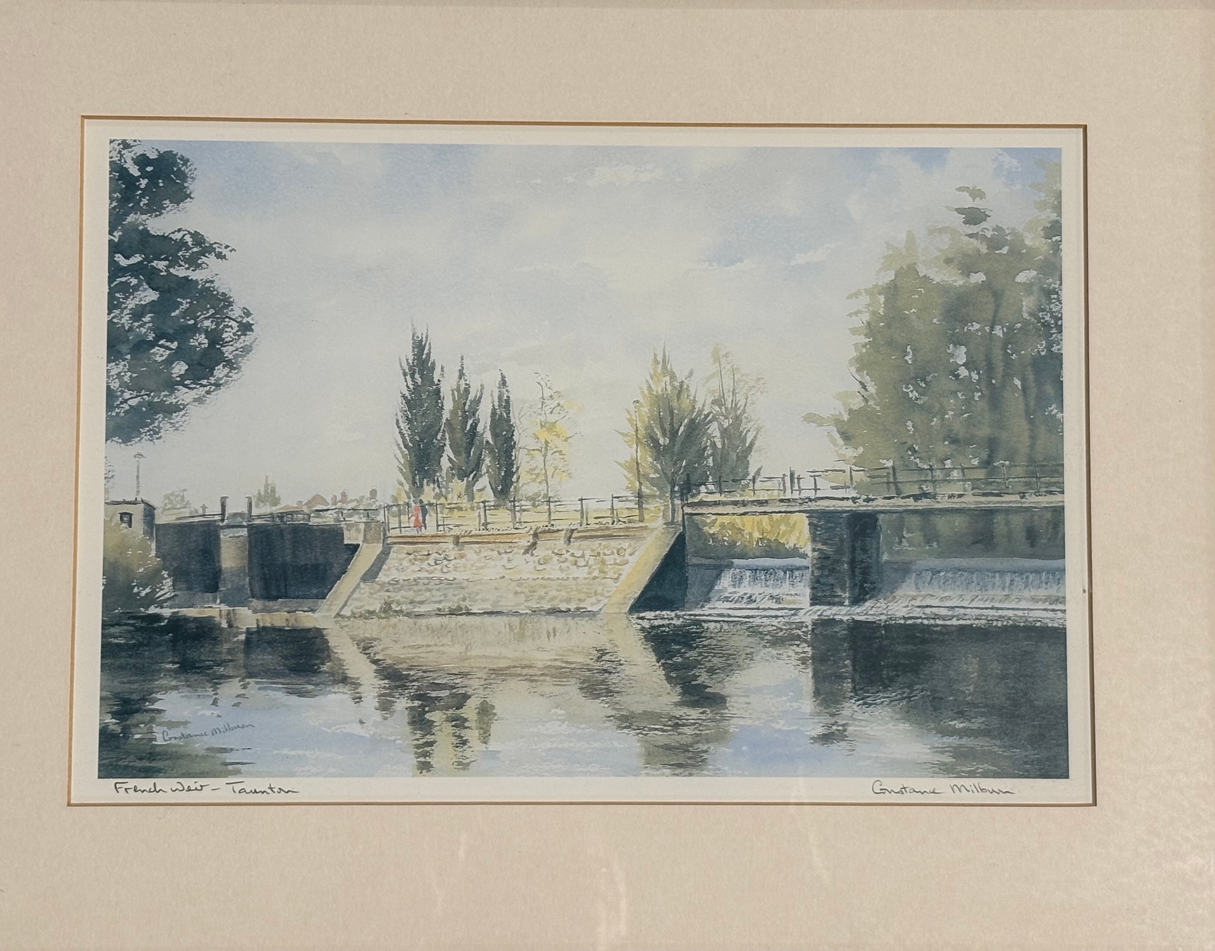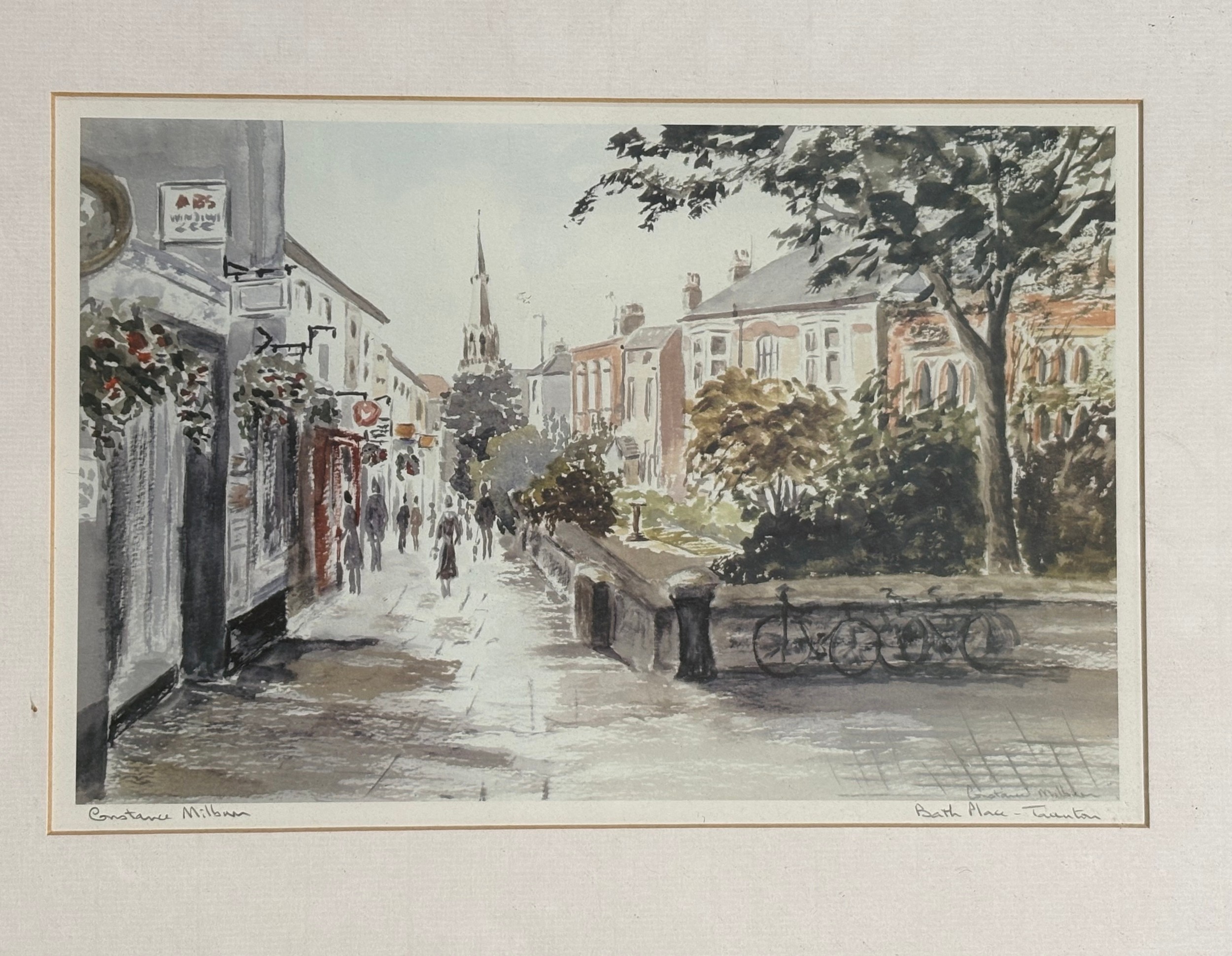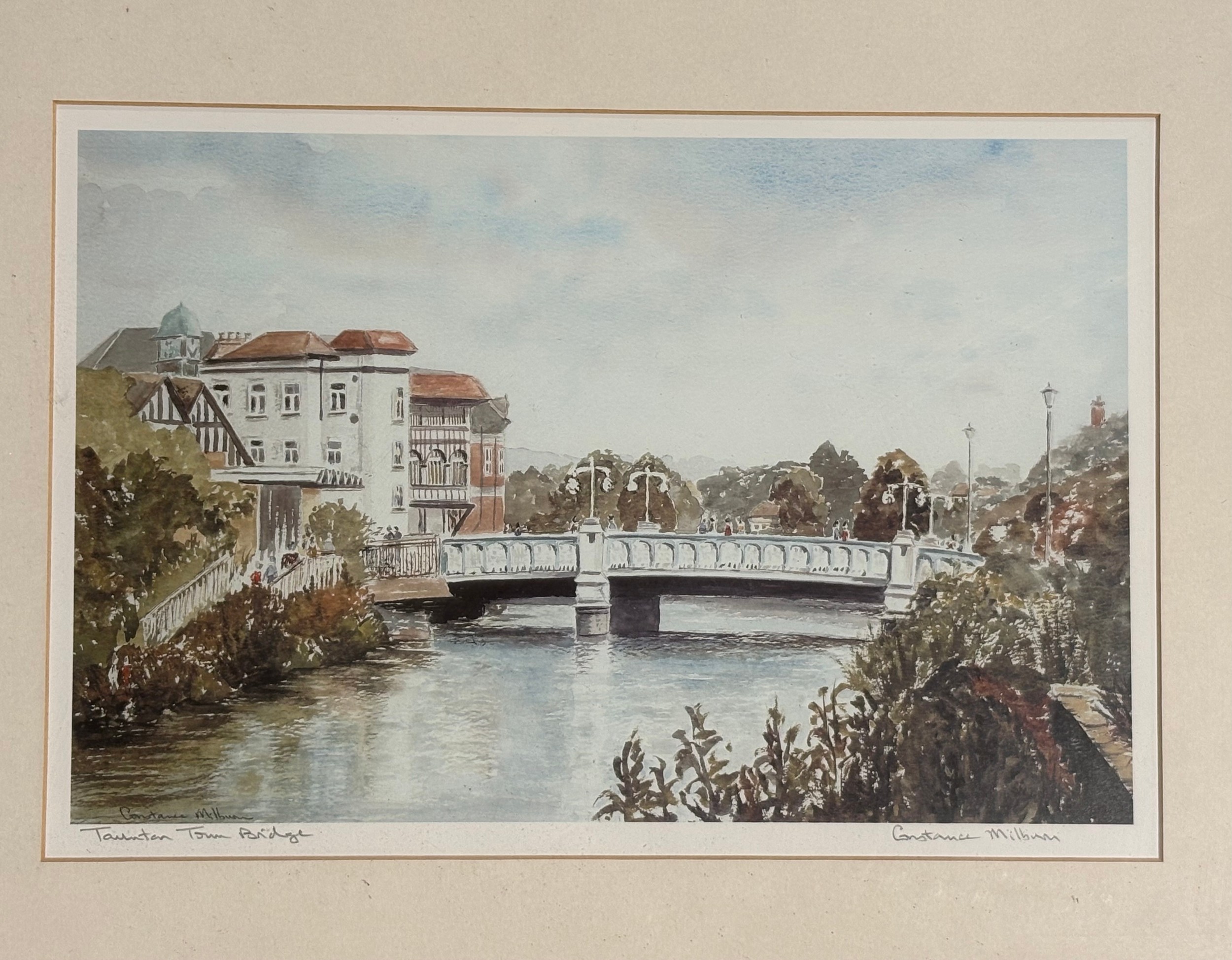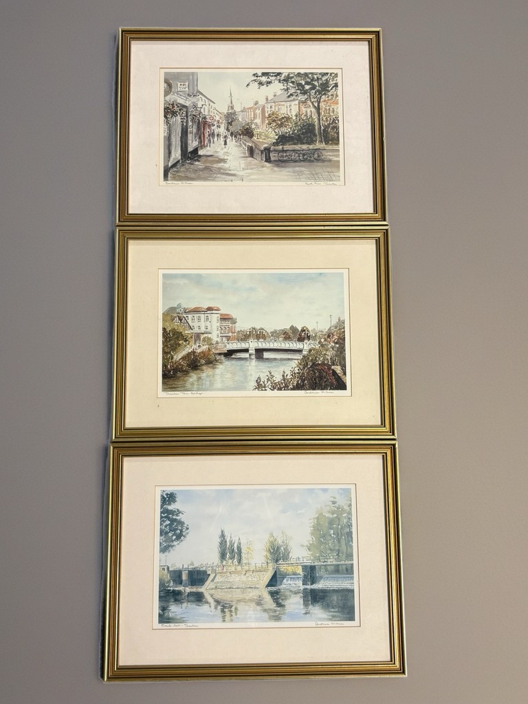 3 framed prints of Taunton, French Weir, Town Bridge and Bath Place, all signed Constance Milburn