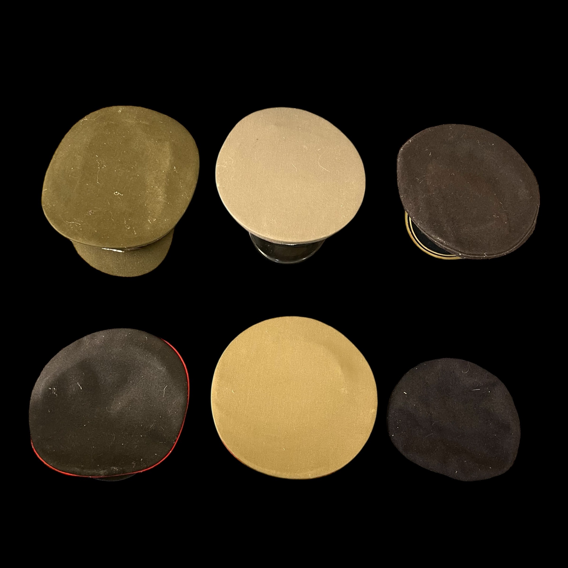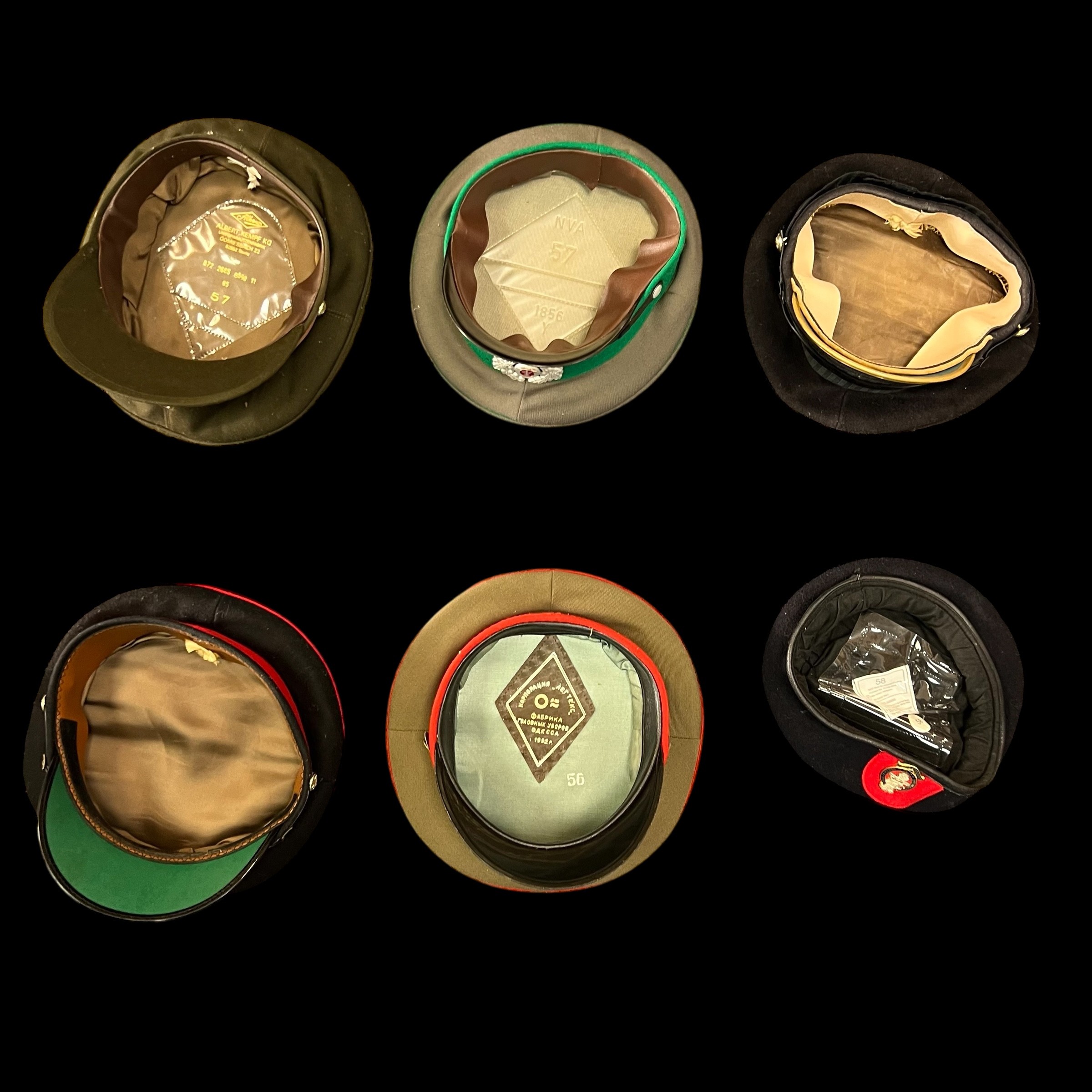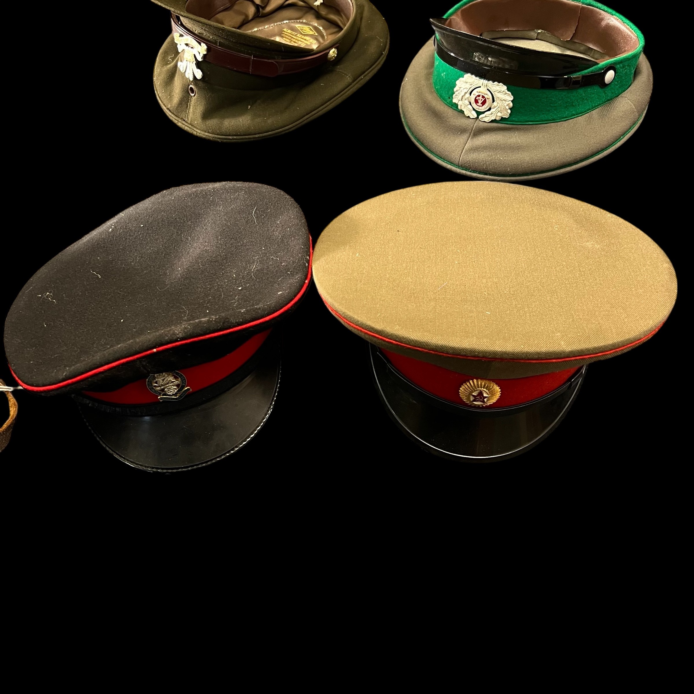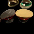 Military hats, range of six military hats / caps, includes; British Military peaked cap (Welsh Guards), East German Cap NVA, British Army Officers cap with Royal Hussars badge, Royal Marines beret with Princess of Wales badge, Princess of Wales Regiment peaked cap and Soviet visor hat. (6)