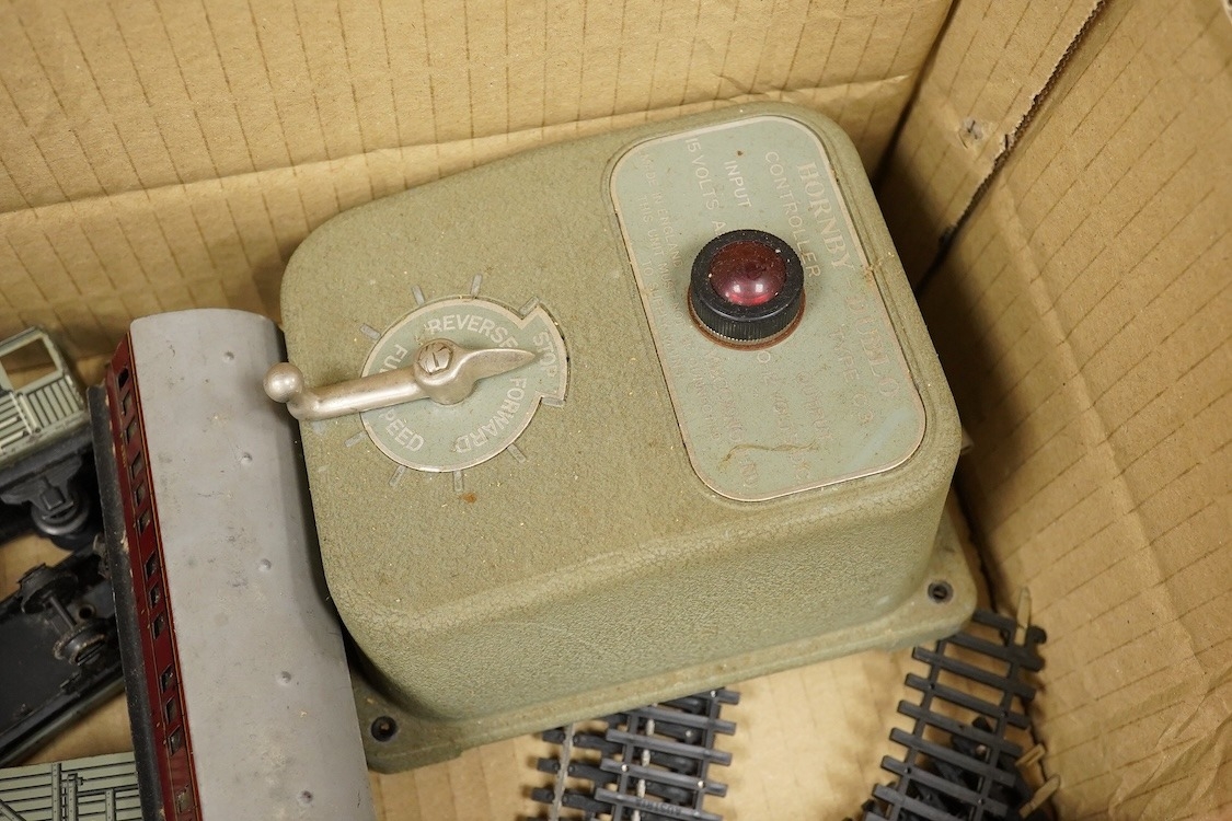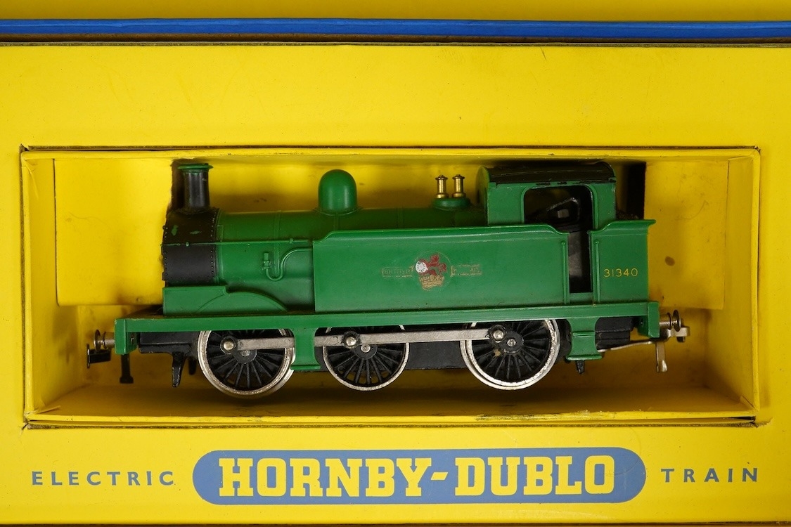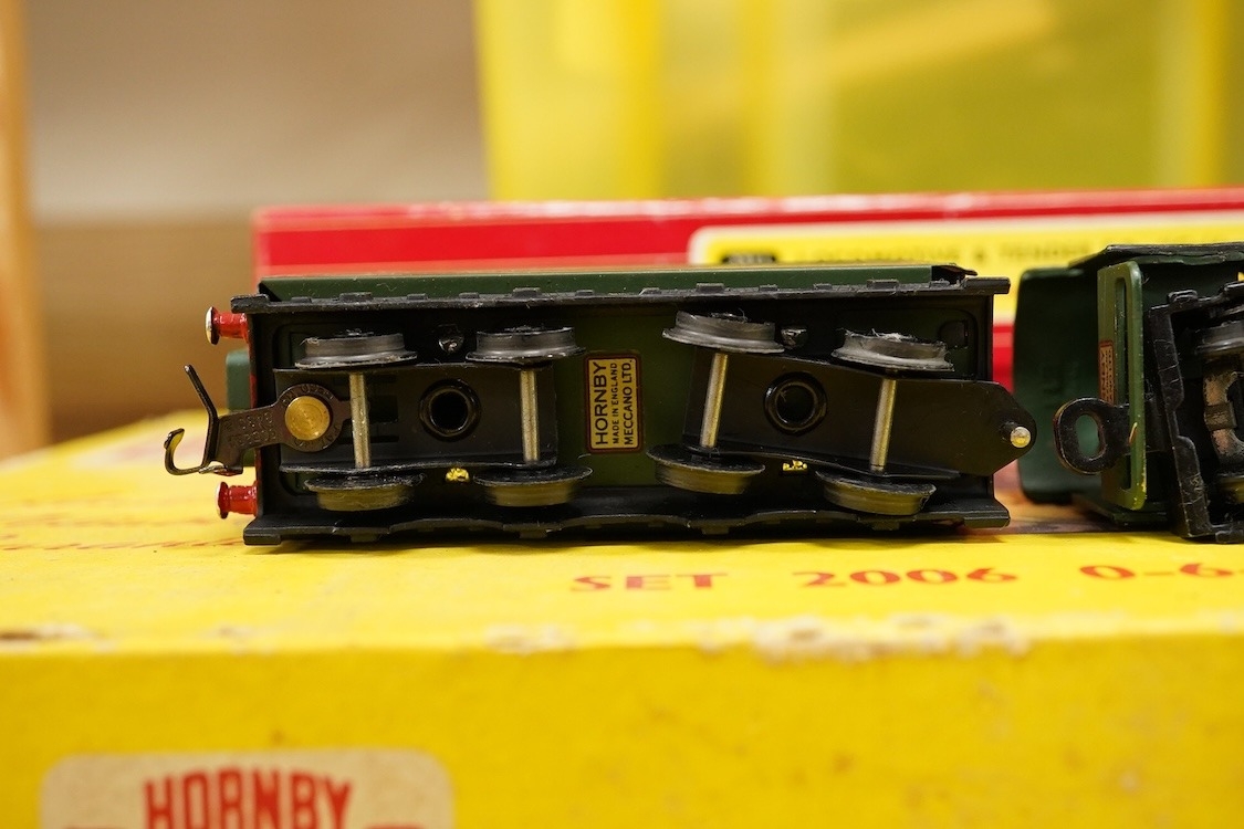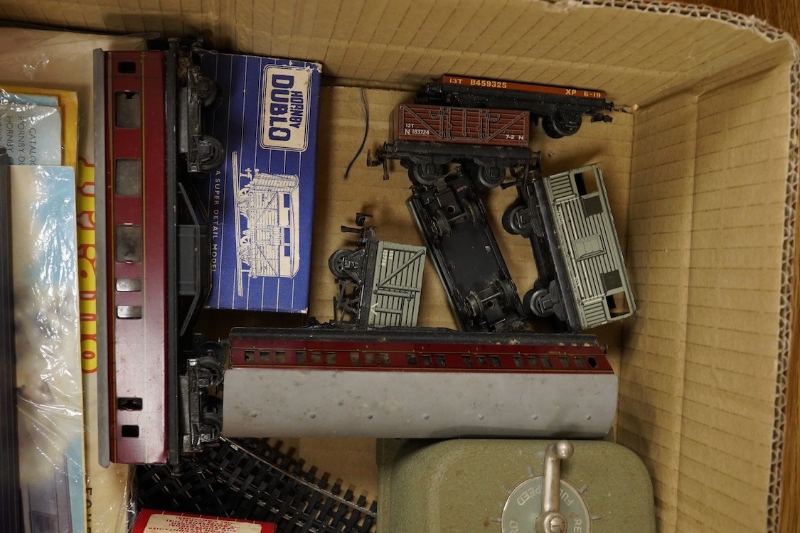A collection of Hornby Dublo for 2 rail running, including; a boxed BR class A4 4-6-2, Golden Fleece 60030, (2211), together with three boxed bogie coaches and two wagons, plus four unboxed wagons, and a complete box set 2006 0-6-0 Tank Goods Train, ten Hornby Dublo and Meccano catalogues, and a few other items