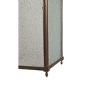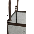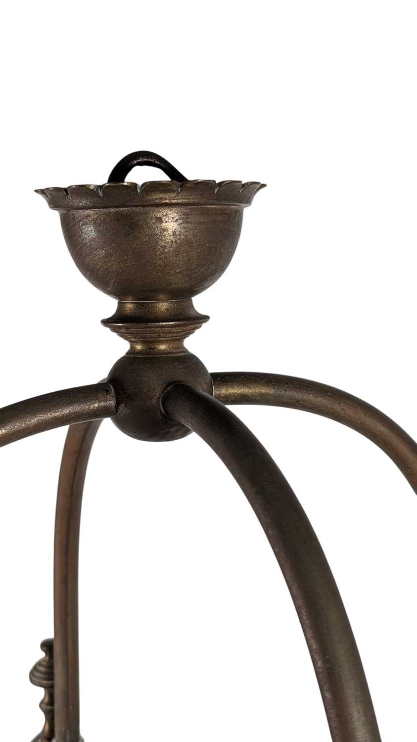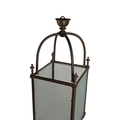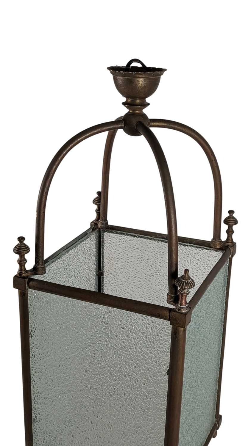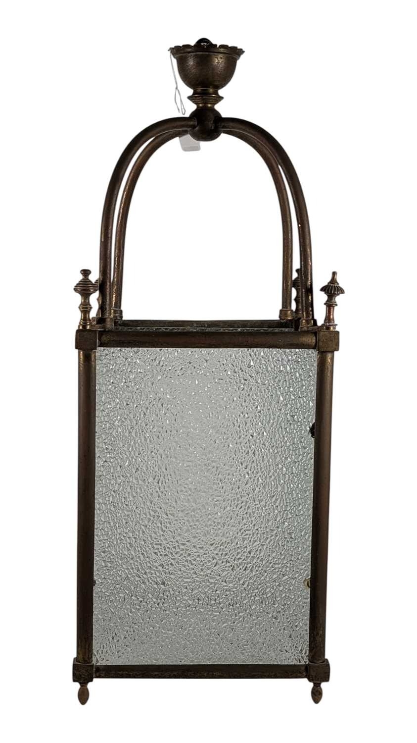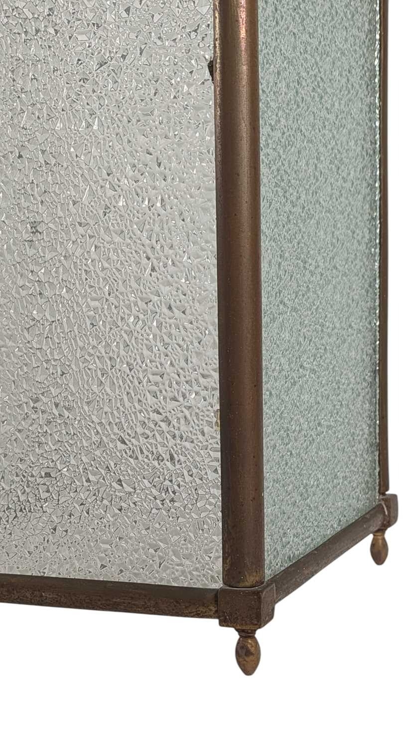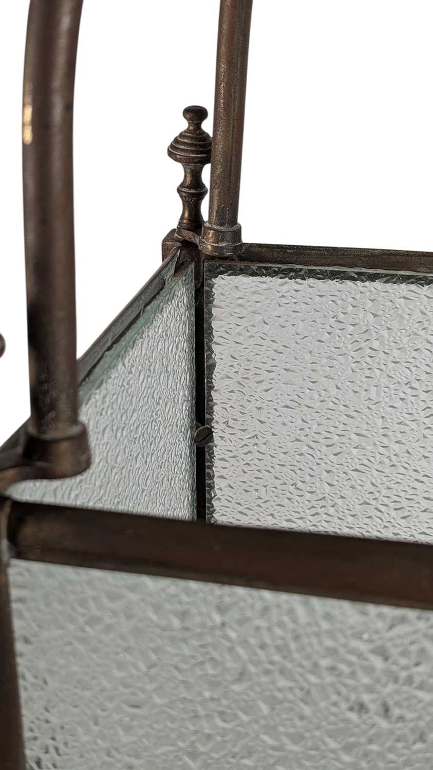 A large 19th century brass & glass lantern shade. Having textured glass sides, with brass frame. Raised on bun feet, with arched top and hanging hook atop.