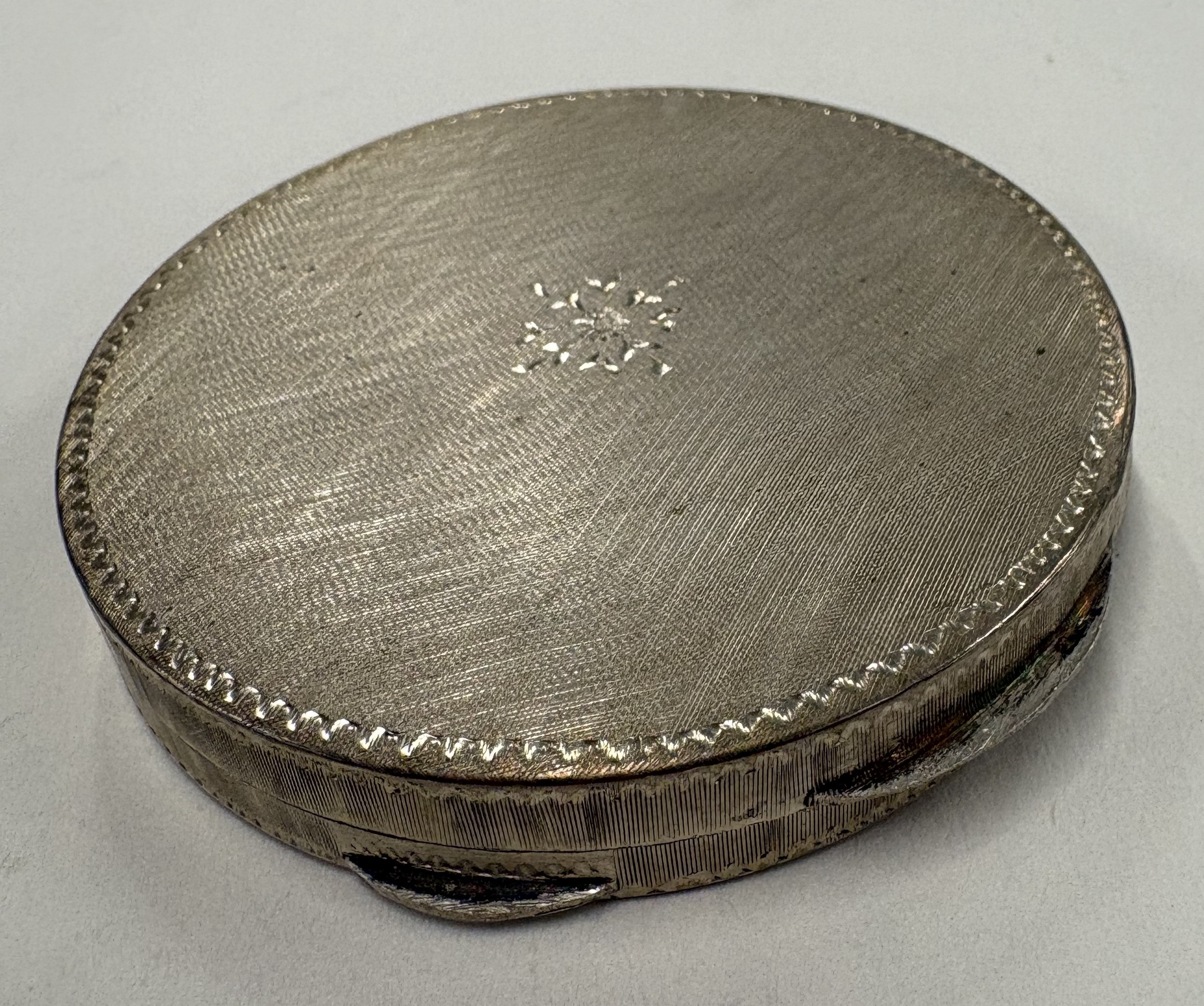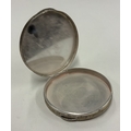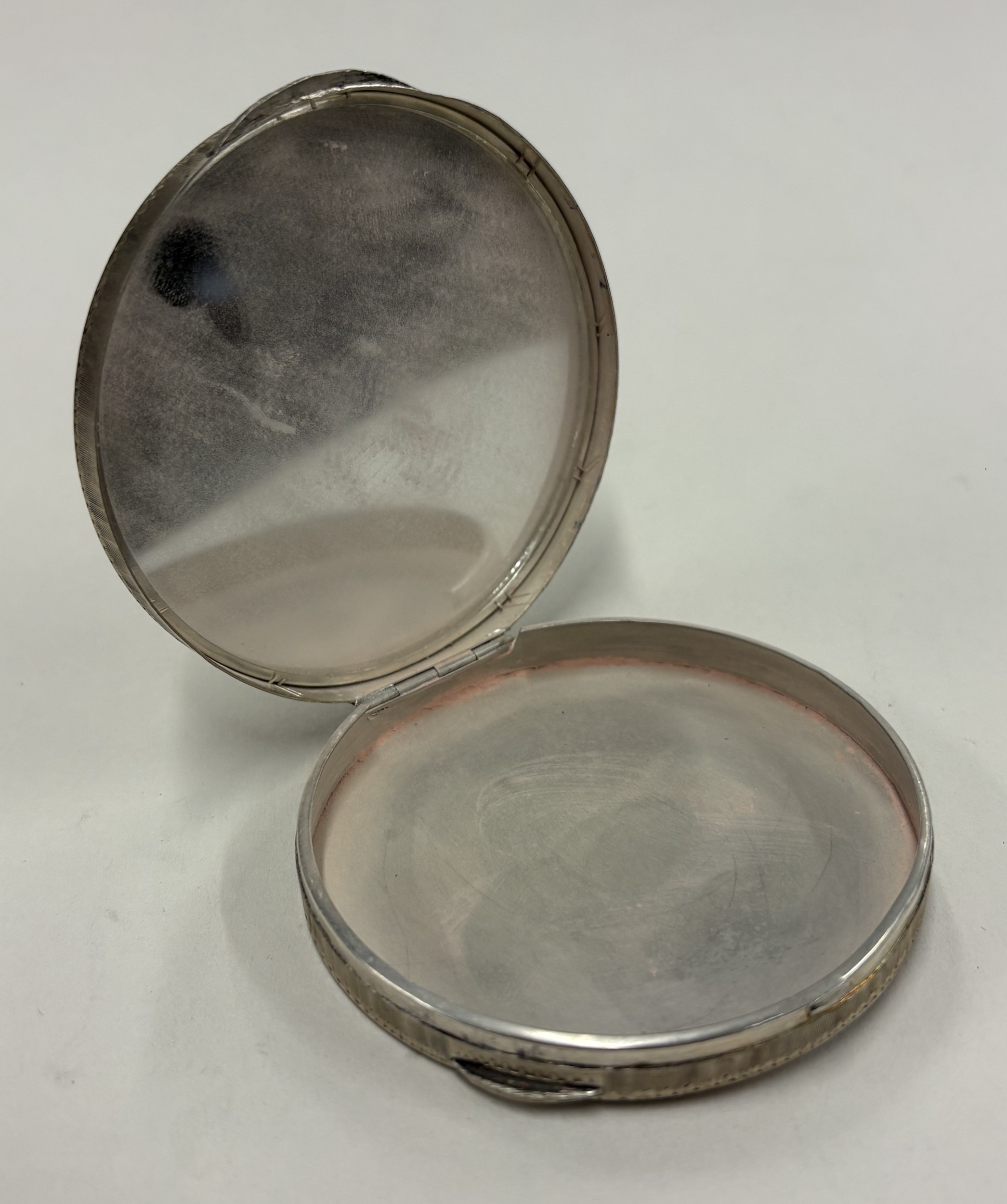 A silver-mounted compact with engraved decoration. Approx. 61 grams of gross weight. Est. £50 - £80.
