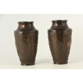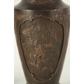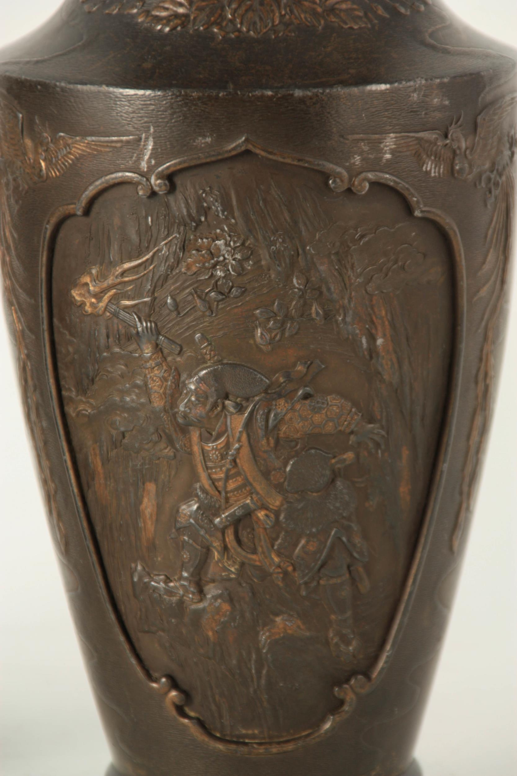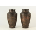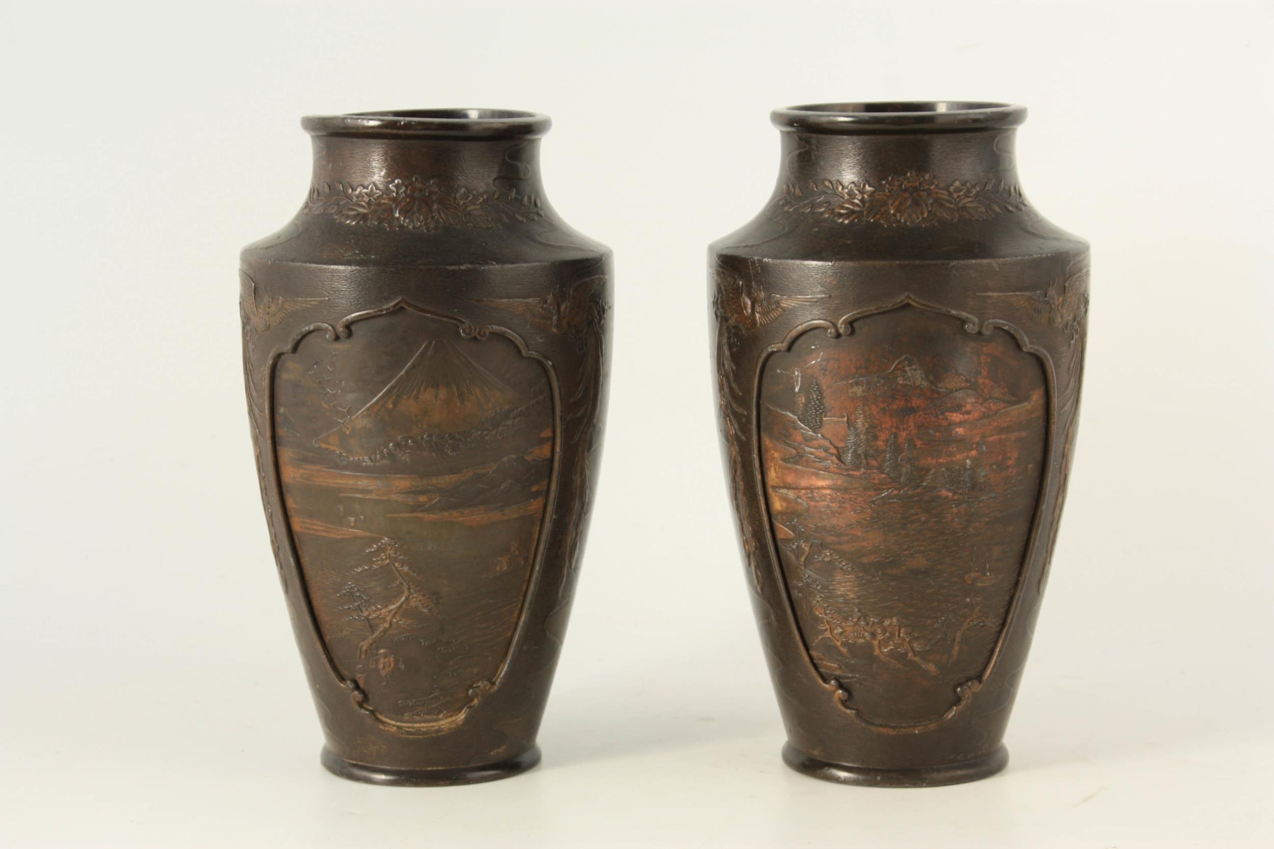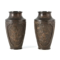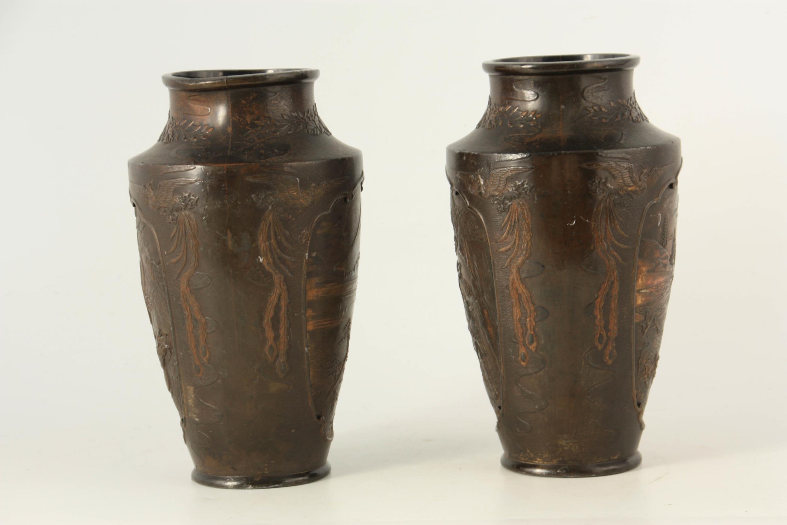 A PAIR OF JAPANESE BRONZE WHITE METAL PANELLED VASES with figural and landscape scenes surrounded by birds and floral decoration. (24cm high)