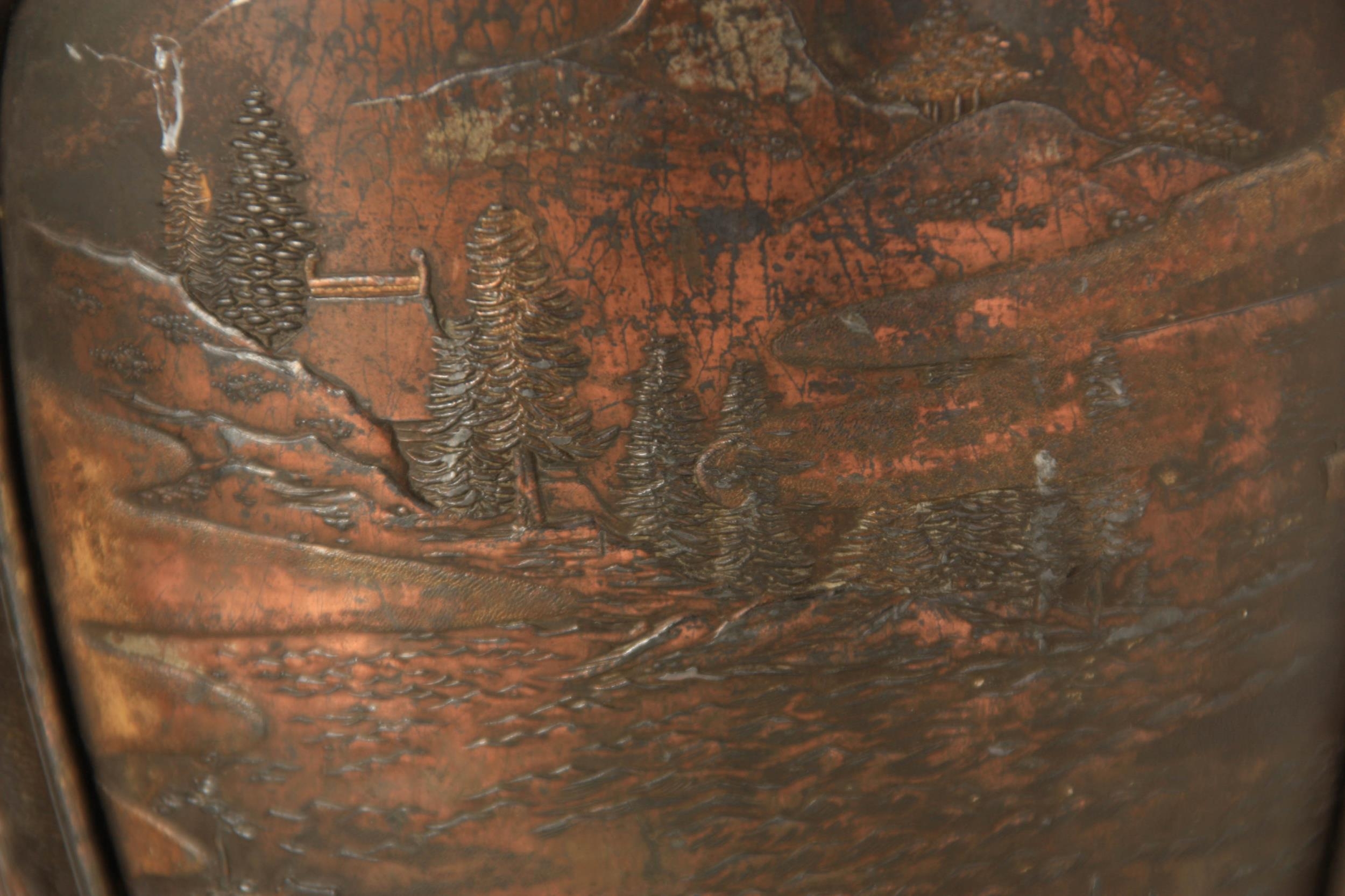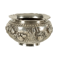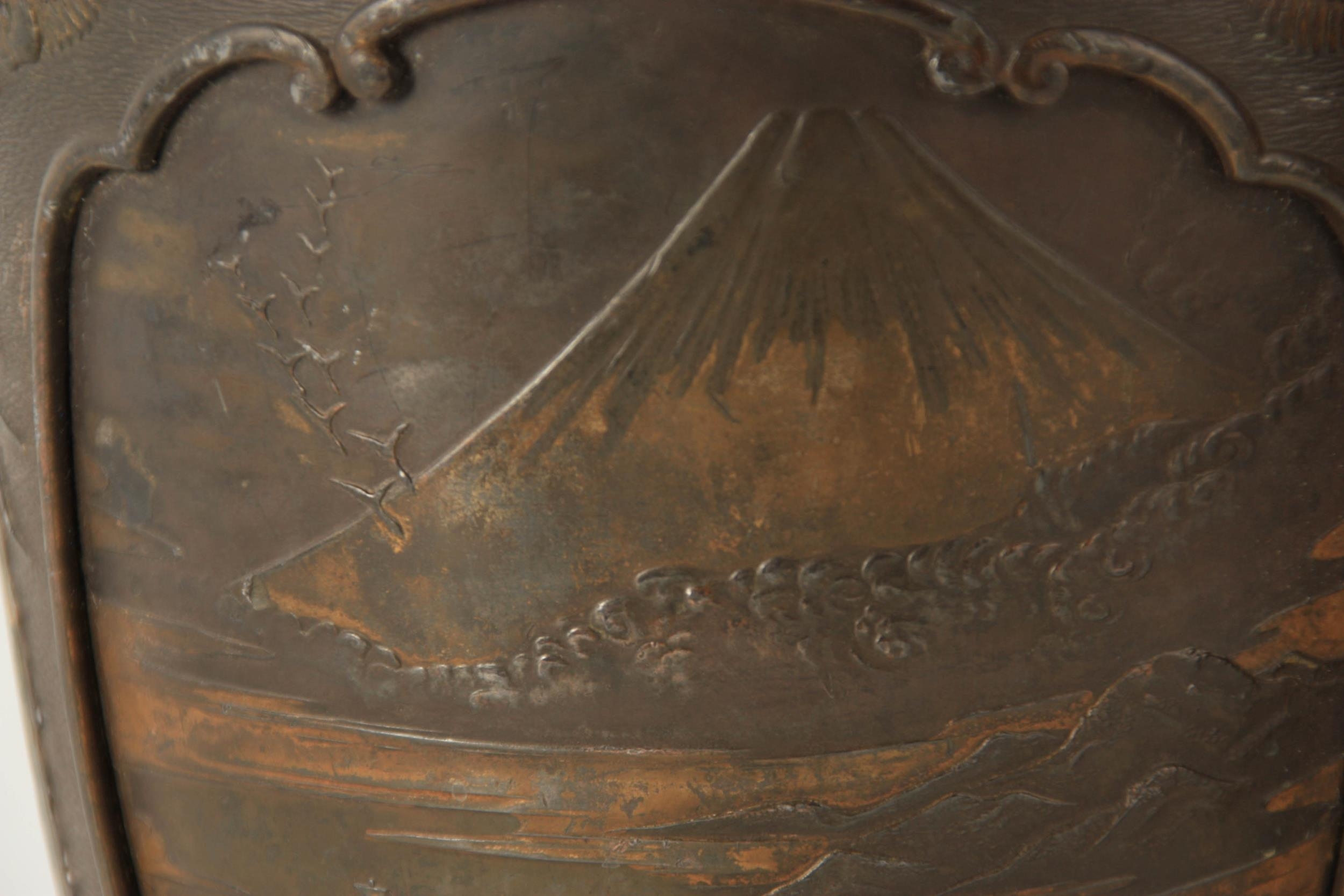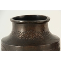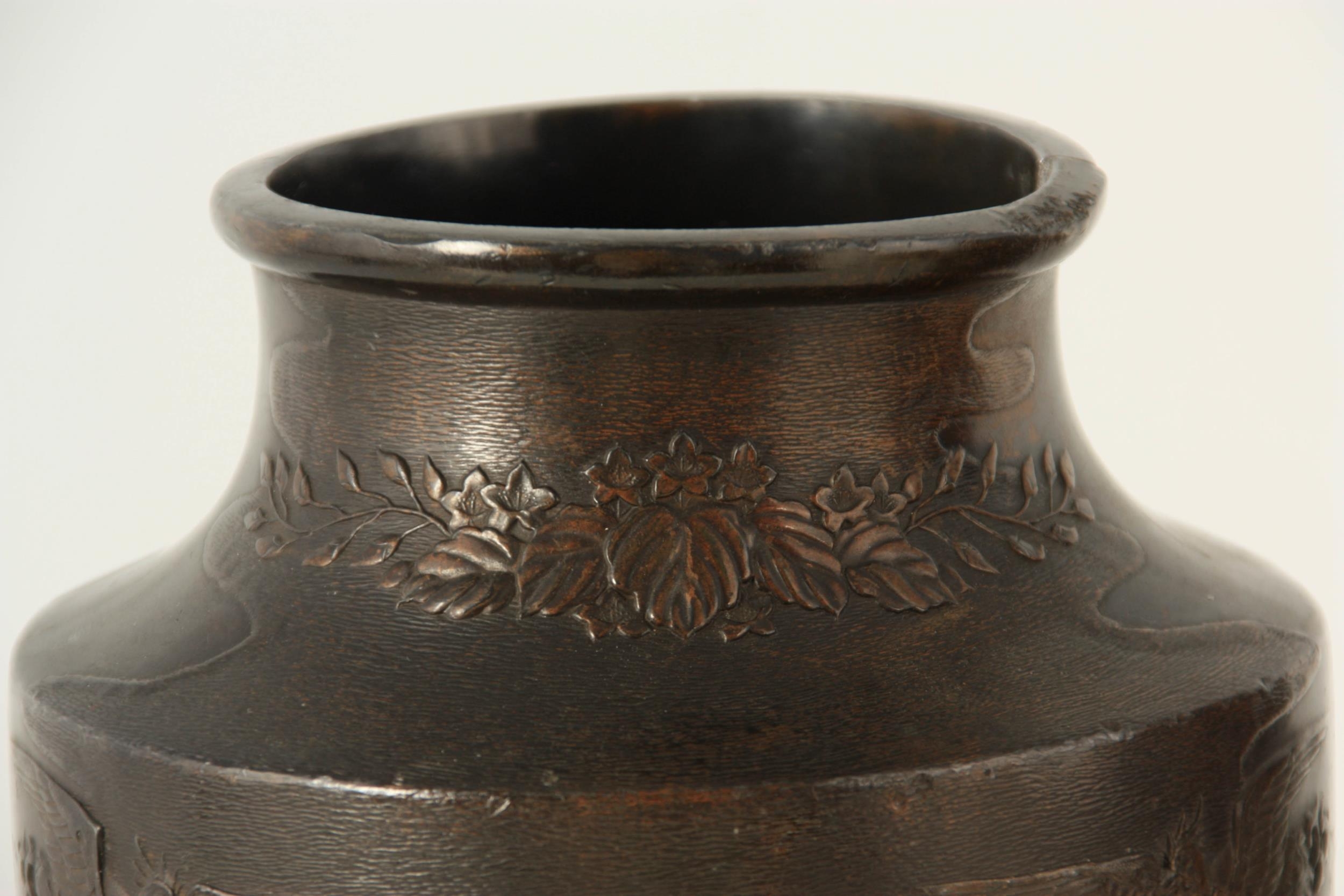 A PAIR OF JAPANESE BRONZE WHITE METAL PANELLED VASES with figural and landscape scenes surrounded by birds and floral decoration. (24cm high)