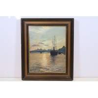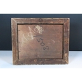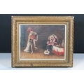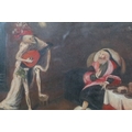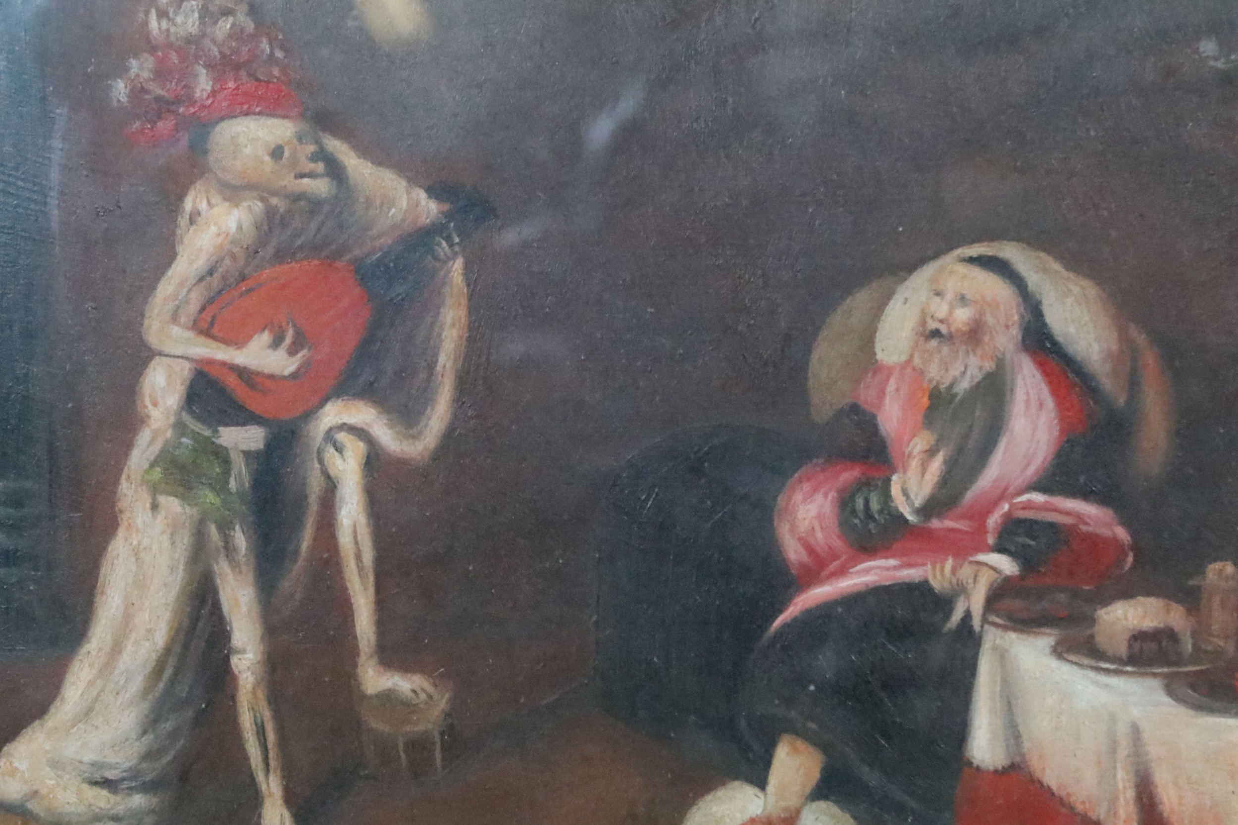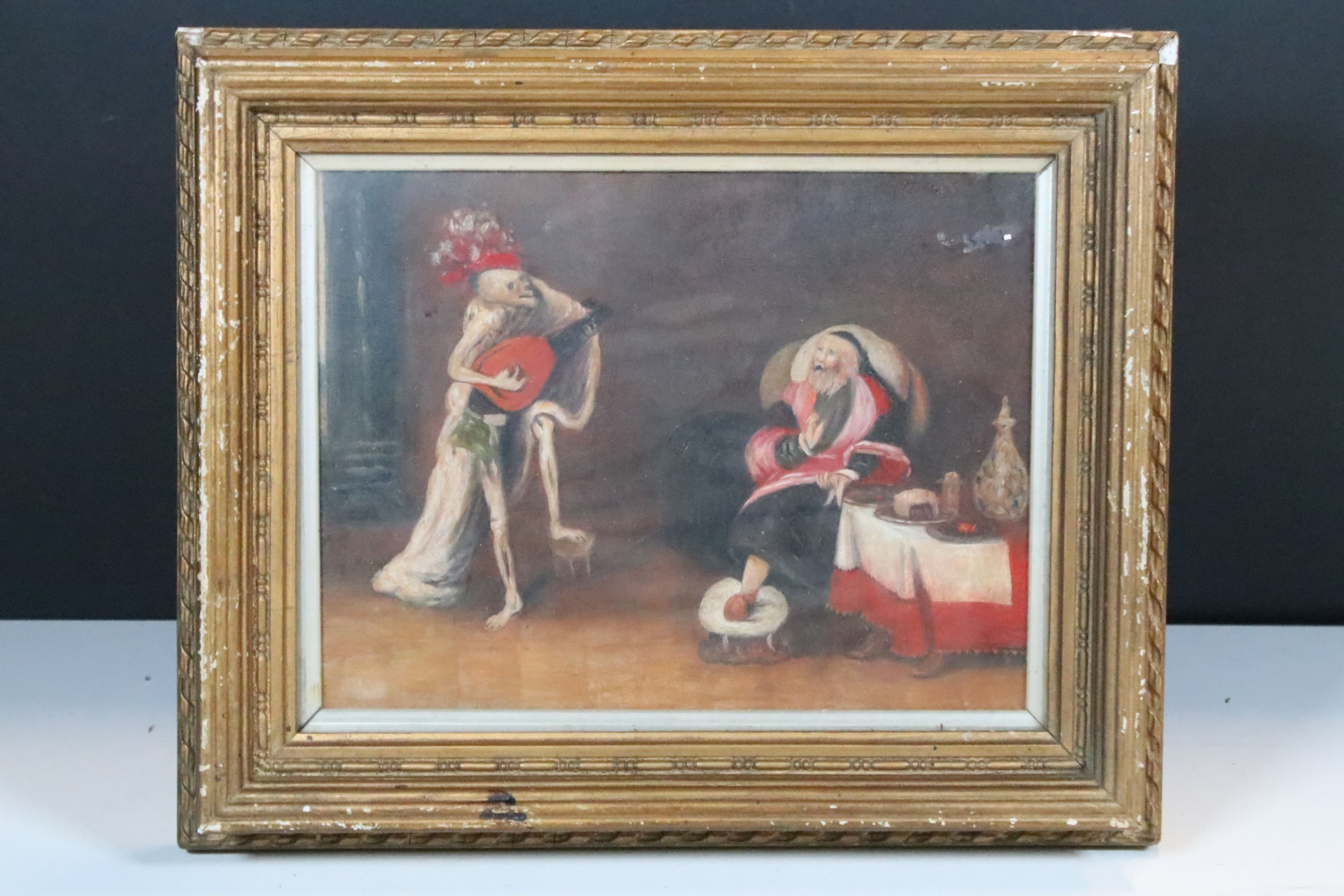 Allegoric scene with elderly man seated being serenaded by a skeletal figure, oil, 15.5 x 20cm, gilt framed and glazed