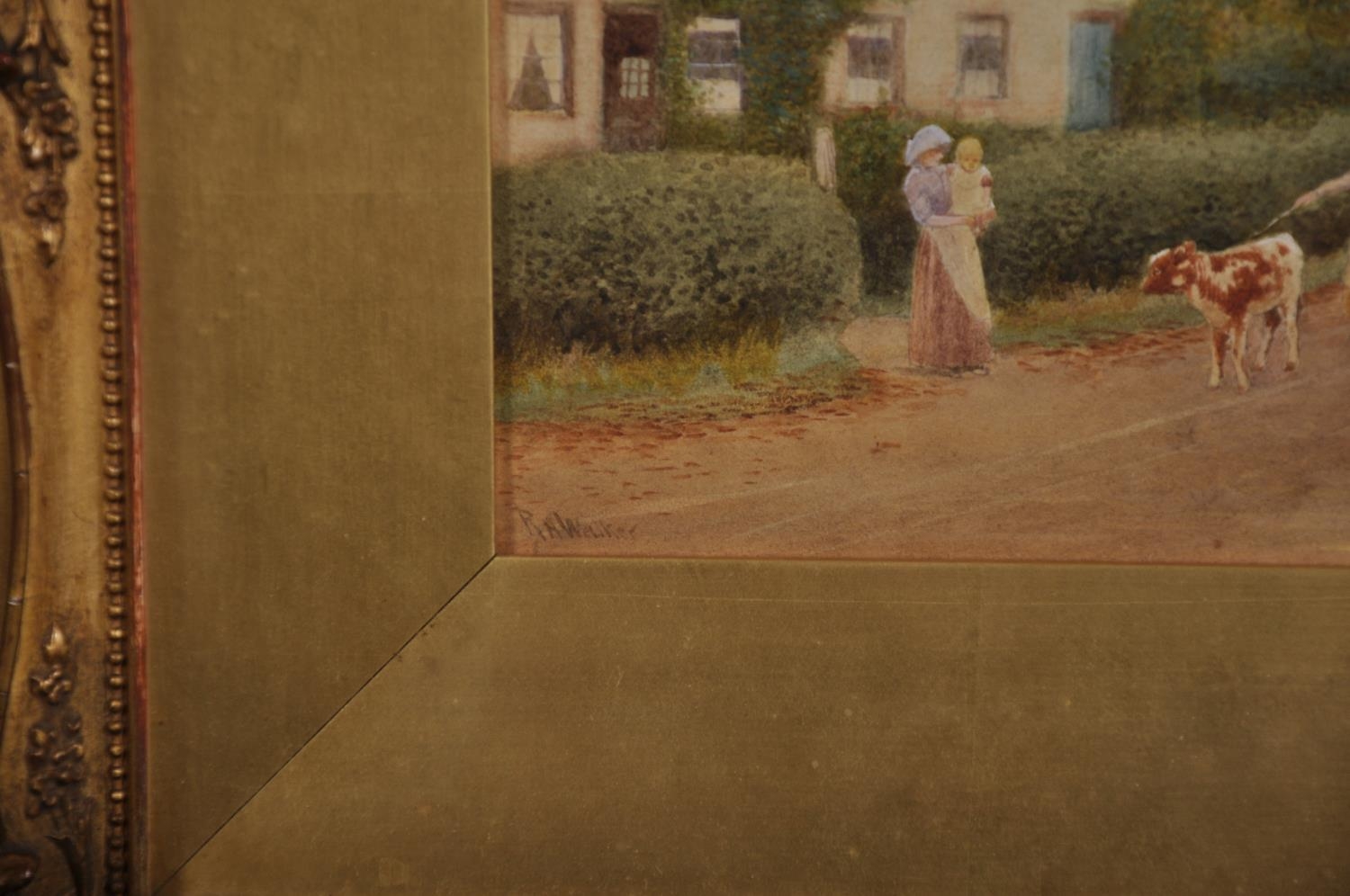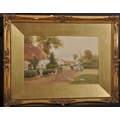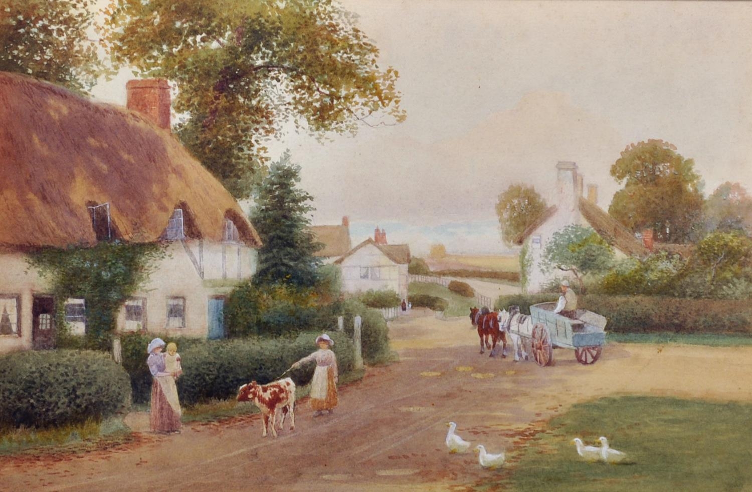 Robert Hollands Walker (act.1882-1922) British. “Princethorp, Warwick”, a Village Scene, with Figures, Horse and Cart and Ducks in the foreground, Watercolour, Signed, and Inscribed on the mount, 9” x 13.5” (23 x 34.3cm)