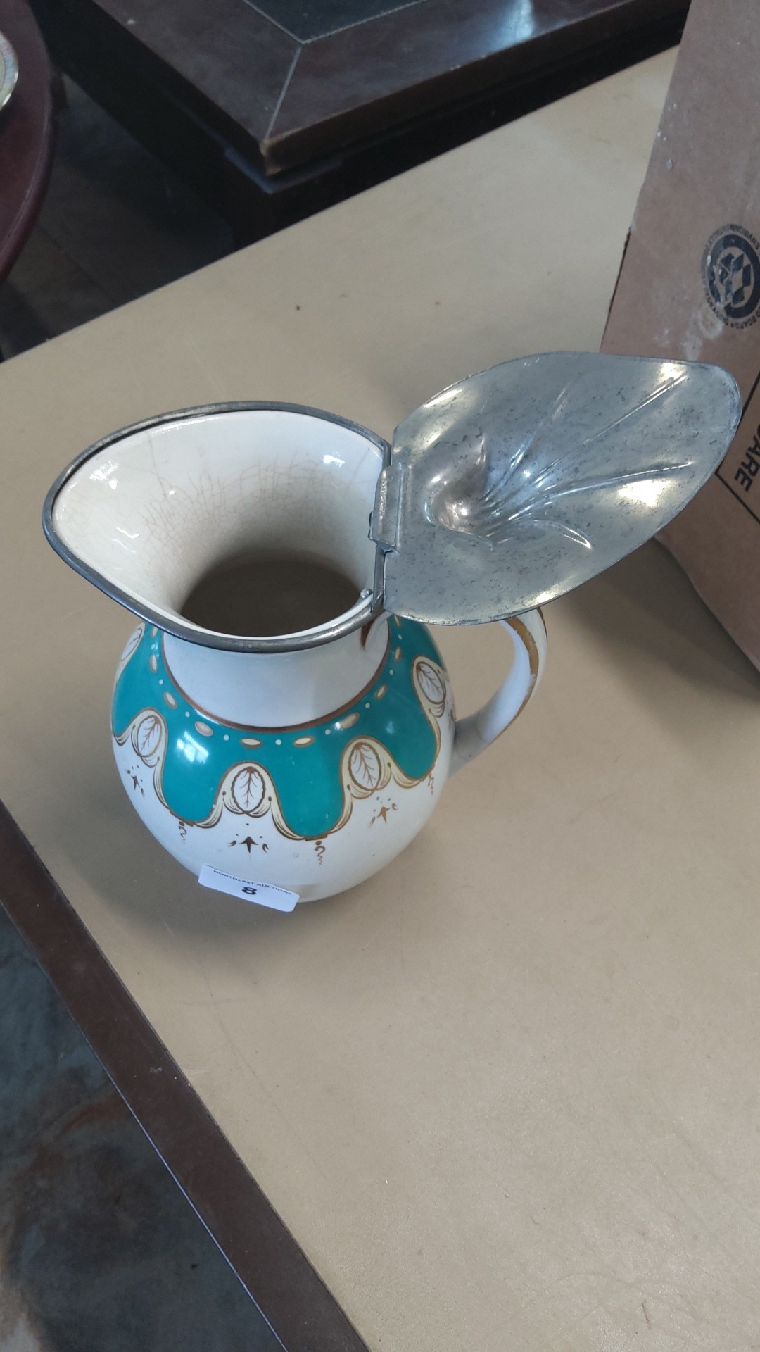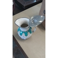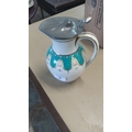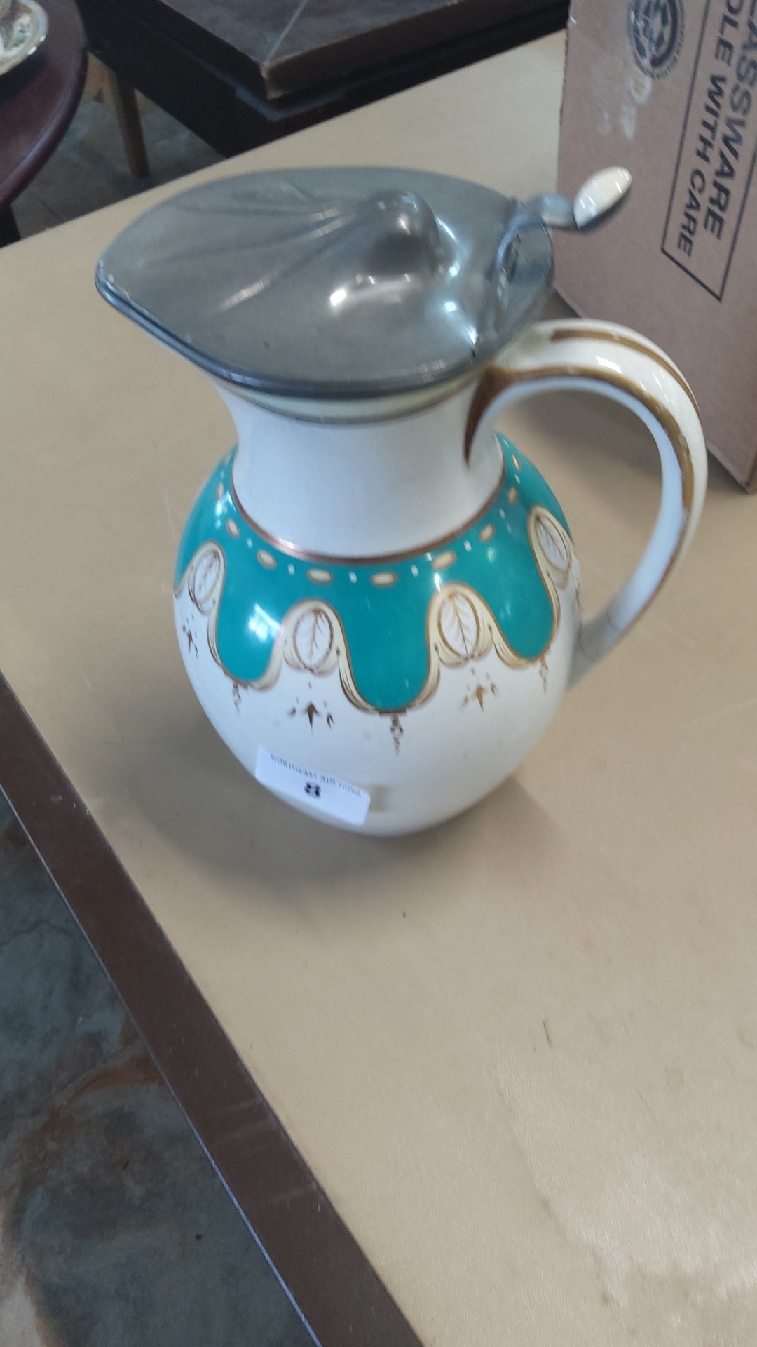 Late 19th/early 20th century earthenware hot-water jug, of globular form with loop handle, turquoise drapery-band and gilt foliate cartouches, fitted with a hinged pewter cover with thumbpiece and leaf-moulded finial.