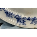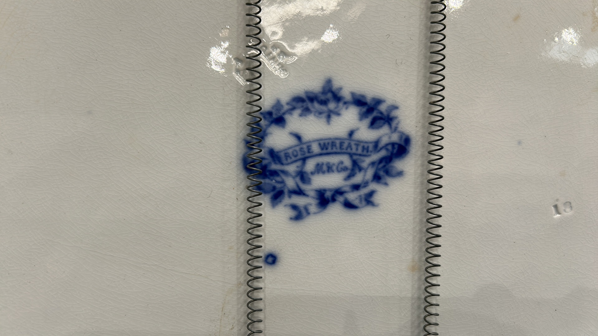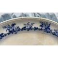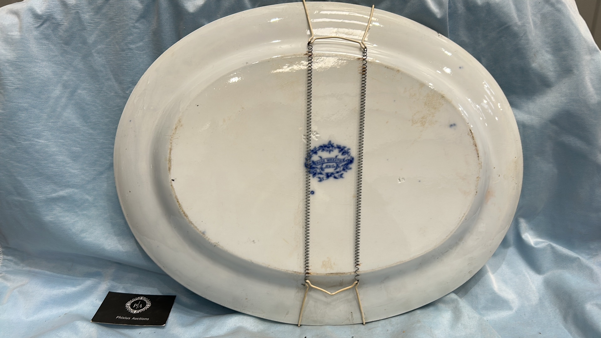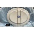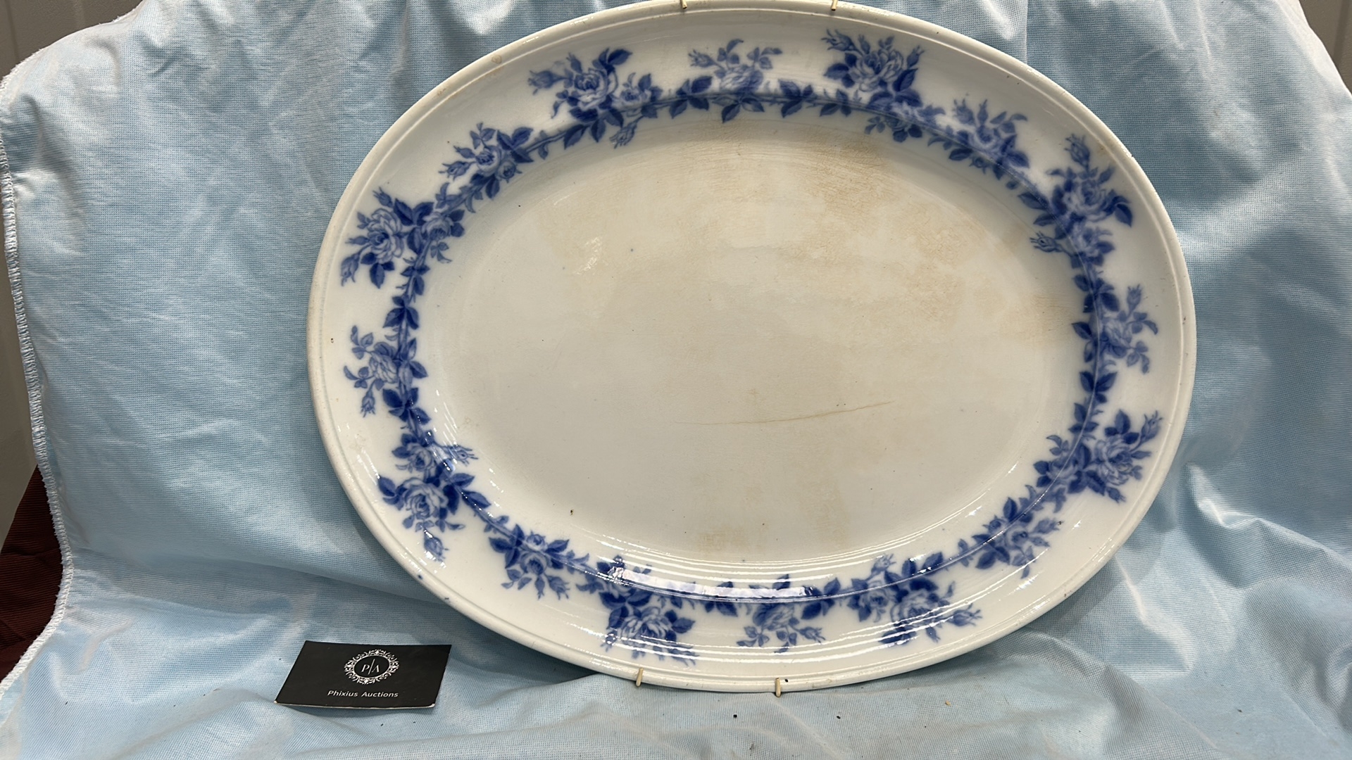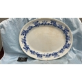 Large oval blue and white transfer-printed ironstone platter, ‘Rose Wreath’ pattern with rose garland border, backstamped “ROSE WREATH / M K & Co.”, late 19th century.