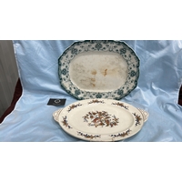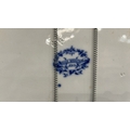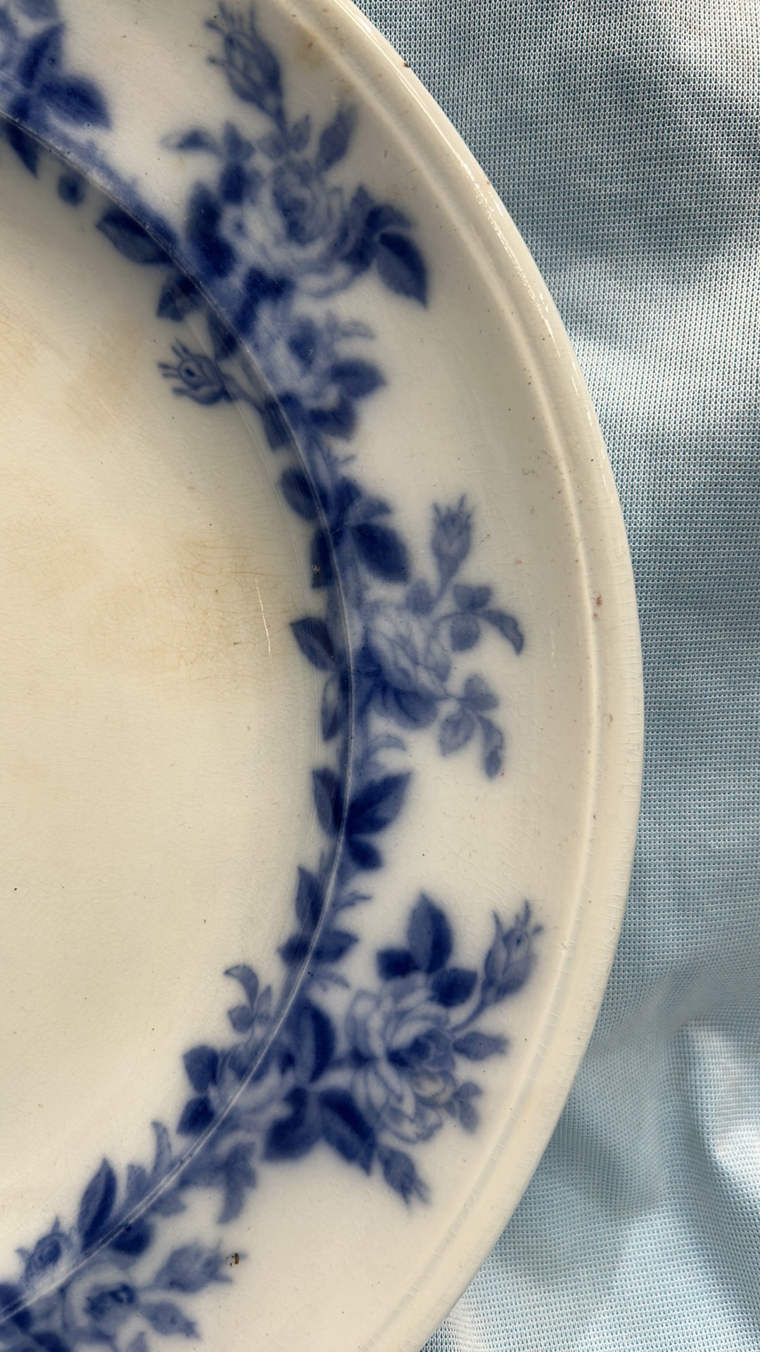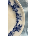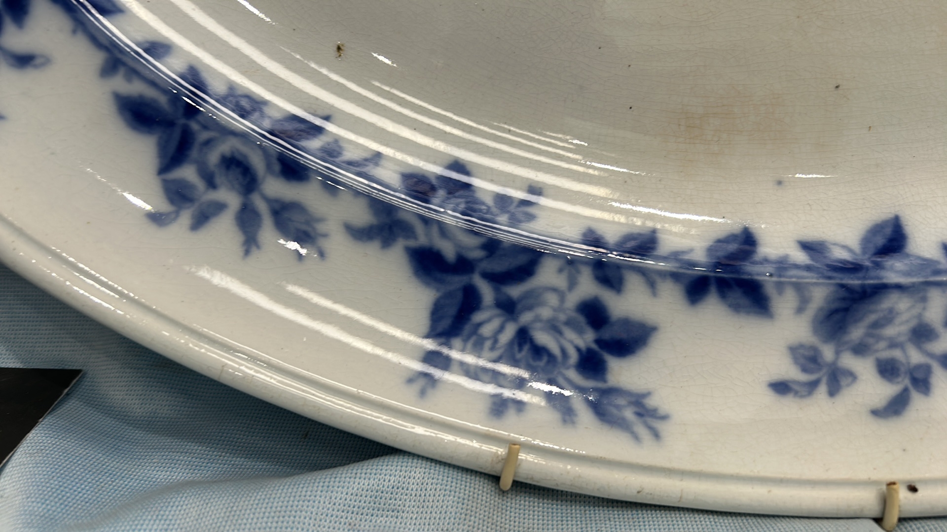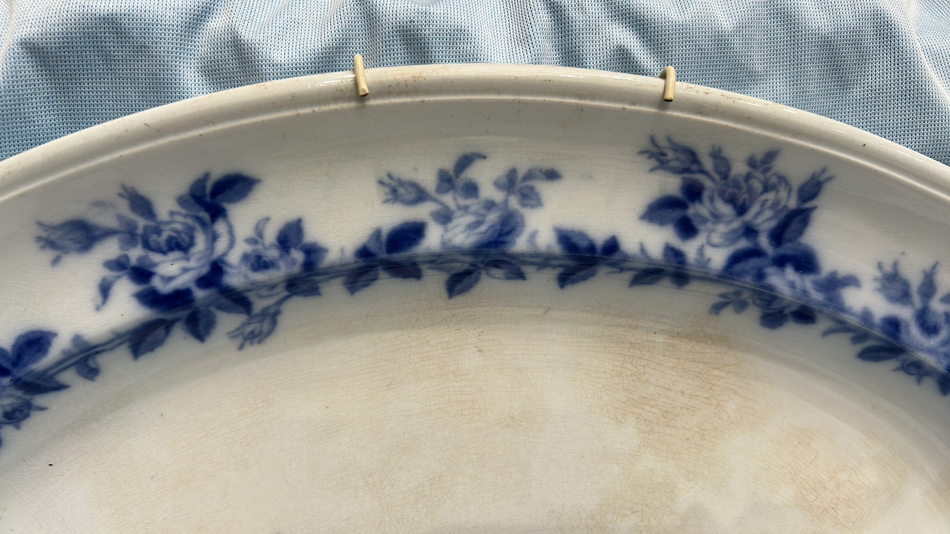 Large oval blue and white transfer-printed ironstone platter, ‘Rose Wreath’ pattern with rose garland border, backstamped “ROSE WREATH / M K & Co.”, late 19th century.