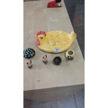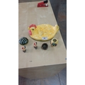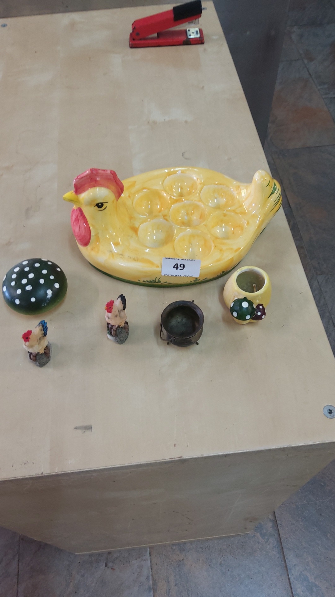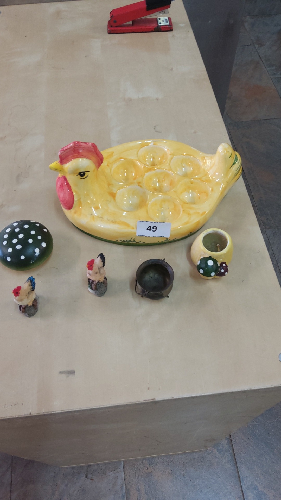 Six-piece lot comprising glazed ceramic hen-shaped devilled egg platter, spotted green mushroom paperweight, yellow mushroom-decorated votive cup, miniature cauldron, and two small rooster figurines.