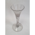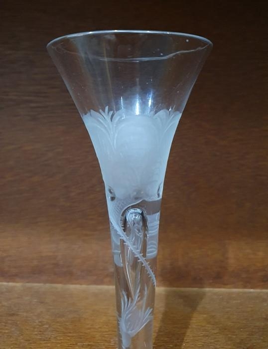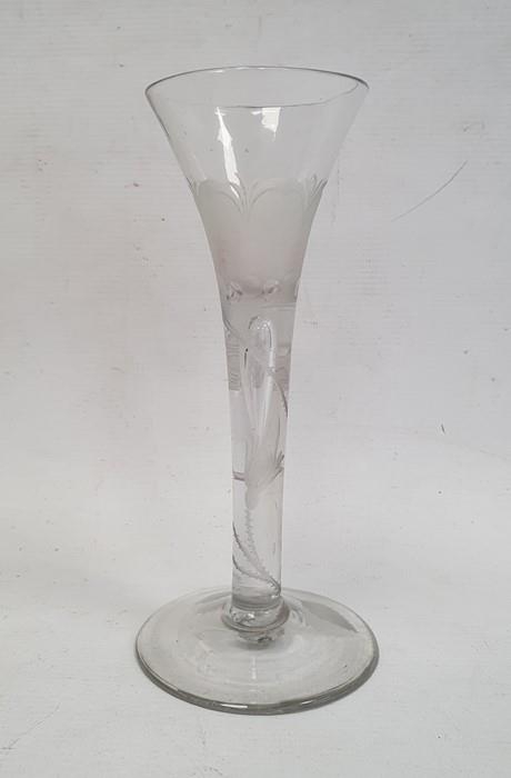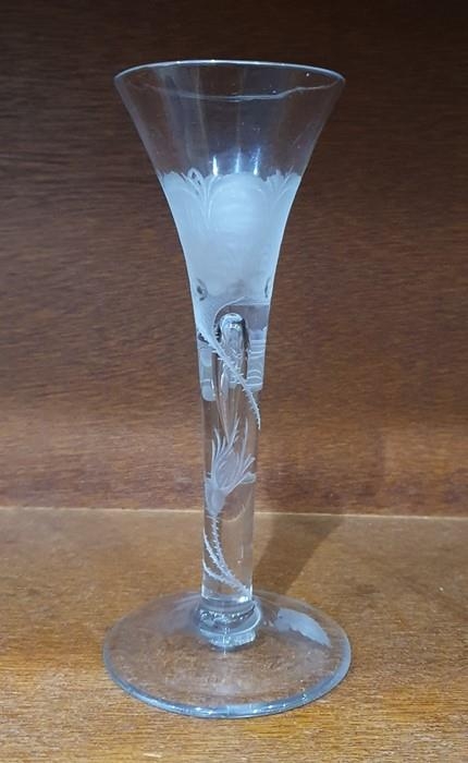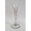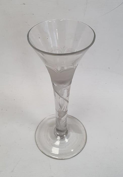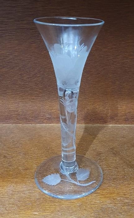 Mid 18th century wine glass with trumpet bowl, the stem and bowl engraved with Jacobite Rose decoration, 17.5cm high
