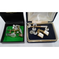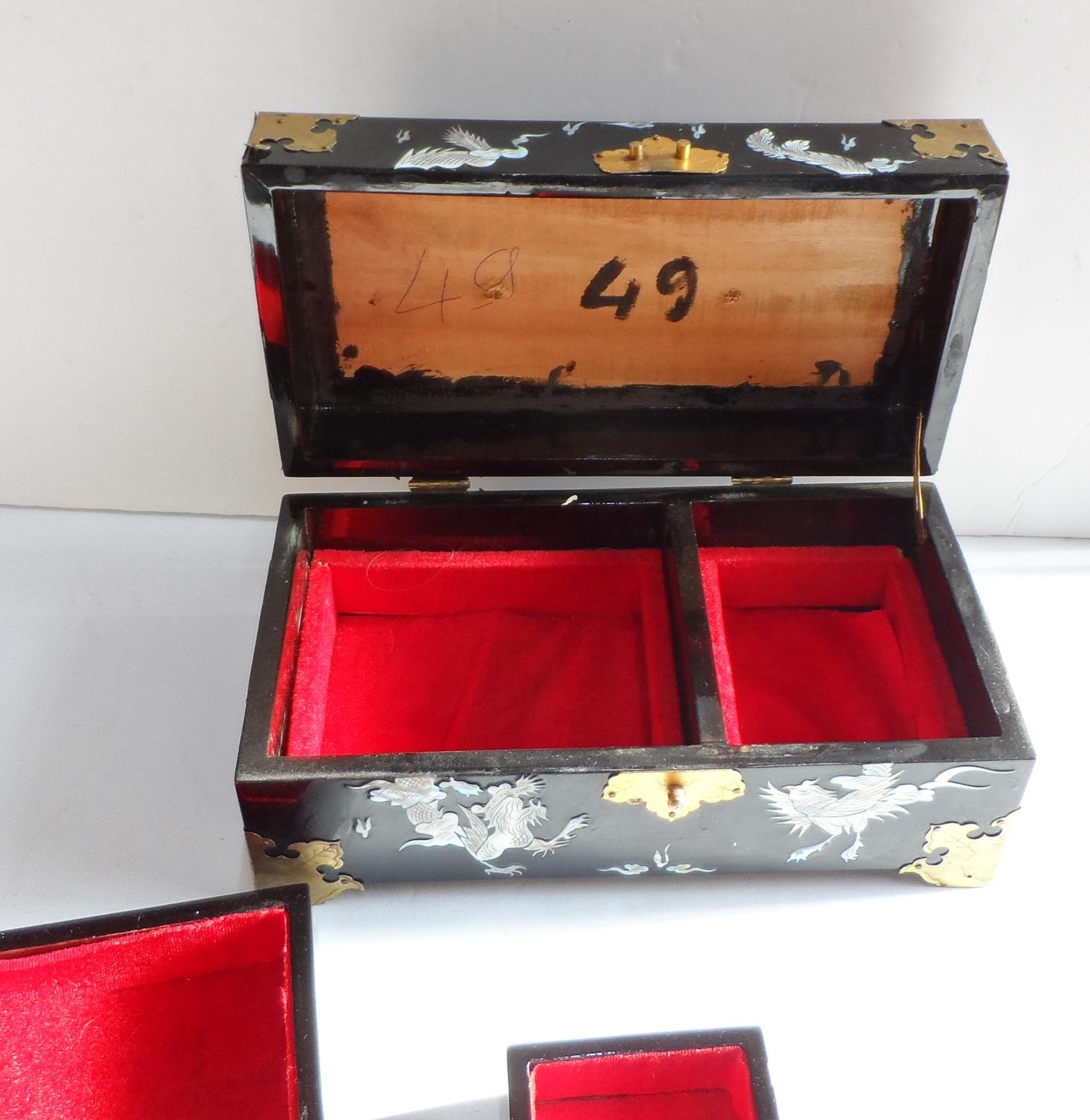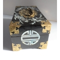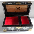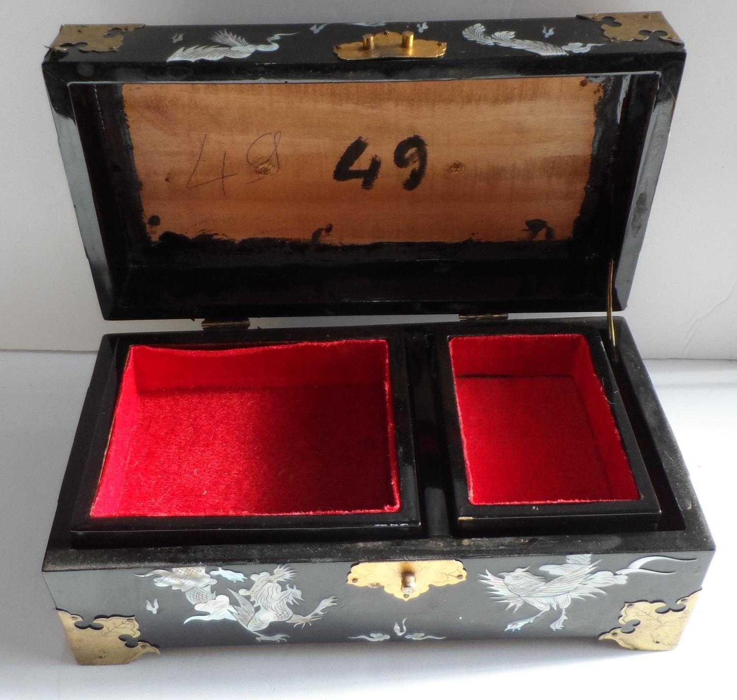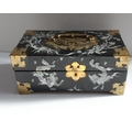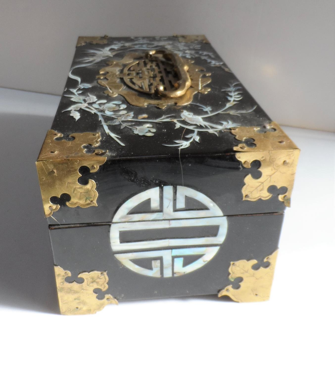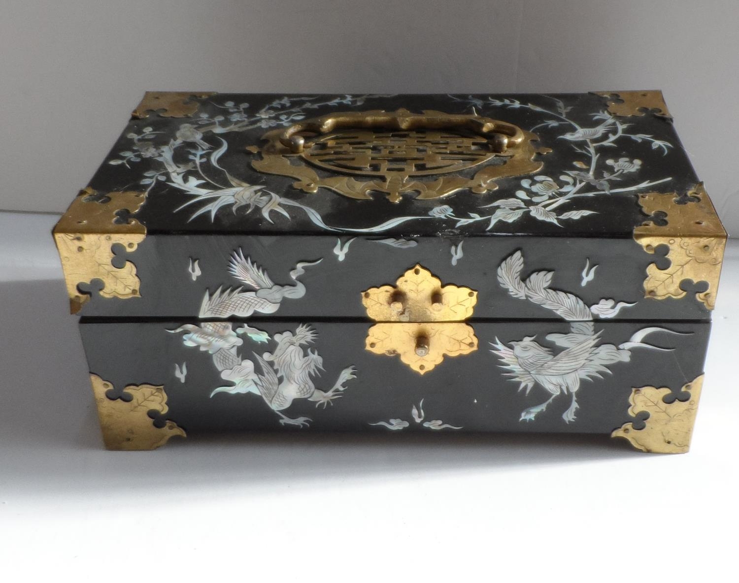 Chinese ebonised wood jewellery box with mother of pearly inlay & brass adournments